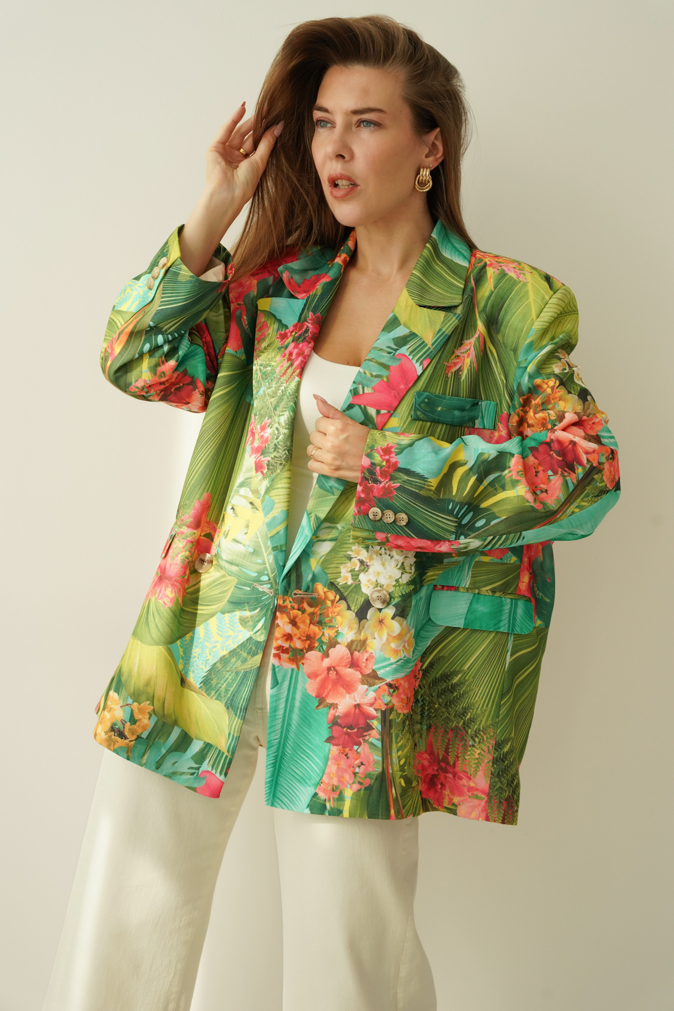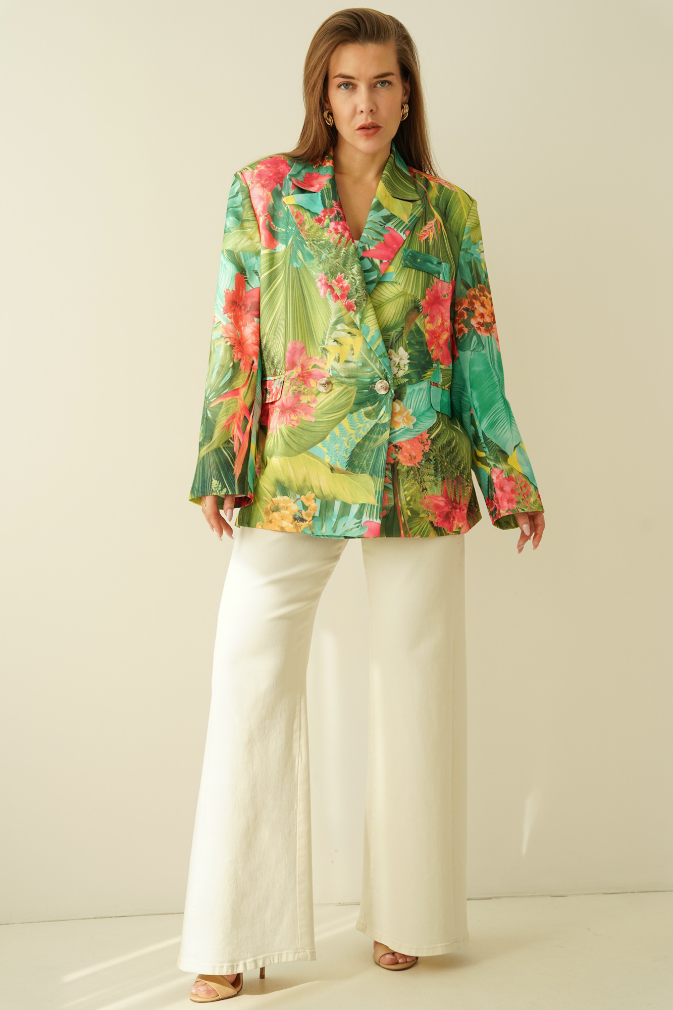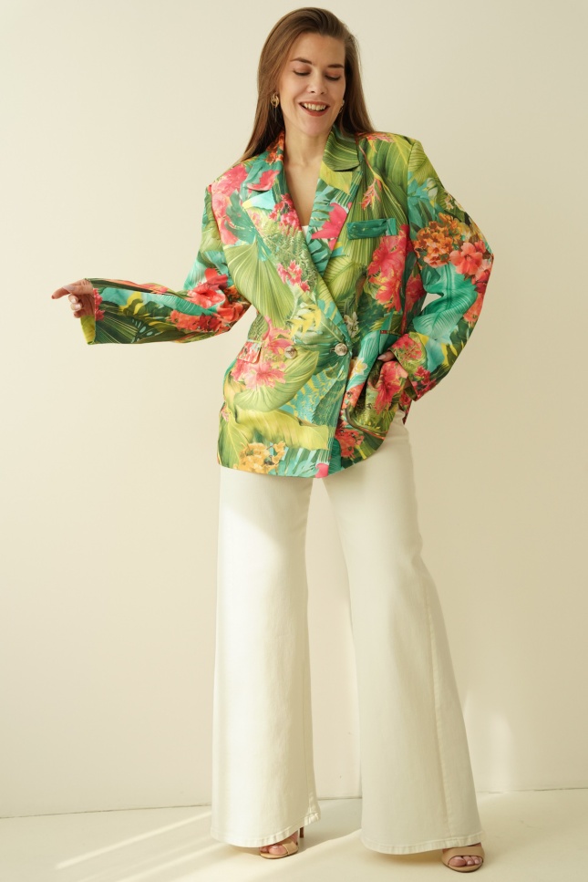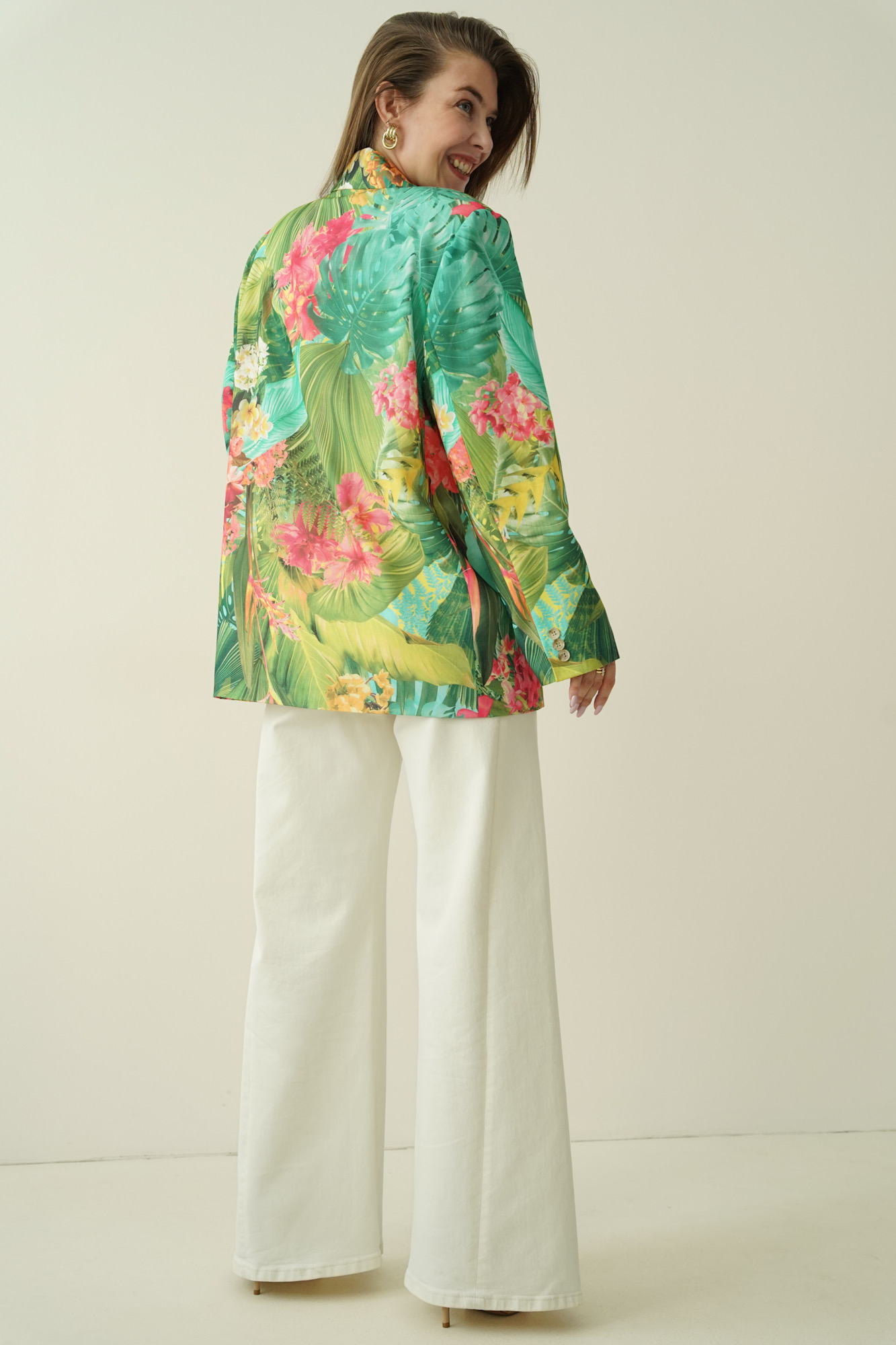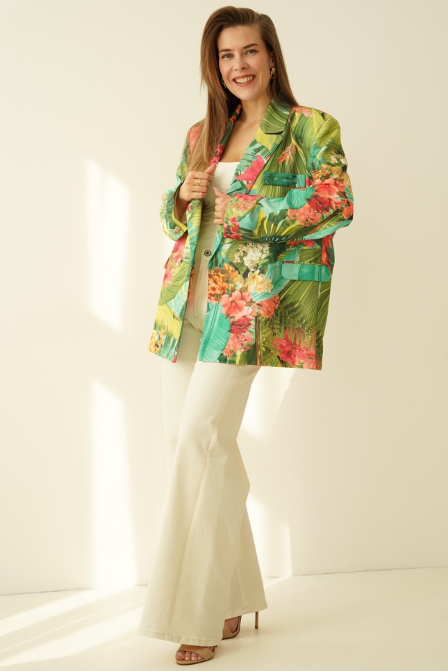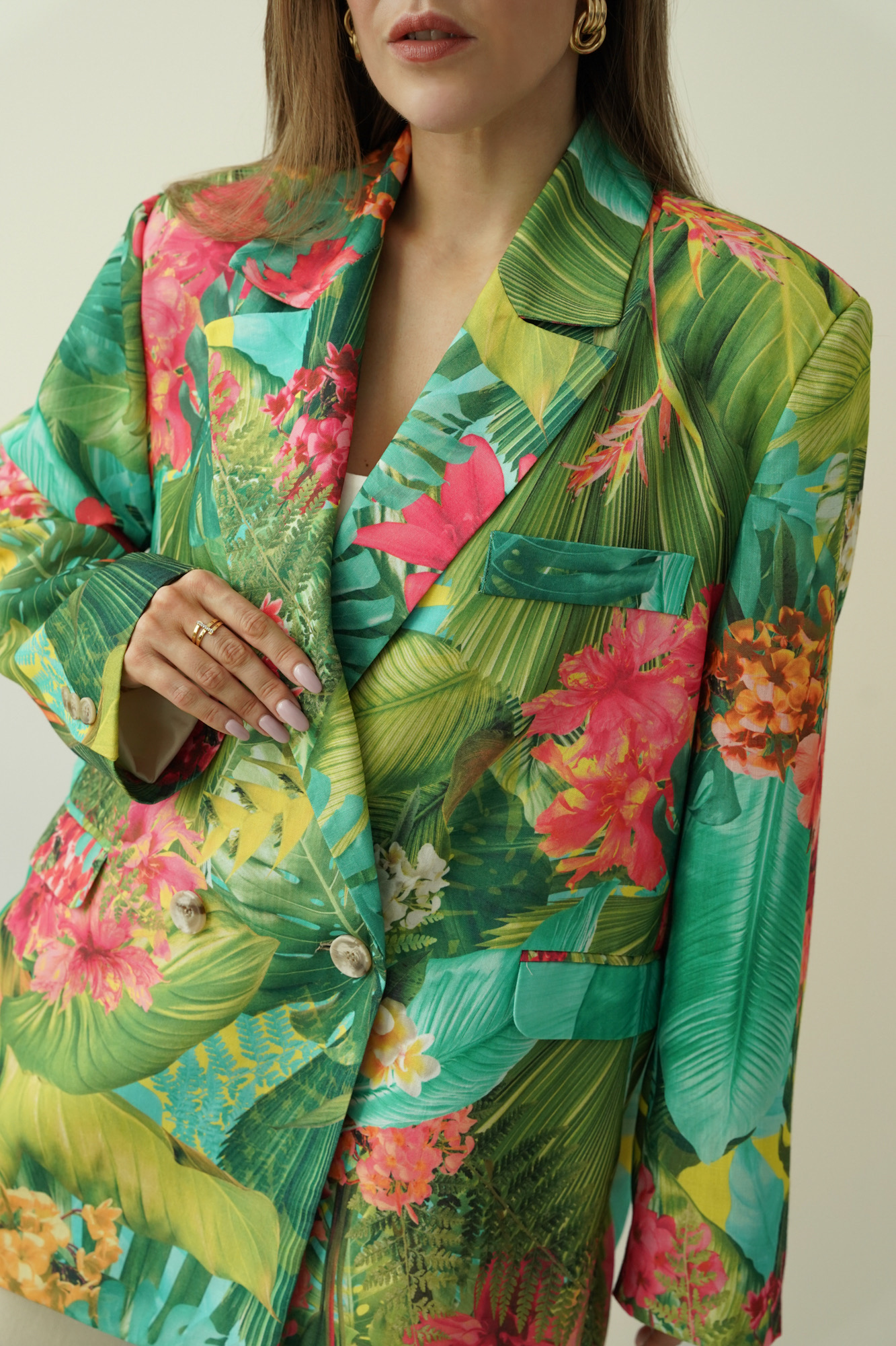 Discover the atmosphere of tropical elegance with our unique linen jacket. This double-breasted blazer surprises with an original tropical pattern maintained in juicy colors that attract the eye and exude positive energy. Made of airy, high-quality linen, it guarantees comfort even on warm days. Inside there is a delicate lining made of natural viscose, ensuring comfortable wear and breathability. Perfect for special occasions and stylish summer evenings.
