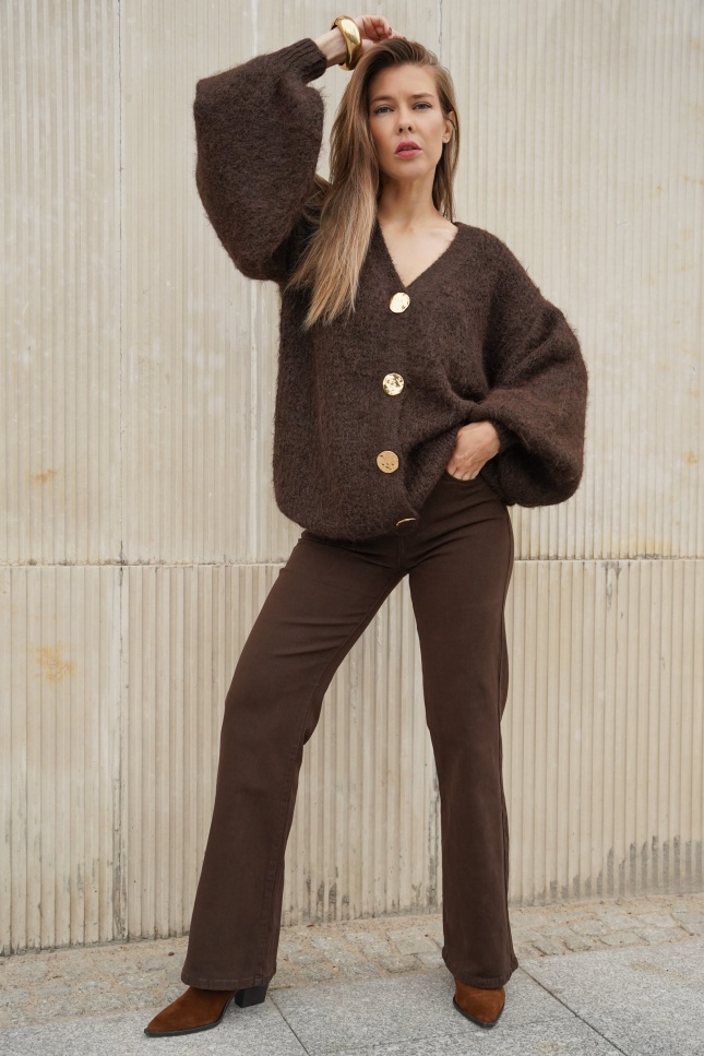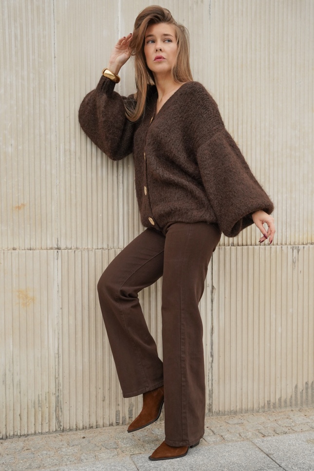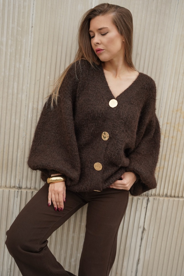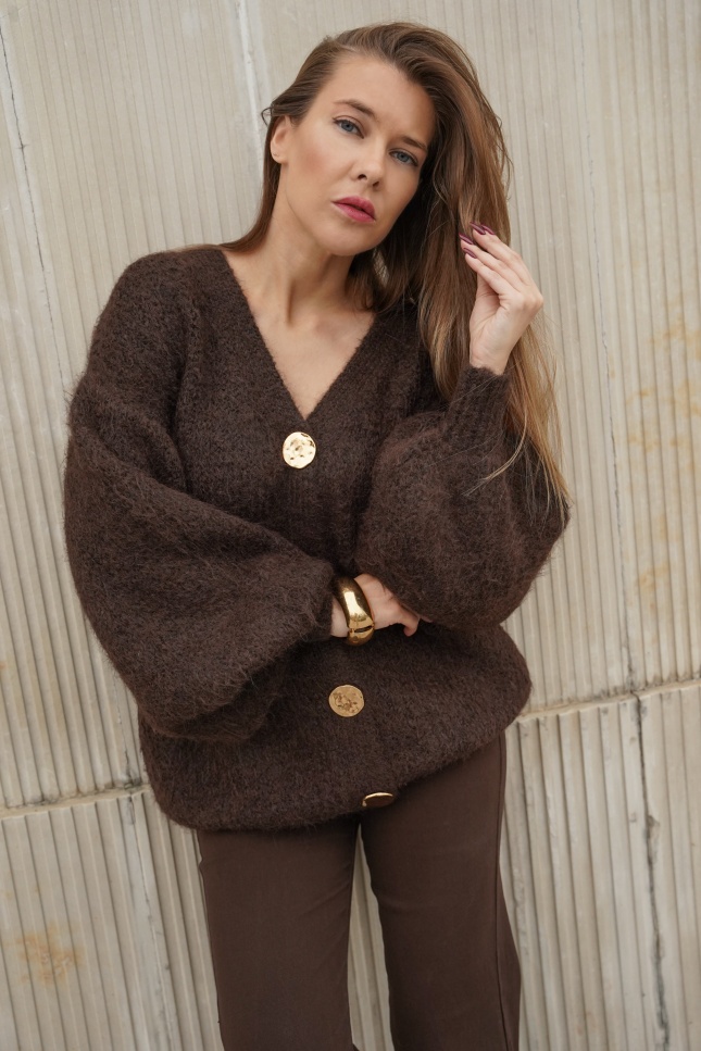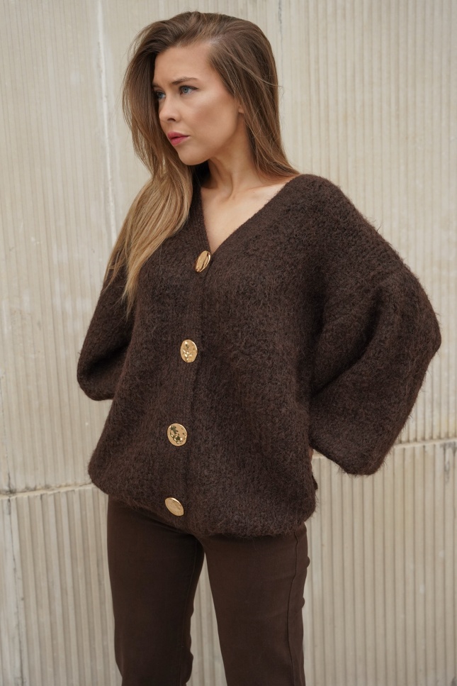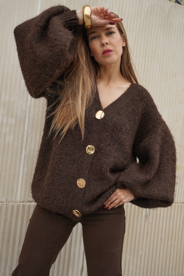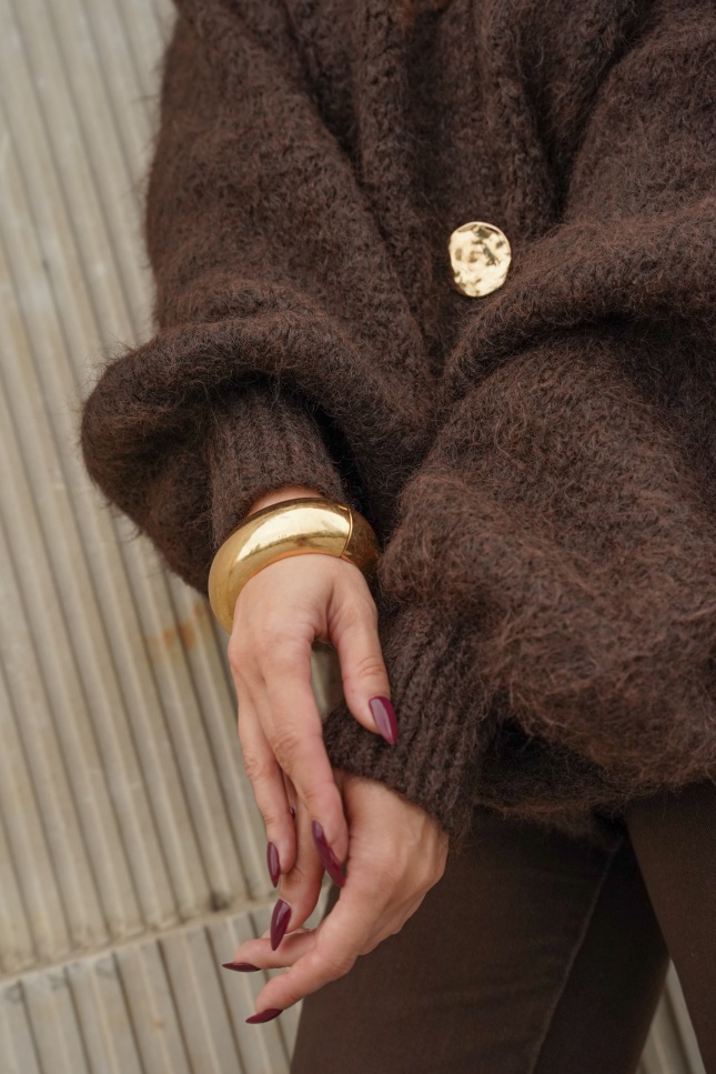 Made from a luxurious blend of super kid mohair and baby alpaca, knitted in a bouclé weave, it envelops you in lightness and premium texture. The loose fit and shorter length give it a contemporary feel, while the gold, artistic buttons serve as a jewelry detail. Perfect with jeans and a T-shirt or a satin dress, Étoile is a must-have for the AW 2025/26 season.
