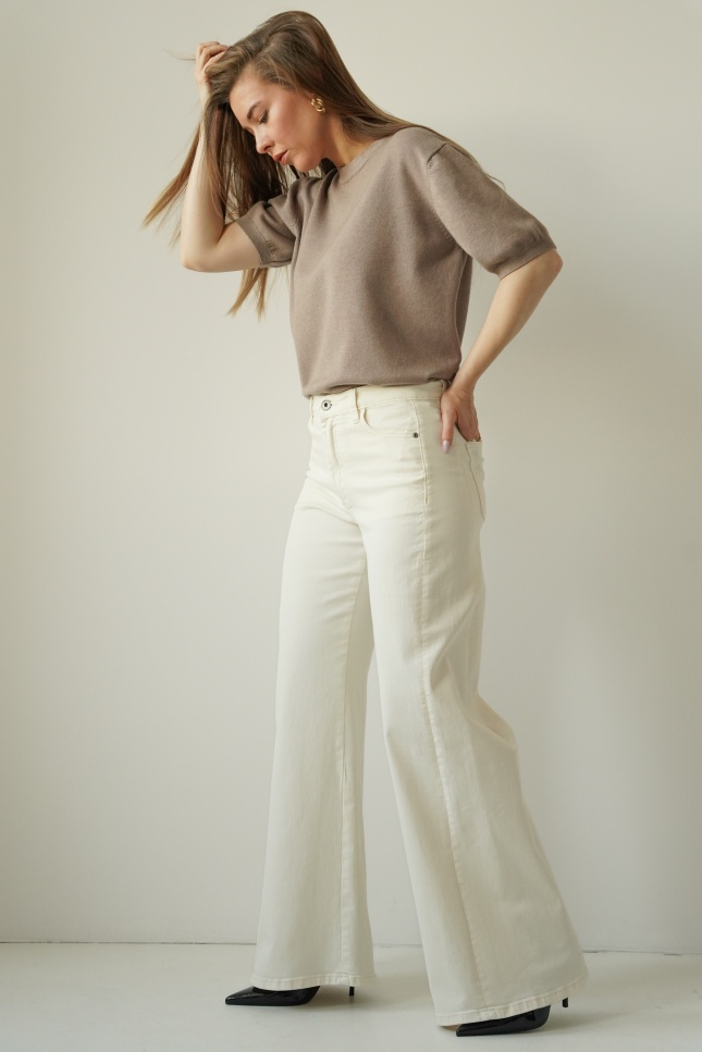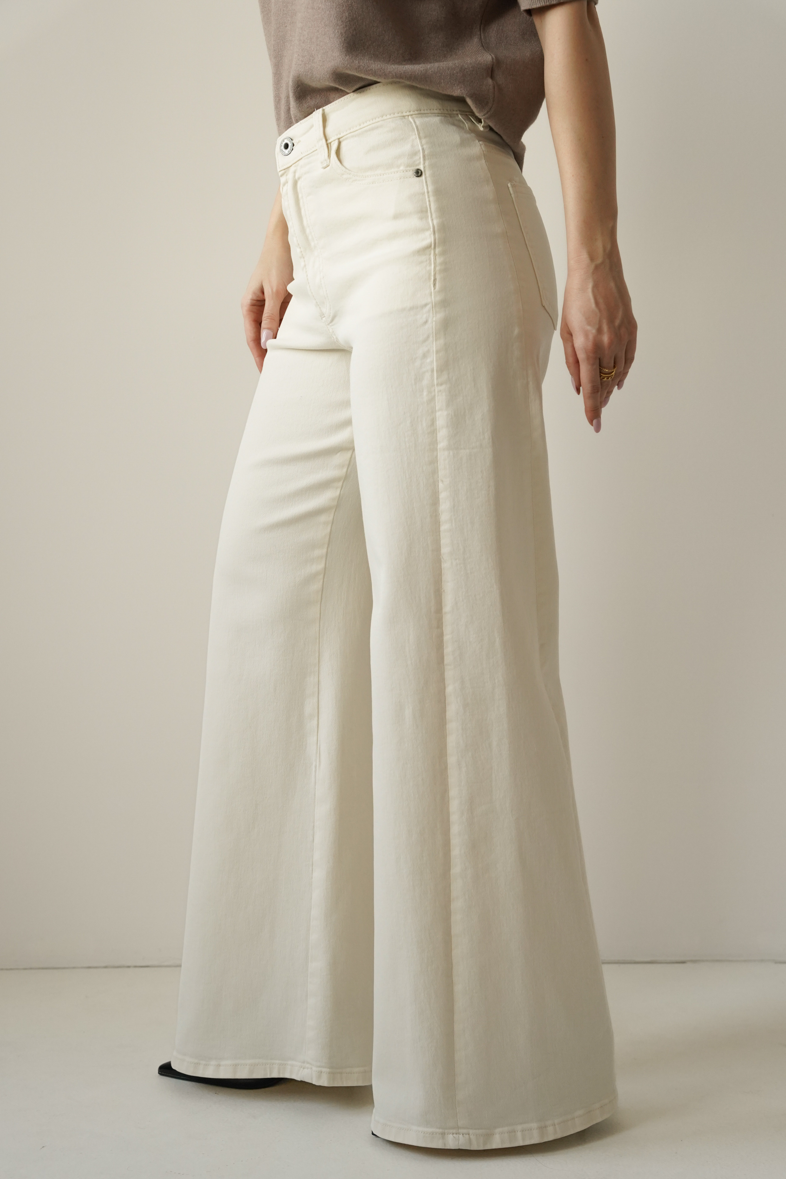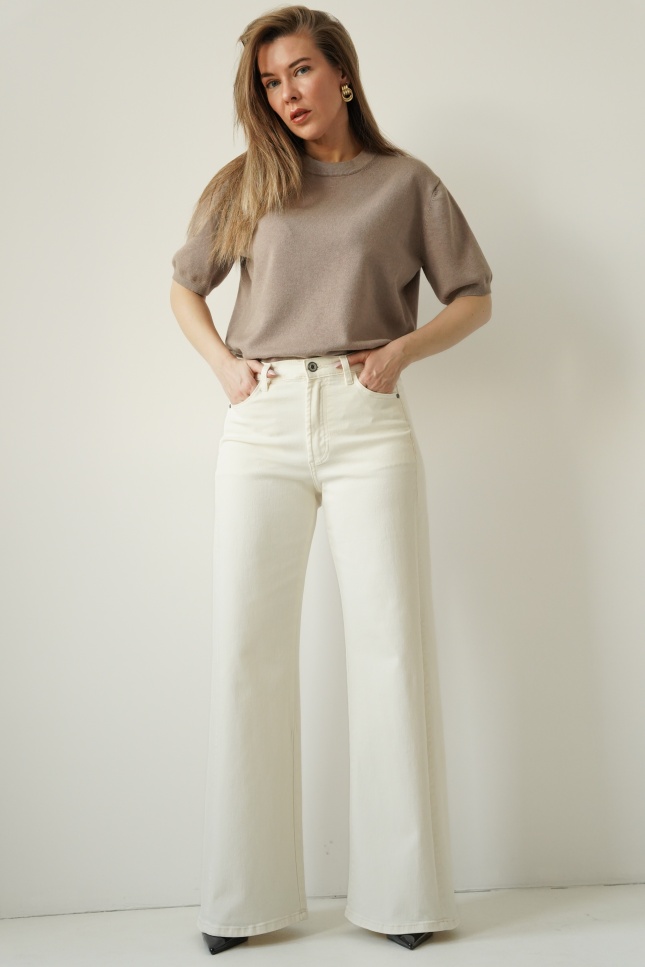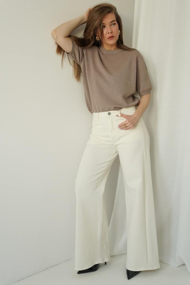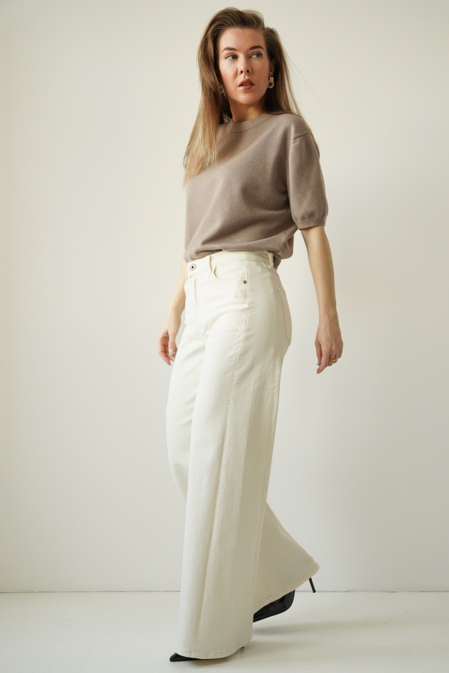 CLOUDE are wide-leg jeans made of high-quality cotton in a fashionable cloud dancer shade. Straight, wide legs, a classic button and zip fastening, and a minimalist design make them a timeless choice for everyday wear and more sophisticated outfits.