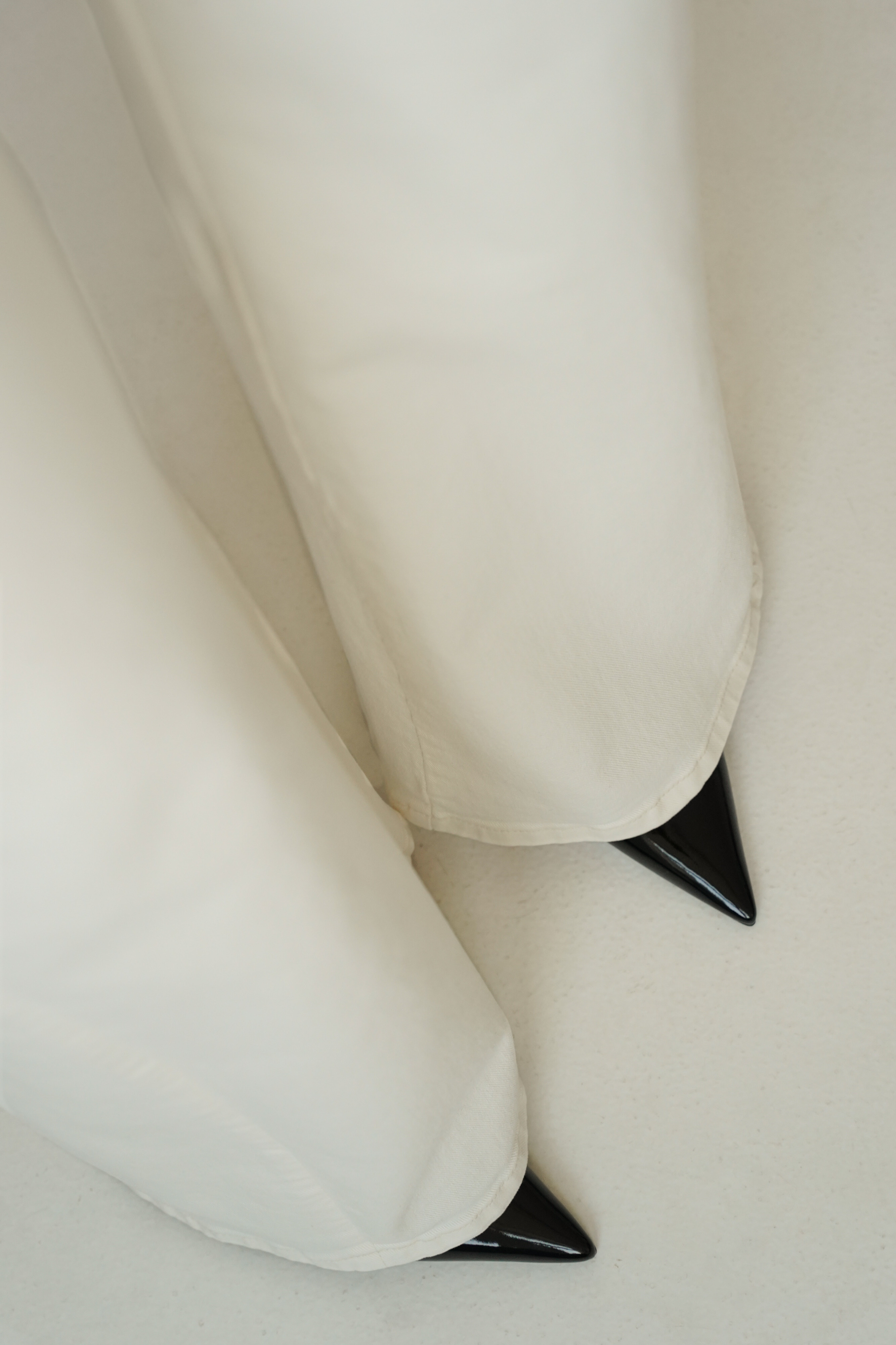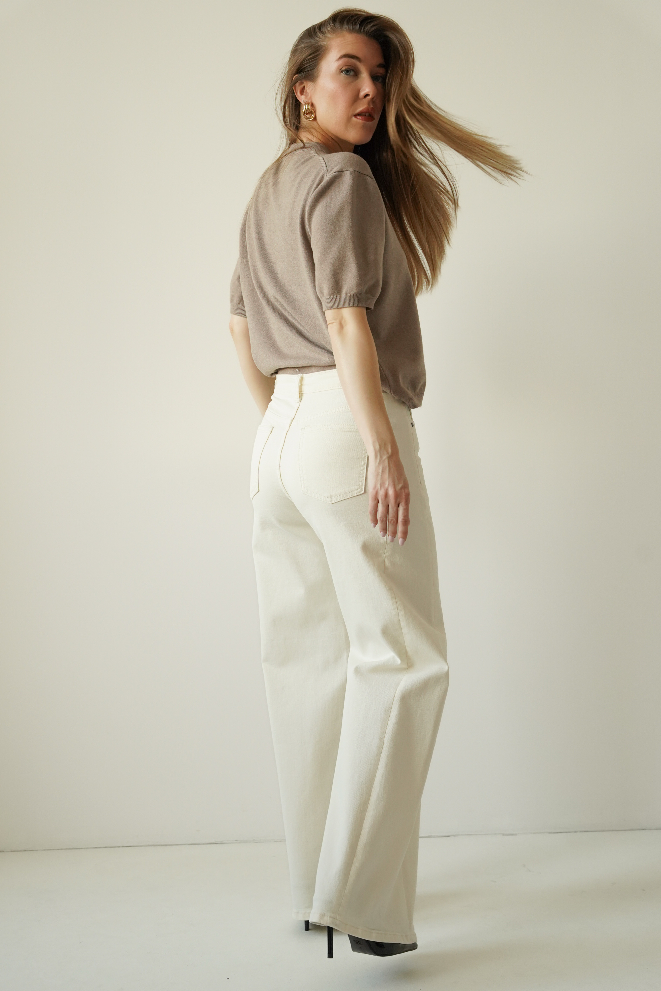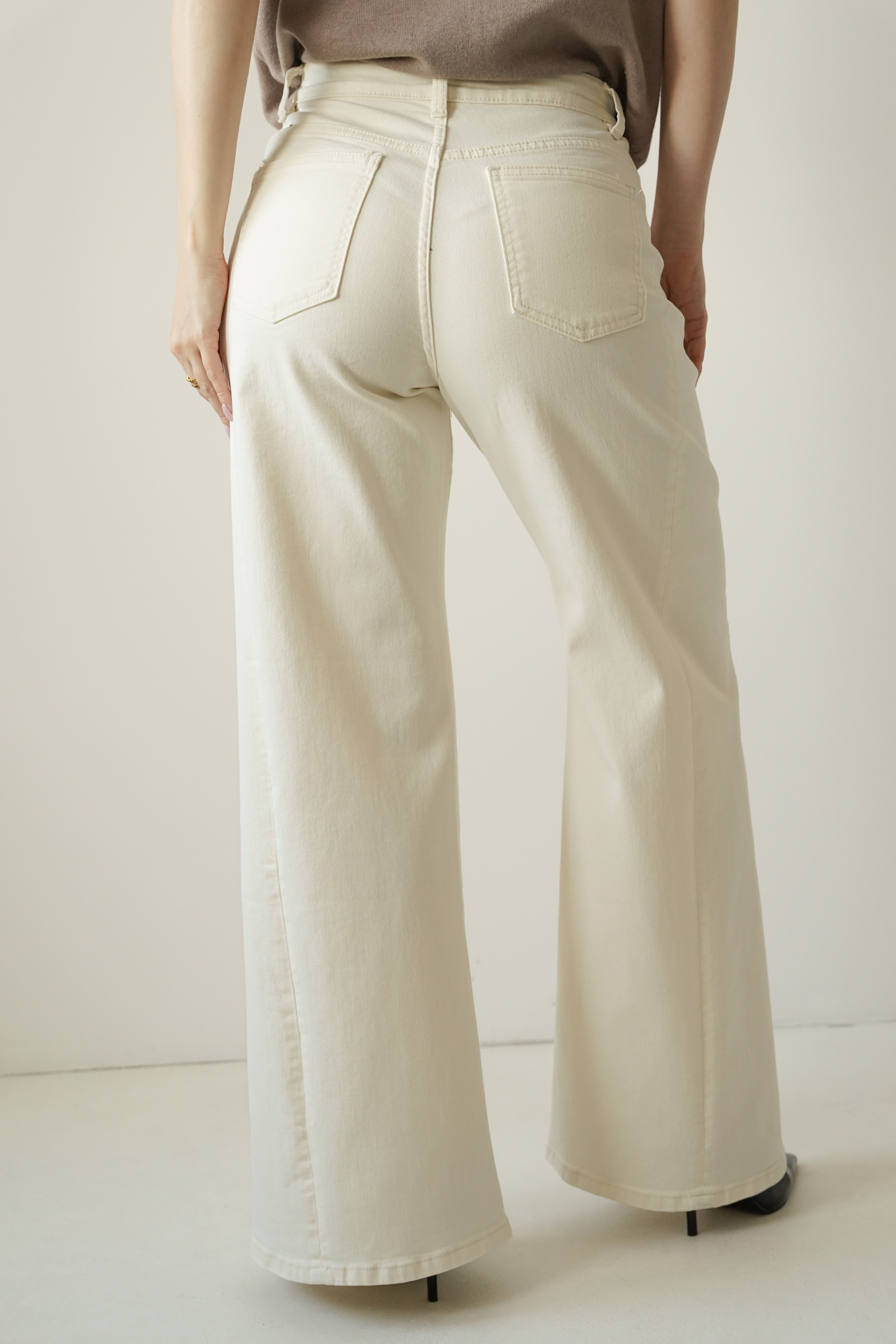 CLOUDE are wide-leg jeans made of high-quality cotton in a fashionable cloud dancer shade. Straight, wide legs, a classic button and zip fastening, and a minimalist design make them a timeless choice for everyday wear and more sophisticated outfits.