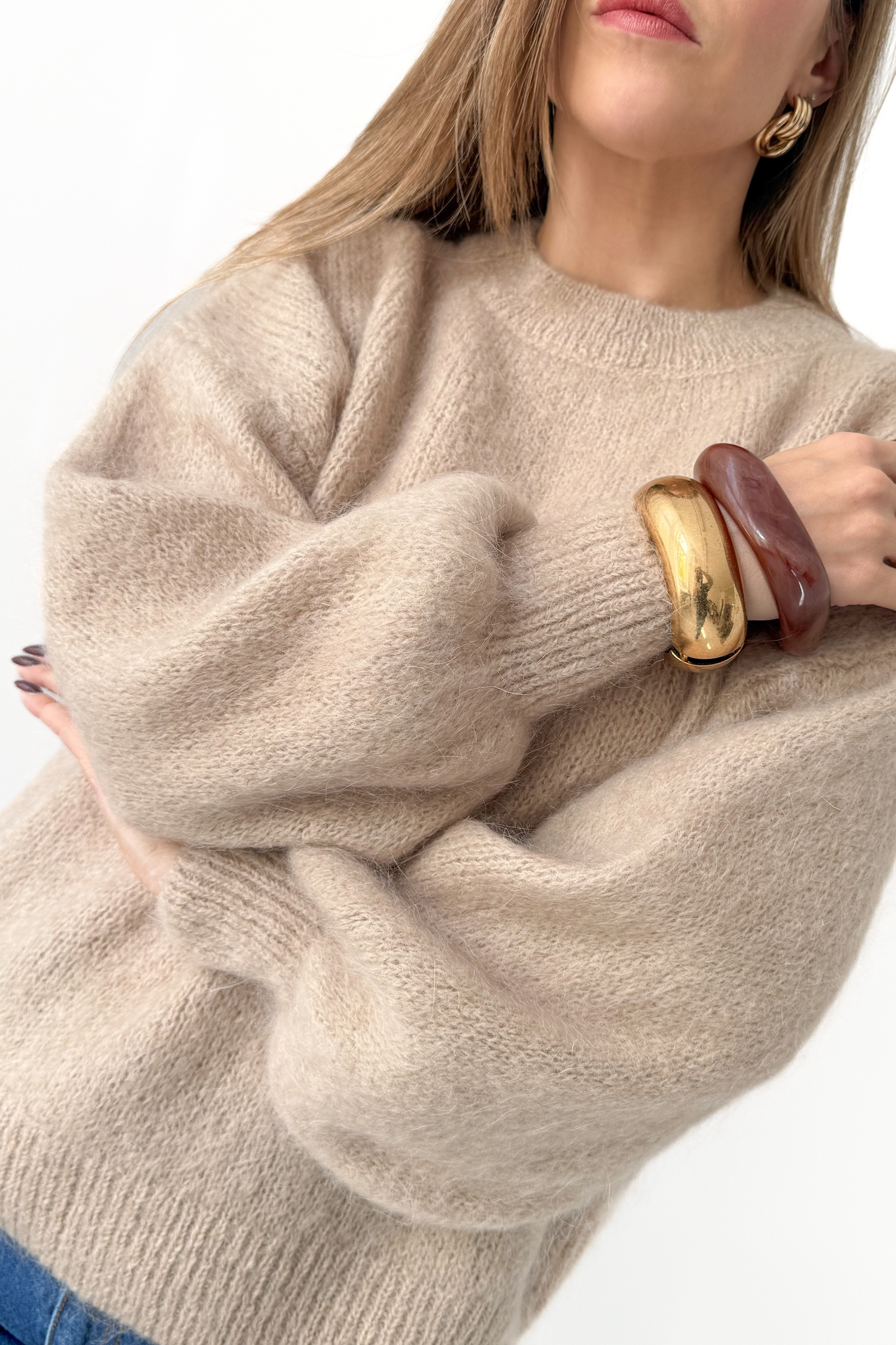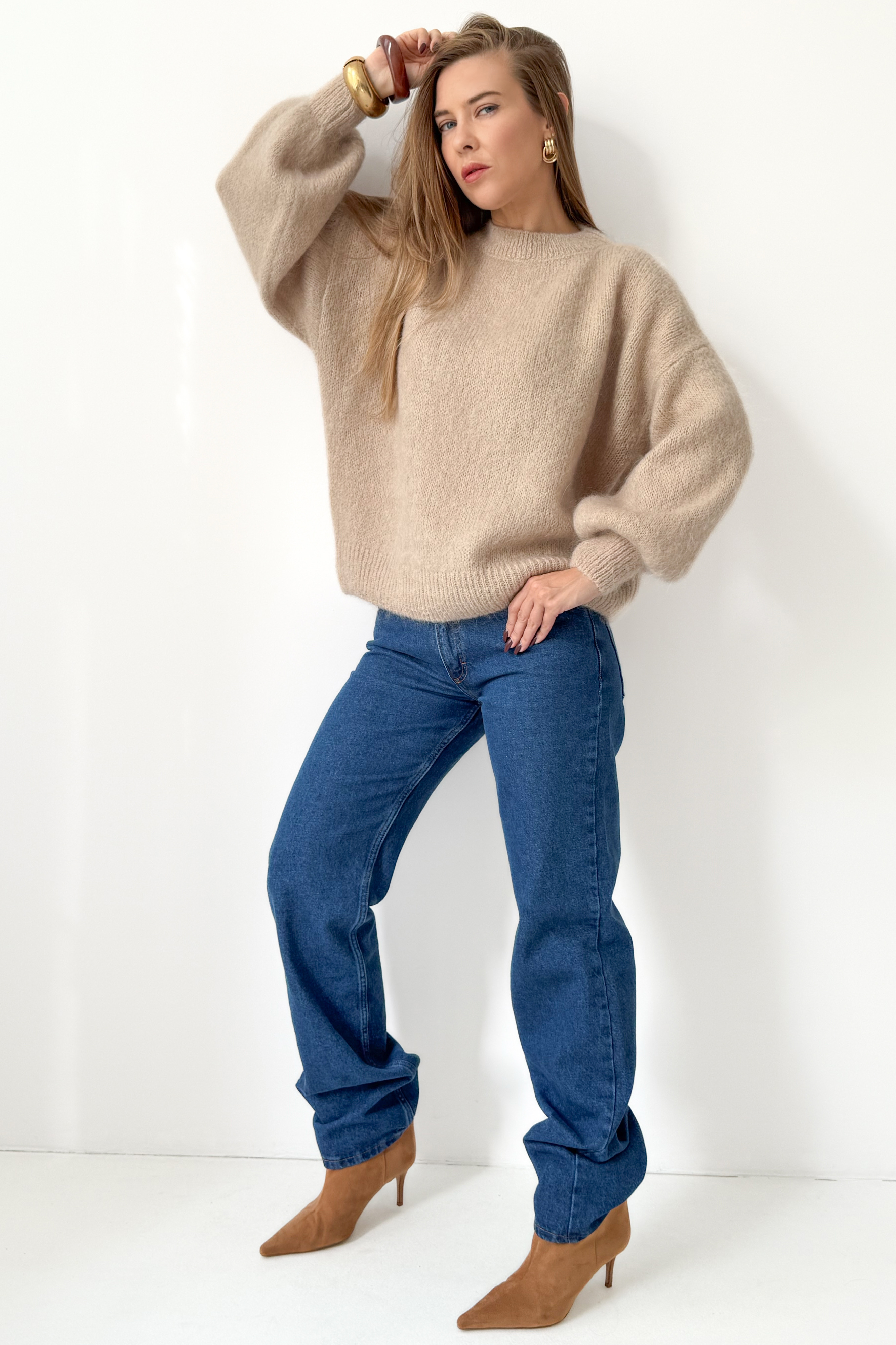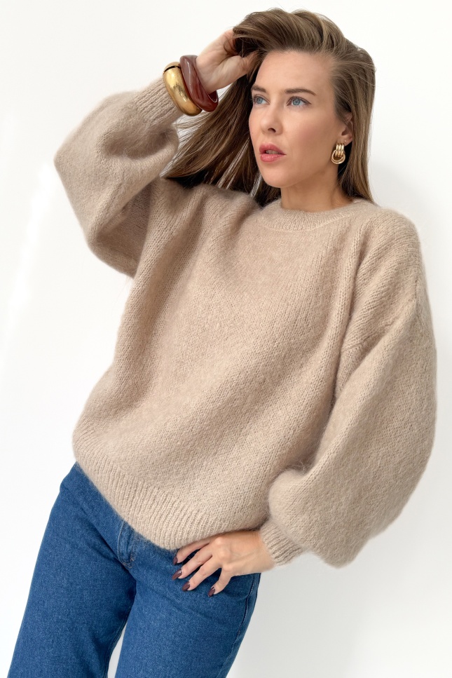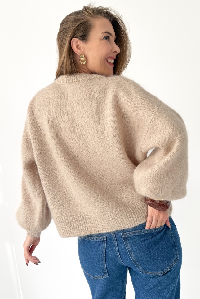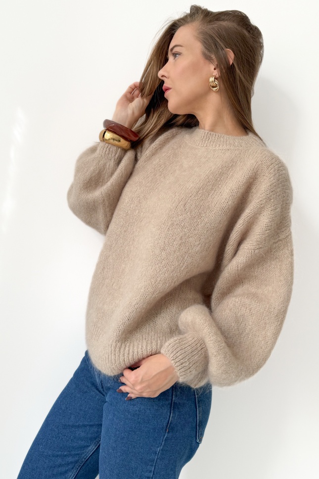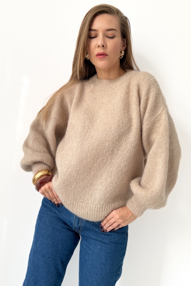 Eva is a classic sweater with subtly puffed sleeves that combines simplicity of form with elegant details. Made from natural yarn with added kid mohair, mohair, and wool, it delights with its softness, lightness, and pleasant warmth. Its timeless design makes it a perfect match for jeans, elegant trousers, or a skirt – it's a sweater that always looks stylish.