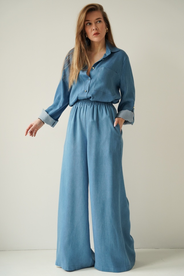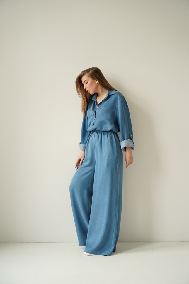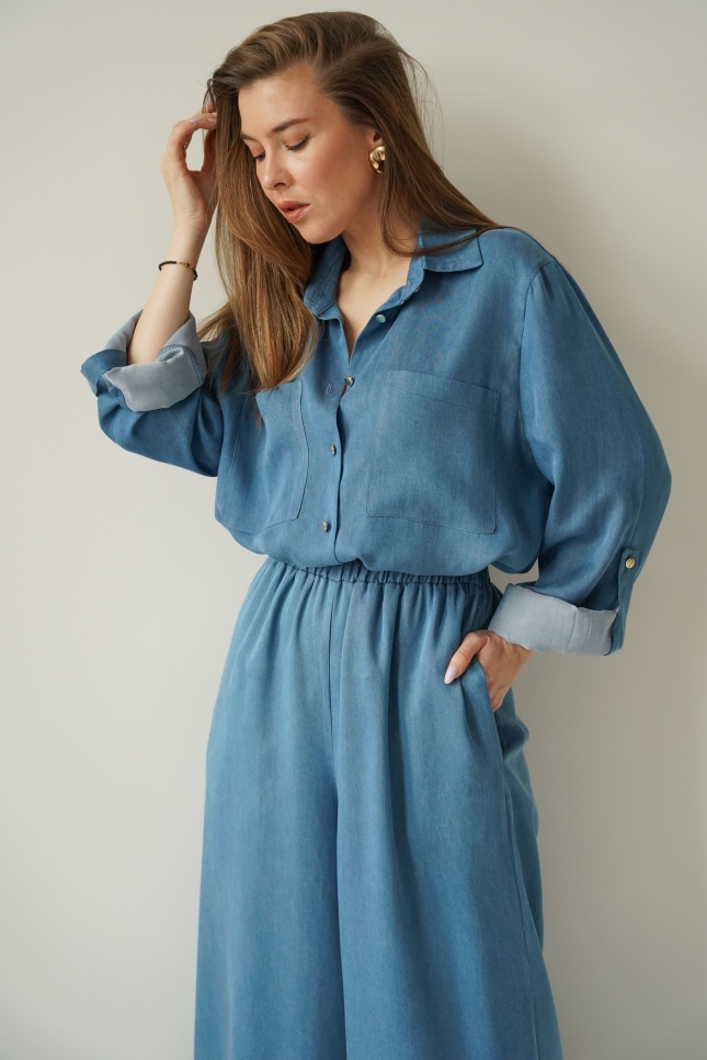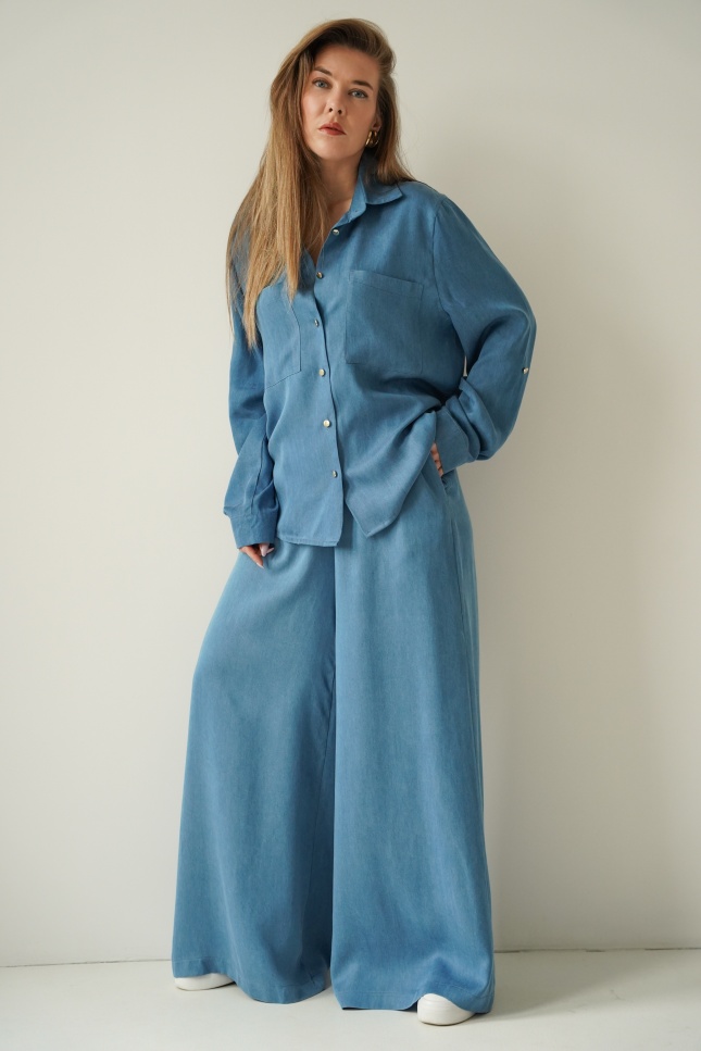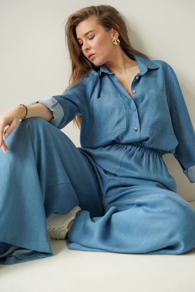 A loose, minimalist shirt together with wide pants with convenient pockets create a cohesive, nonchalant look, which will successfully suit both everyday life, business meetings and holiday travel.