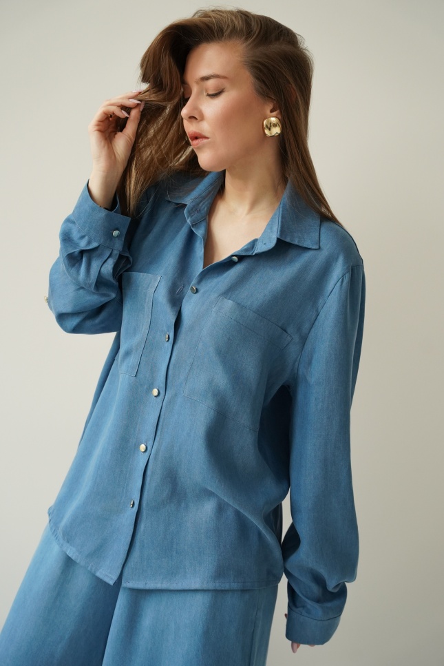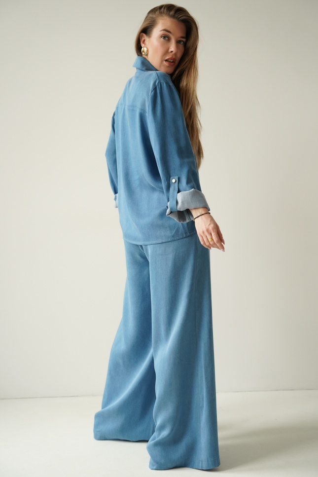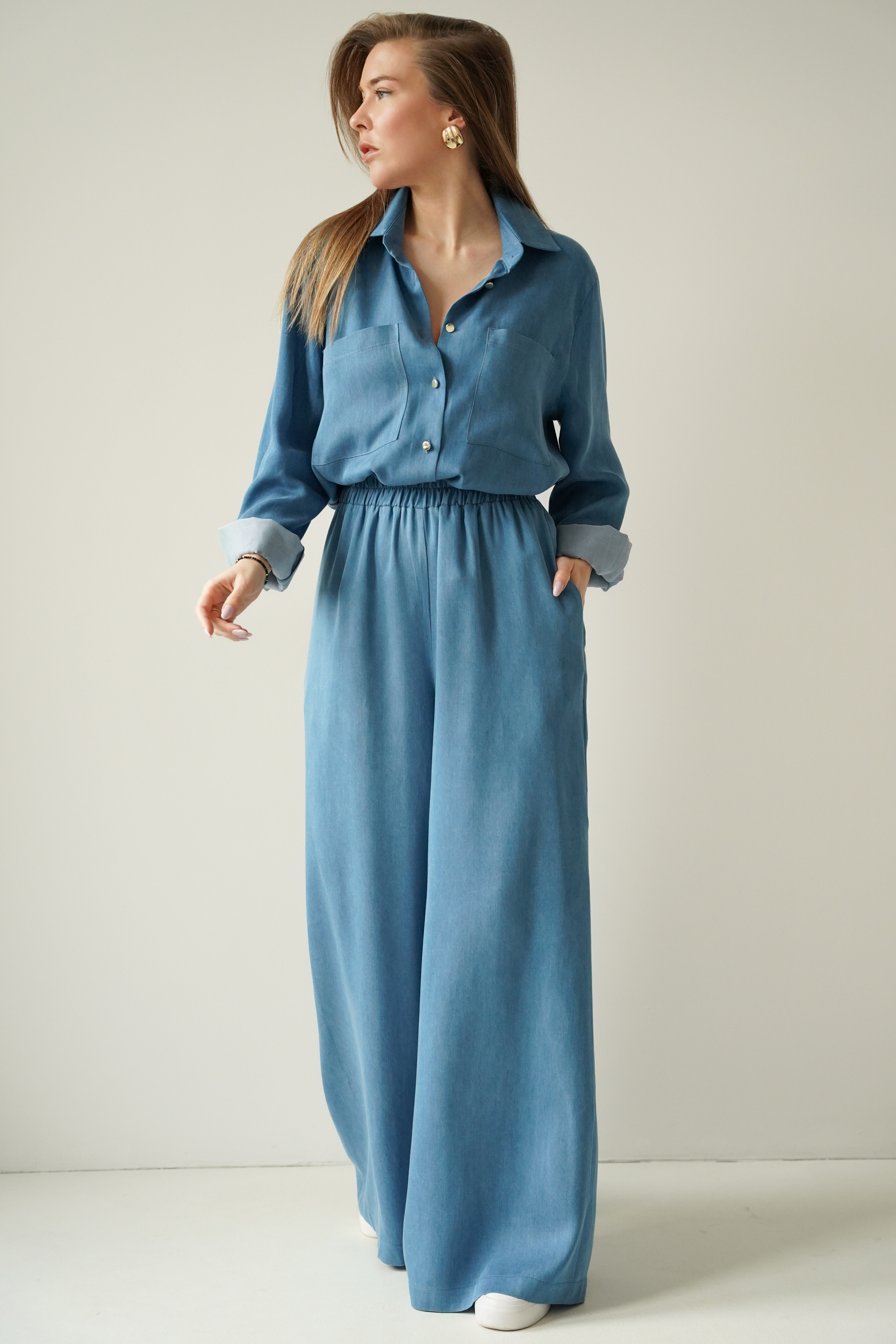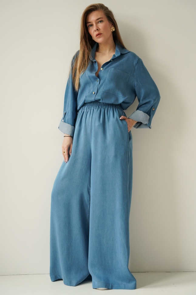 A loose, minimalist shirt together with wide pants with convenient pockets create a cohesive, nonchalant look, which will successfully suit both everyday life, business meetings and holiday travel.