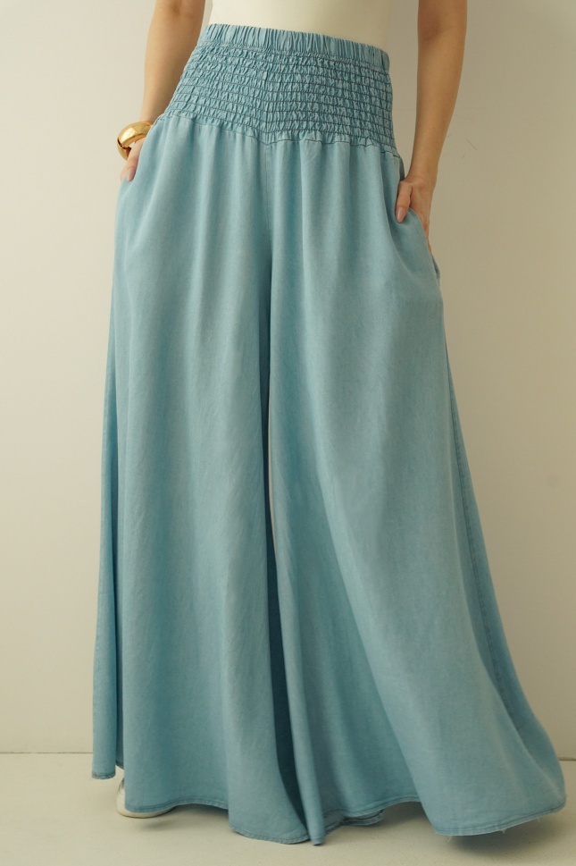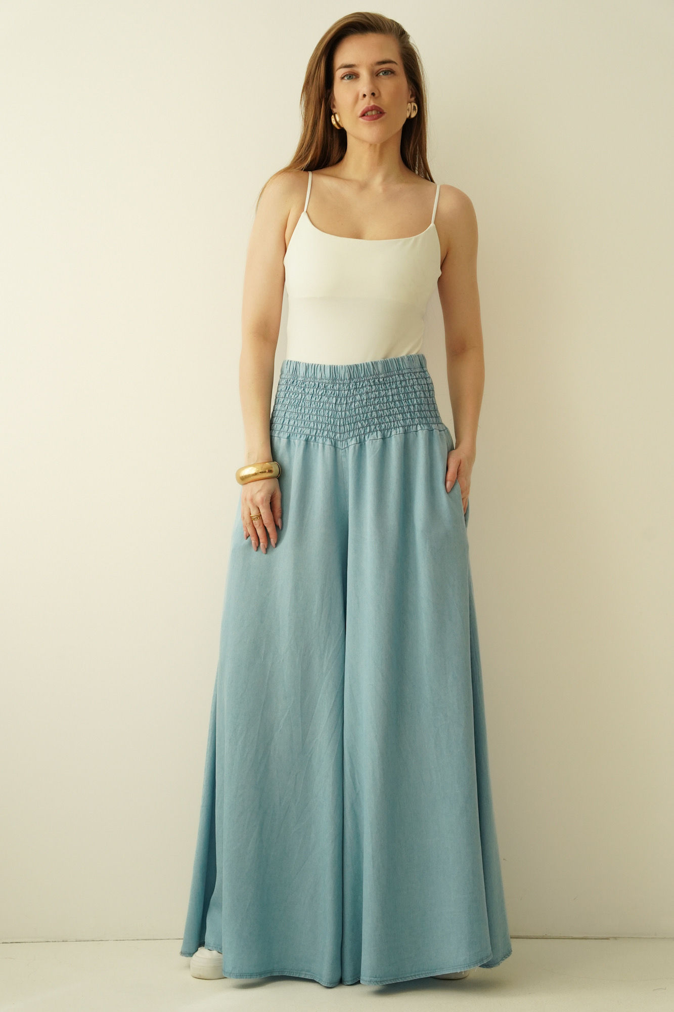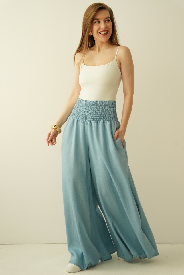 The Sienna trousers are a unique design featuring ultra-wide legs that resemble a skirt, crafted from a lightweight, natural 100% lyocell fabric. The high waist with its distinctive elasticated band beautifully accentuates the waist and ensures comfort. The lightweight, flowing fabric moves subtly with every step, lending the female silhouette softness and elegance. They are the perfect choice for boho, premium casual and modern urban looks.