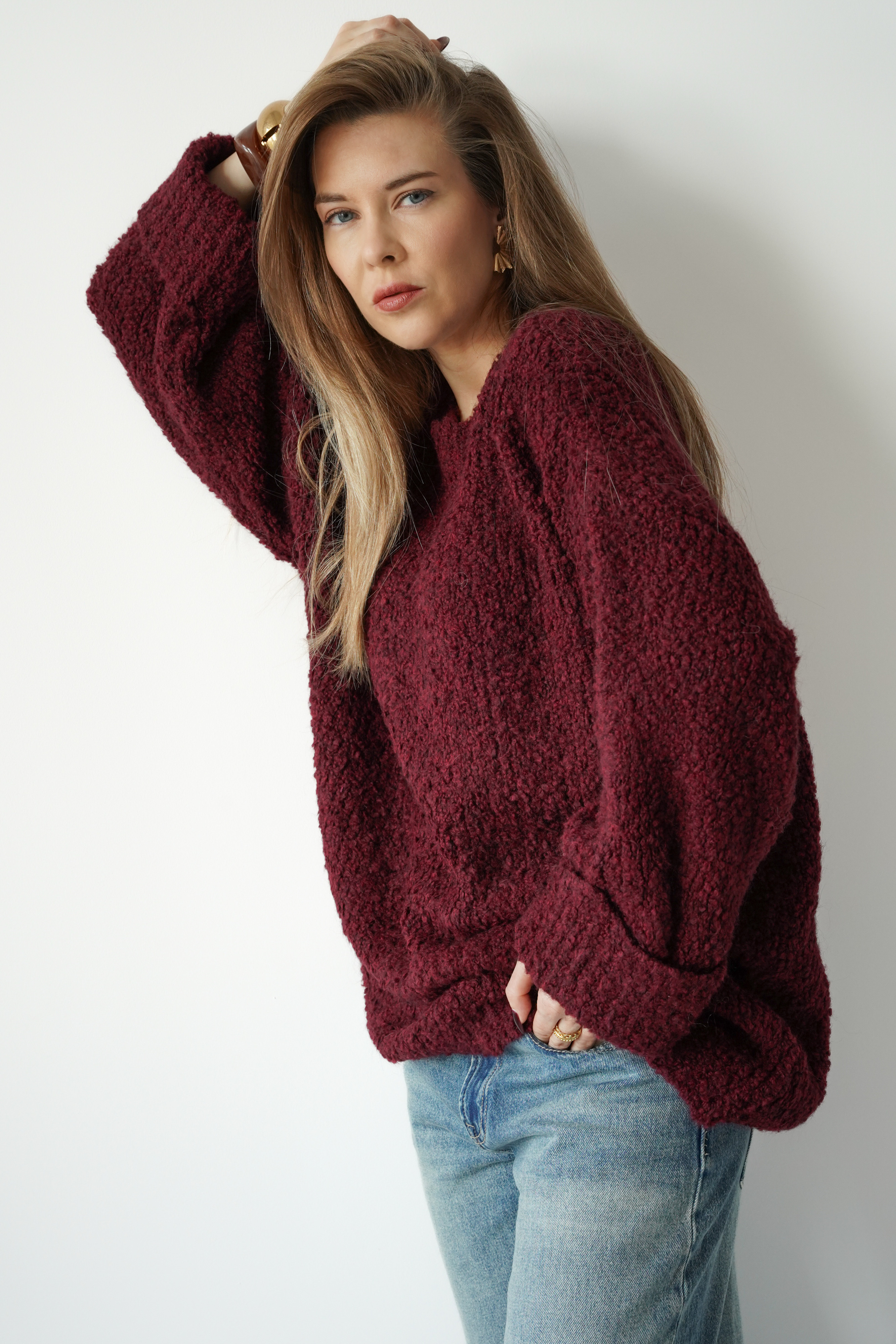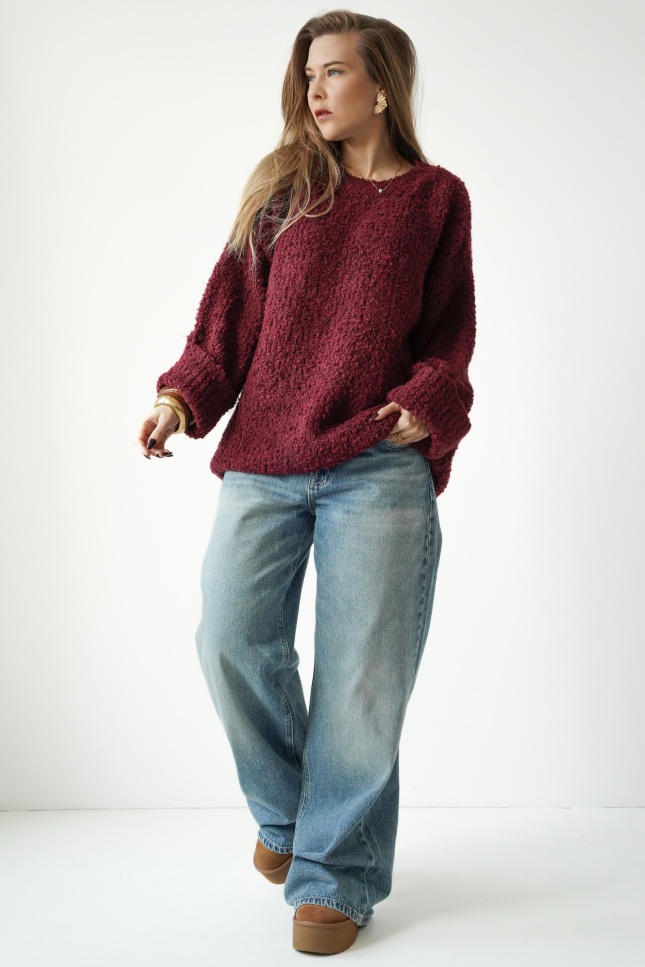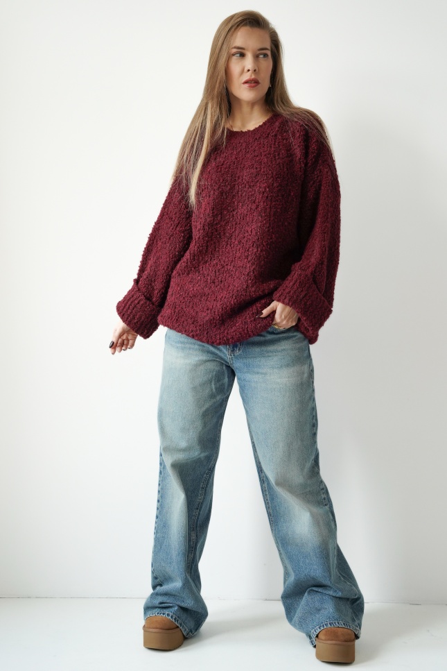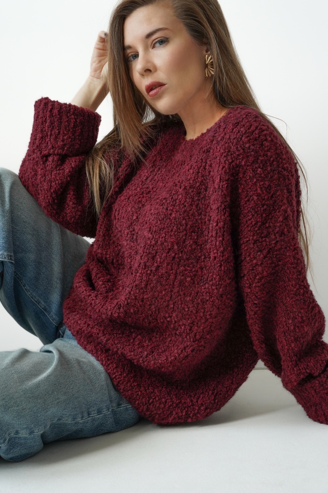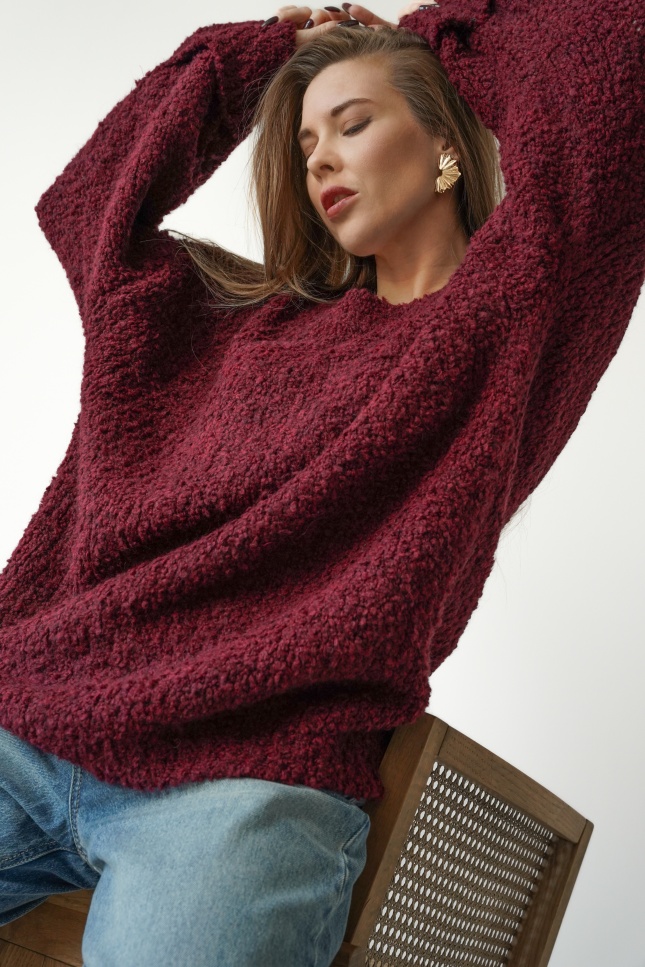 ‘NORDEN’ is an oversized sweater with a longer cut, made of unique bouclé yarn, which gives it fluffiness and softness. Its rolled-up sleeves with cuffs add nonchalance and lightness. This model is inspired by Scandinavian minimalism – warm, comfortable and full of subtle elegance. Perfect for everyday wear, in the spirit of quiet luxury.