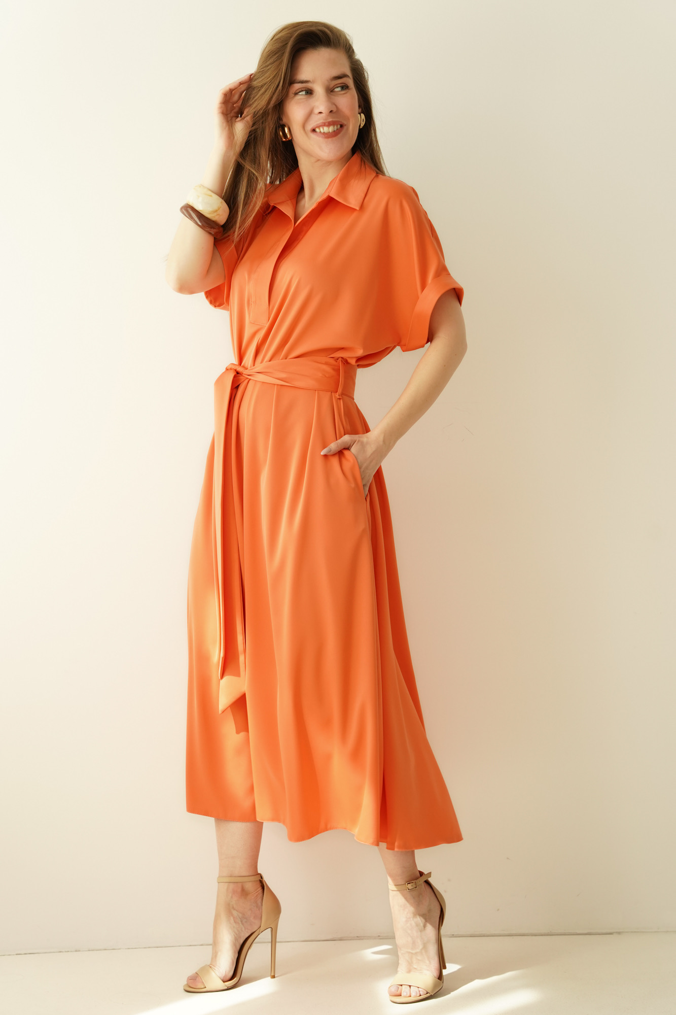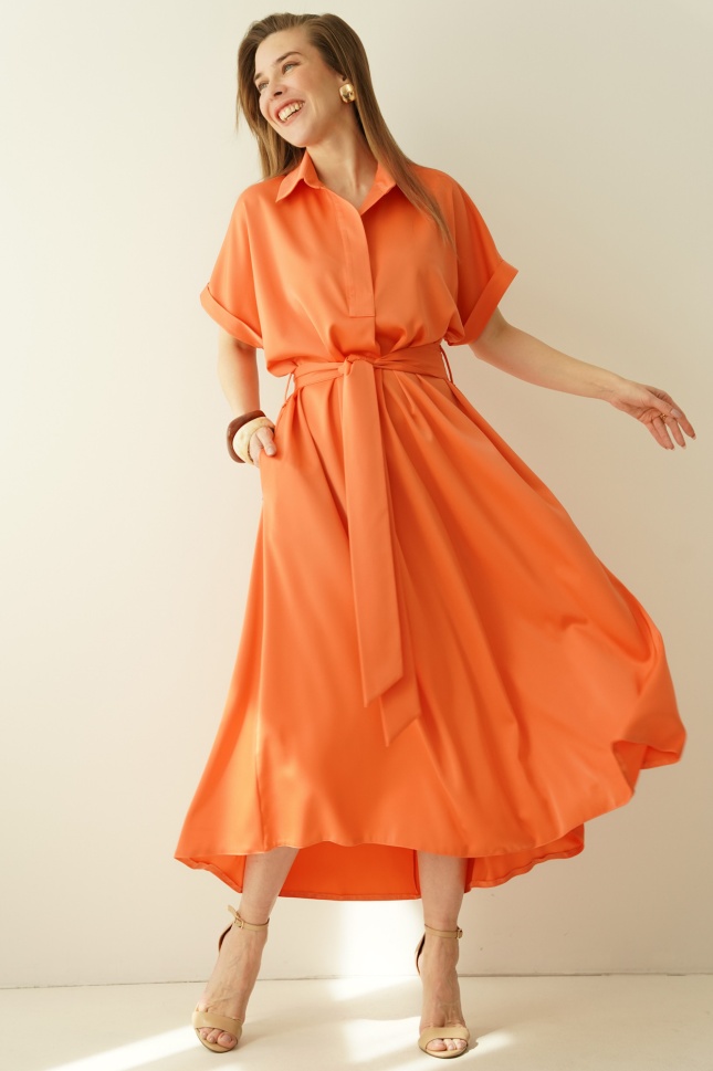 The waist is emphasised by a belt, allowing the dress to fit the figure perfectly, and the carefully selected fabric, a blend of viscose and rayon, is soft, breathable and comfortable to wear.