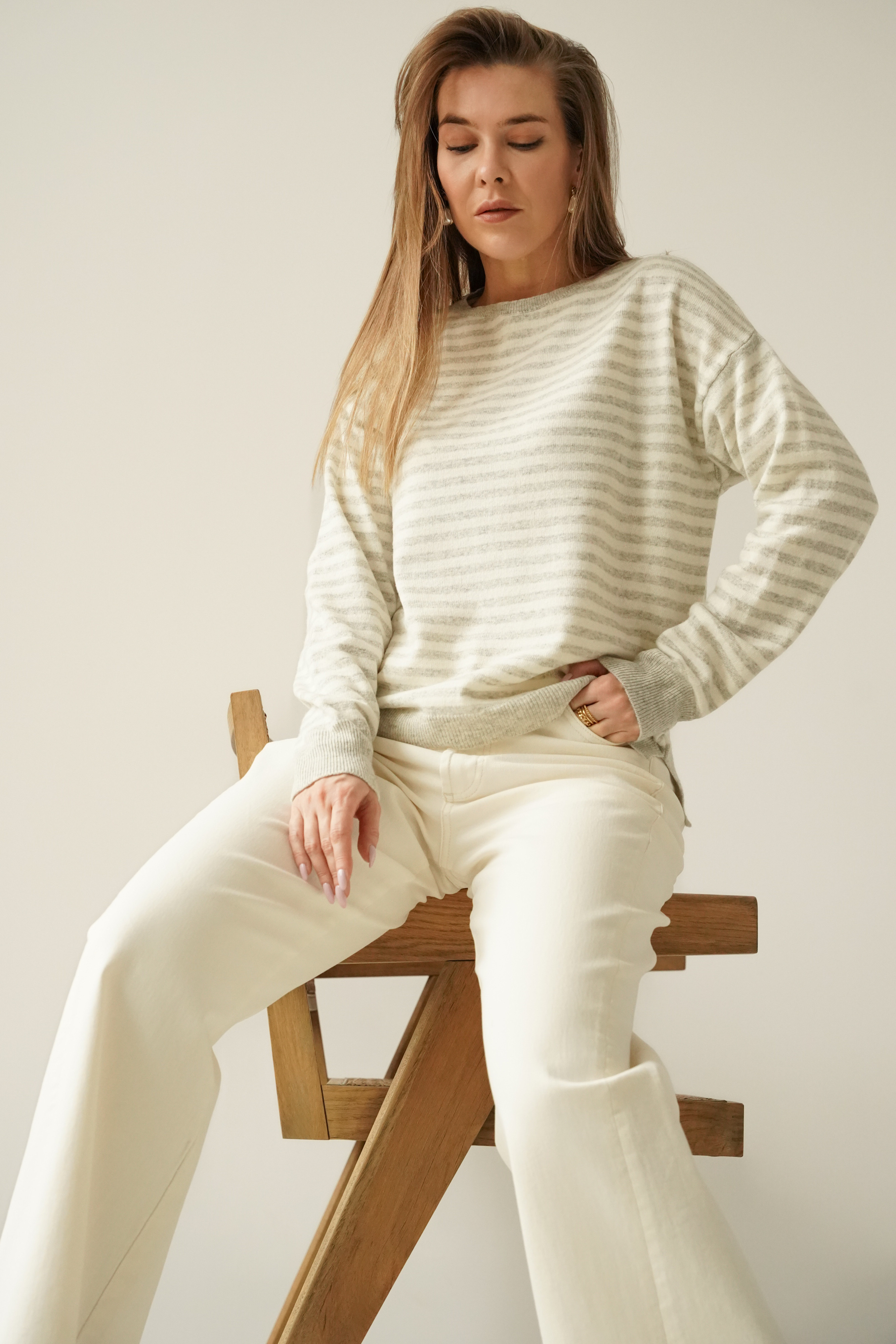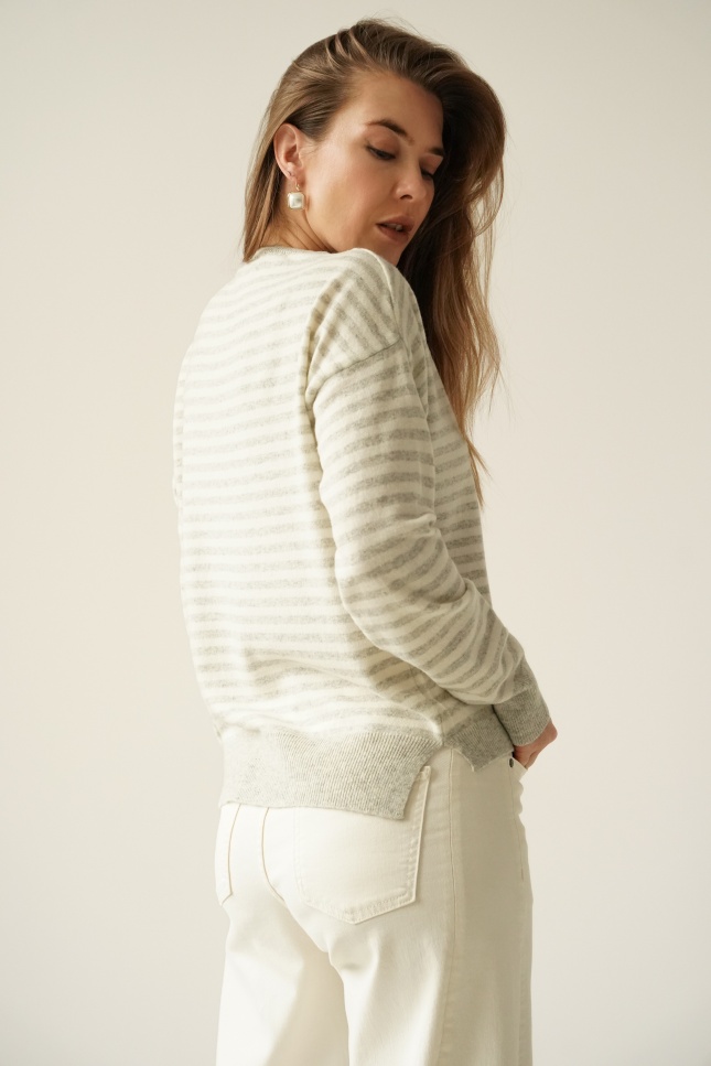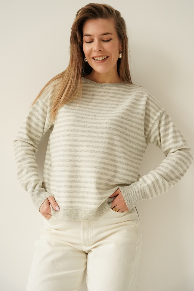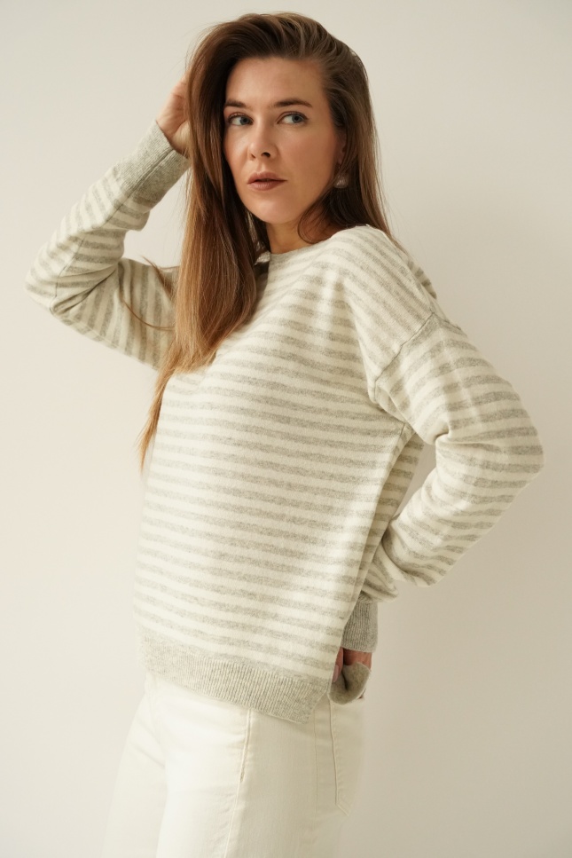 MAELLE is a loose, feminine jumper with a slightly extended back and side slits. Made from a soft blend of cashmere and virgin wool. Pastel stripes and light weight make it the perfect choice for the spring–summer season.