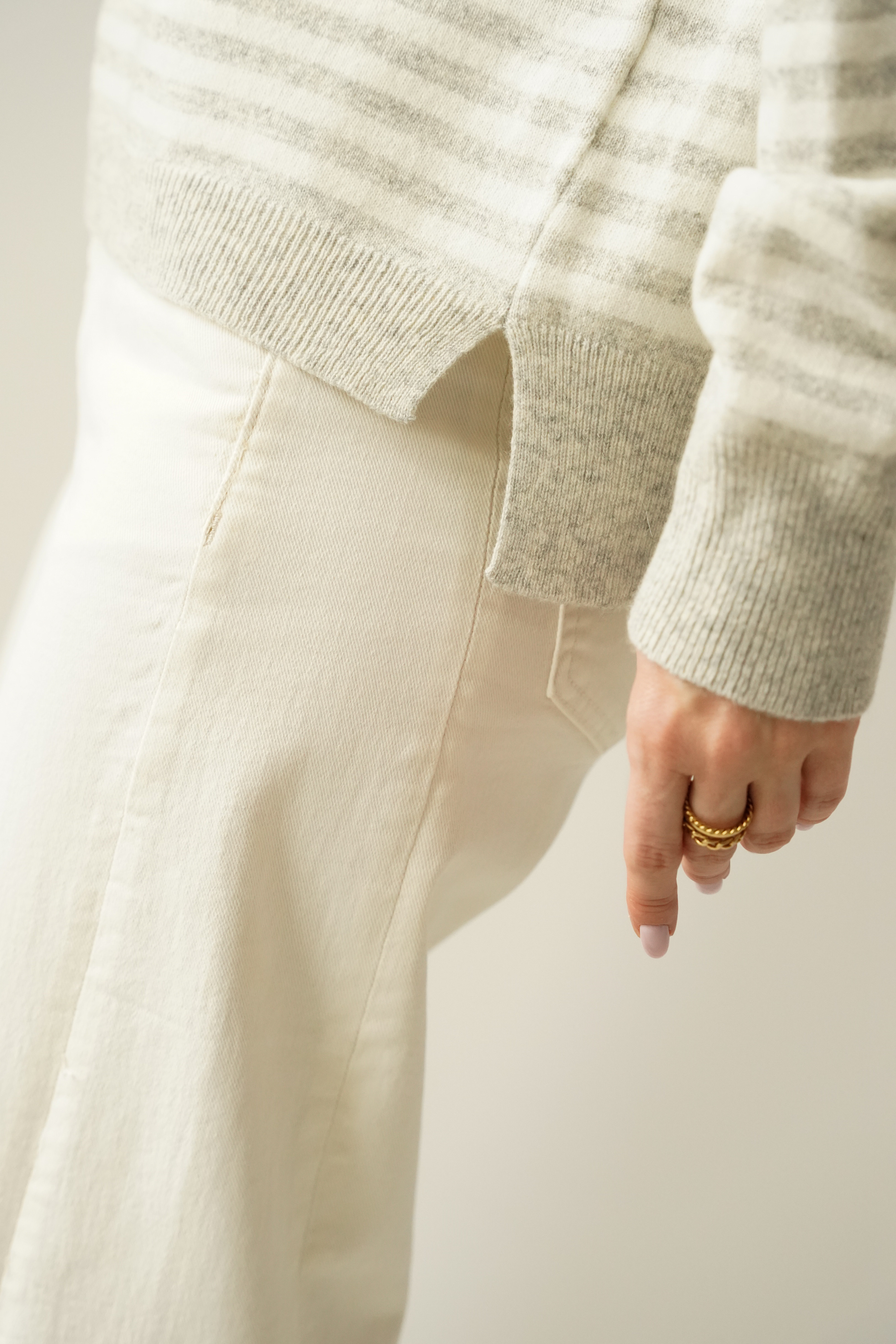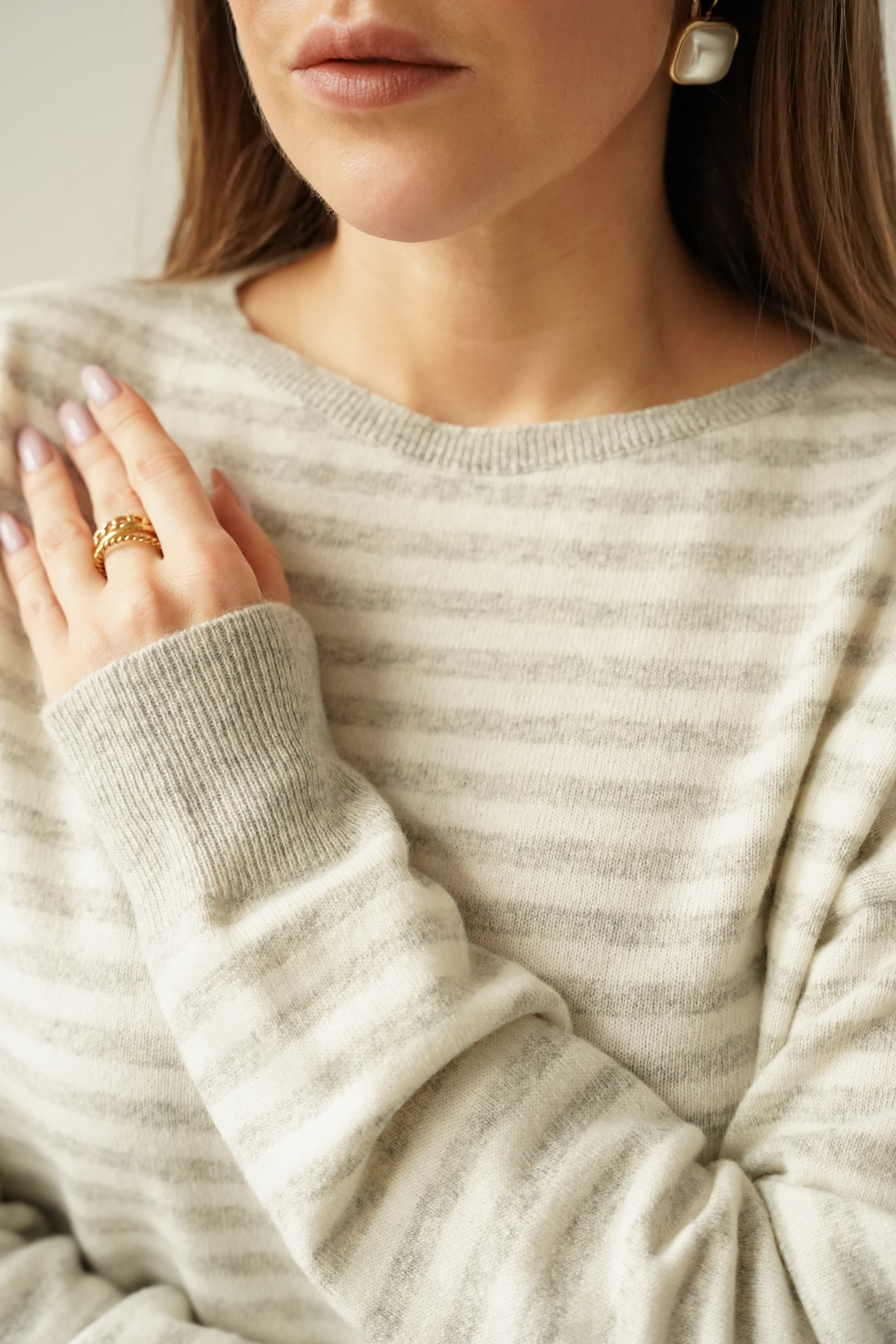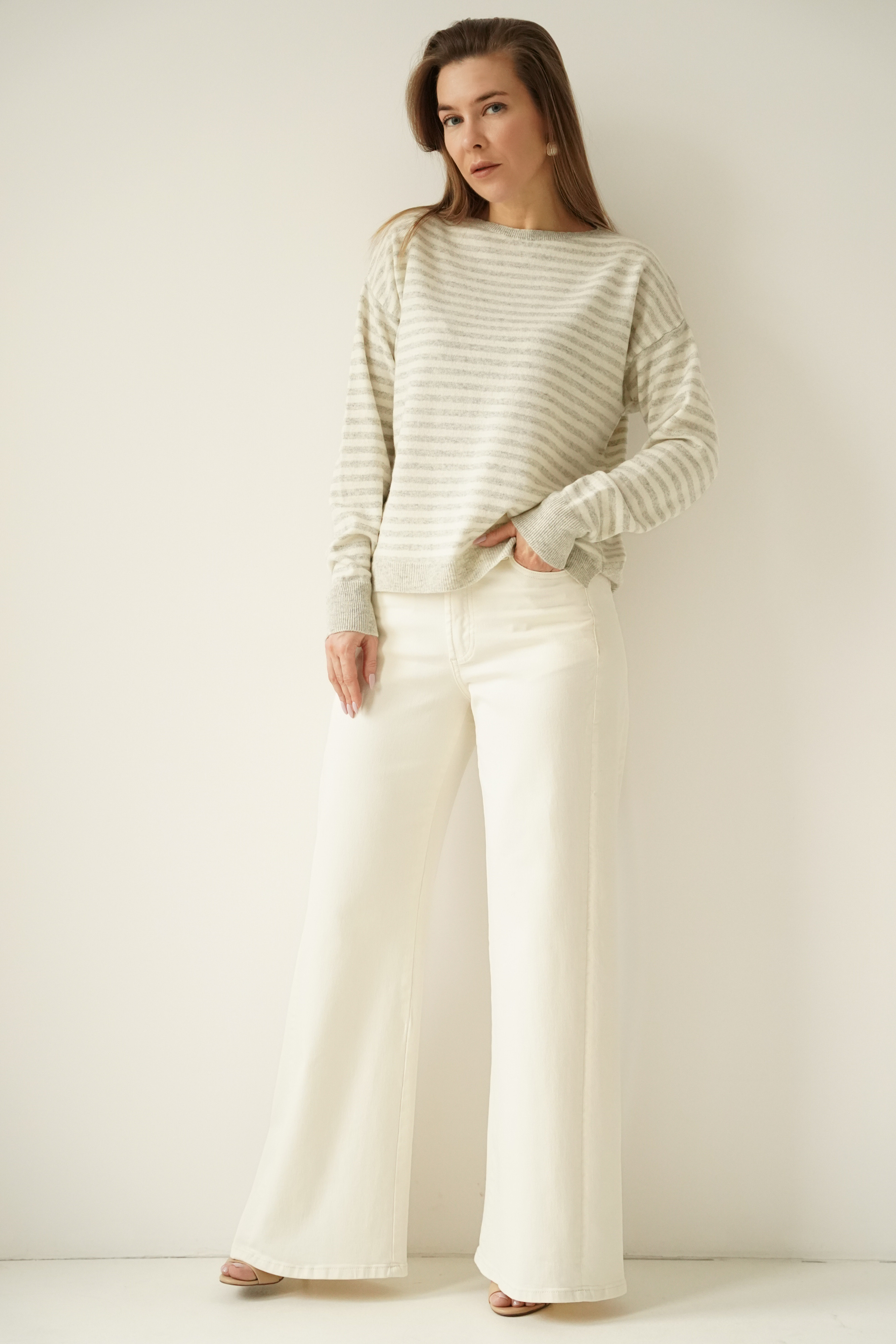 MAELLE is a loose, feminine jumper with a slightly extended back and side slits. Made from a soft blend of cashmere and virgin wool. Pastel stripes and light weight make it the perfect choice for the spring–summer season.