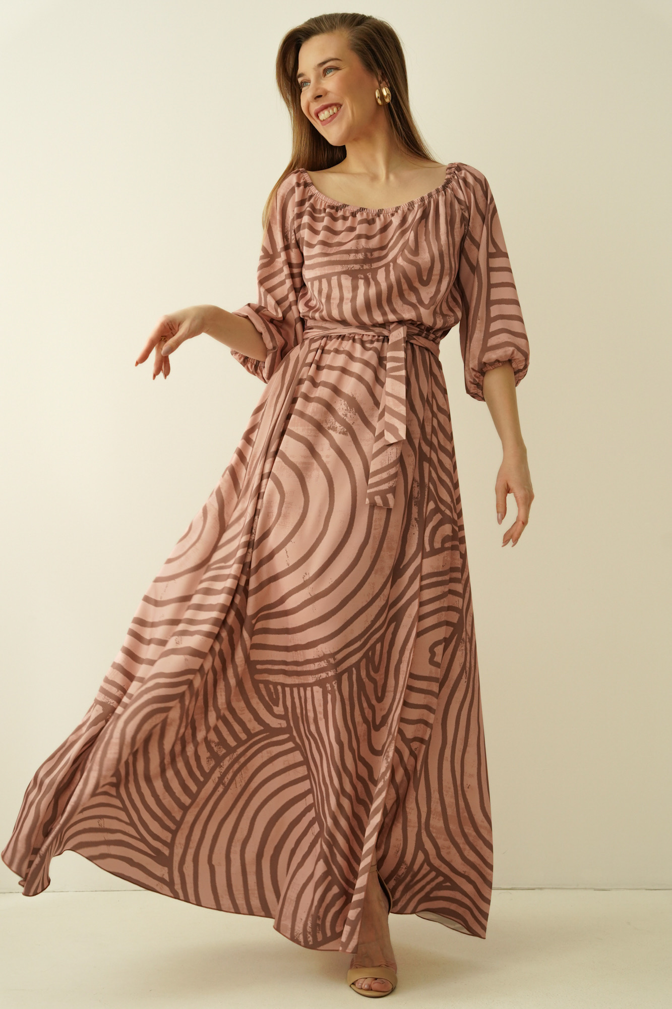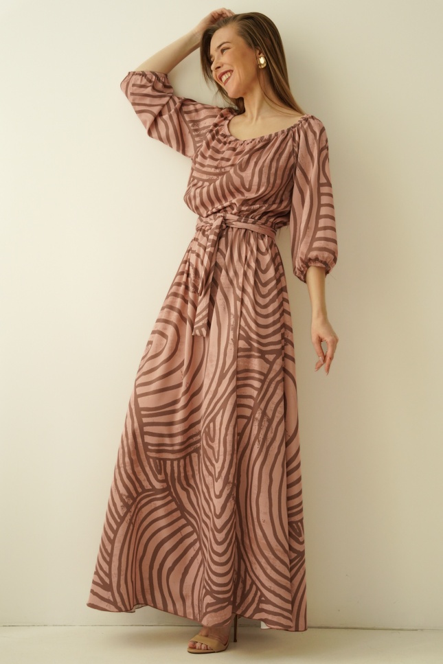 Tie at the waist with a drawstring allows for a perfect fit to the figure, and the flared, enveloping hem gently exposes the leg with each step, creating a feeling of lightness and freedom. Made of the highest quality material - a blend of 90% viscose and 10% silk - the dress wraps the body like a breeze of warm wind, providing comfort and a subtle silky sheen.