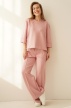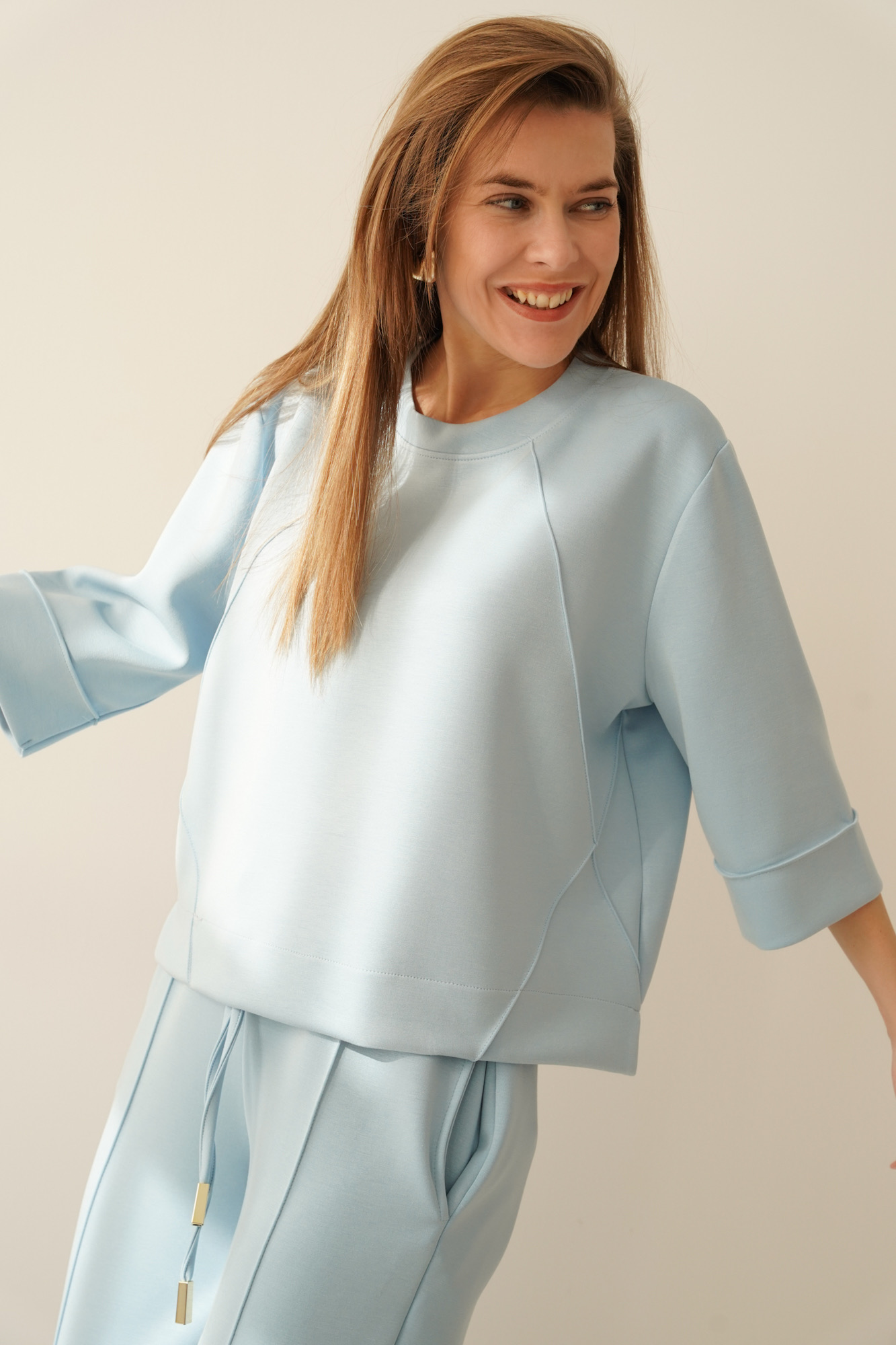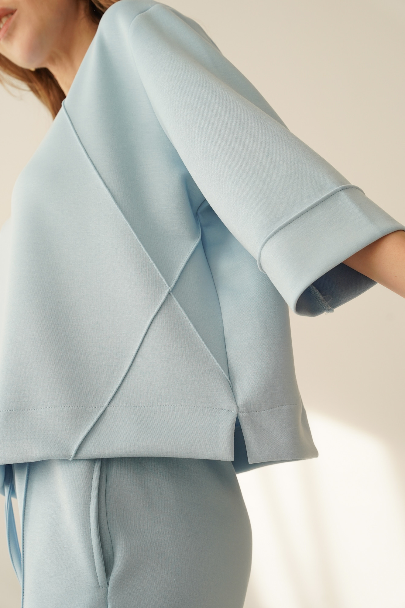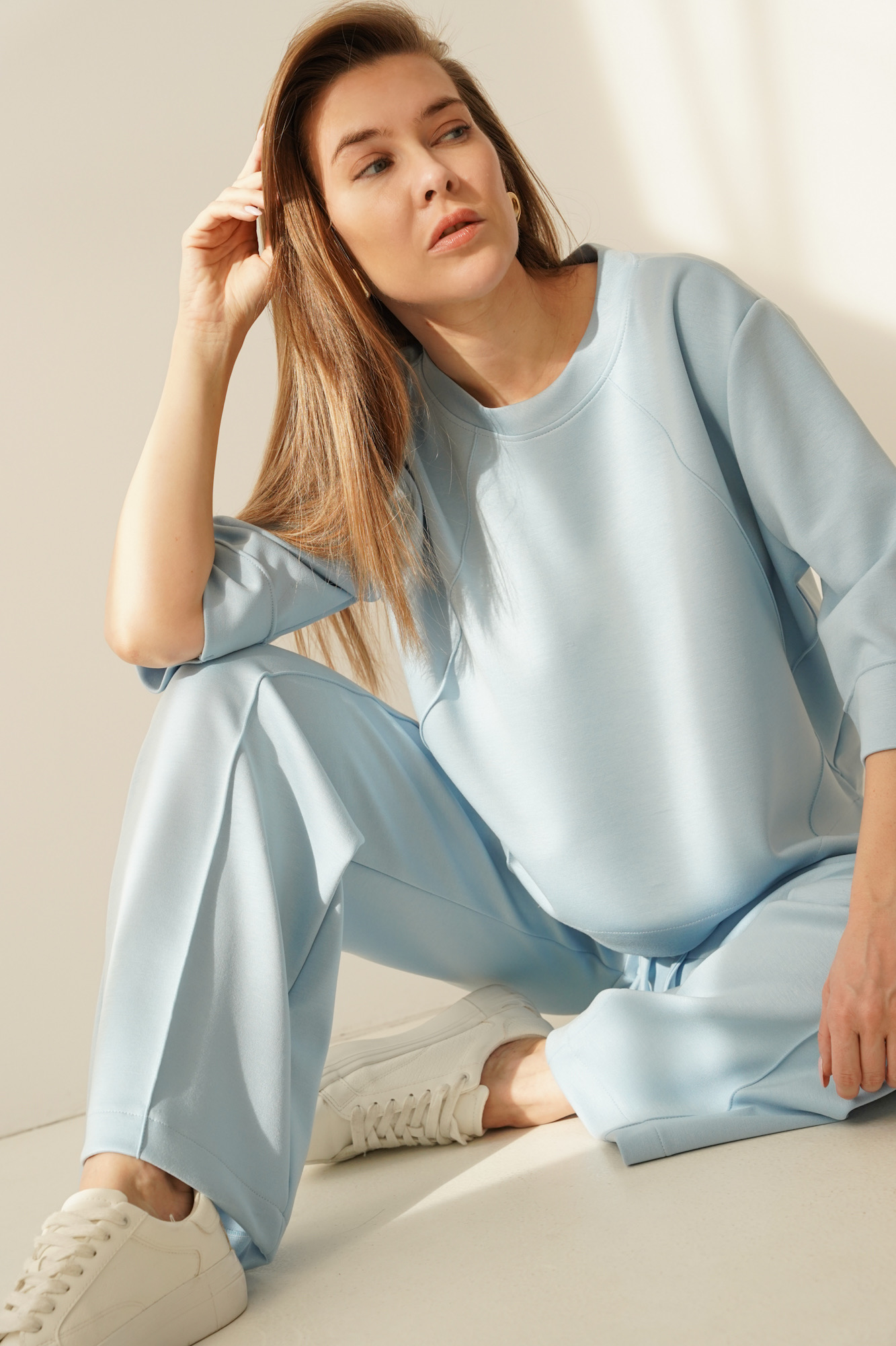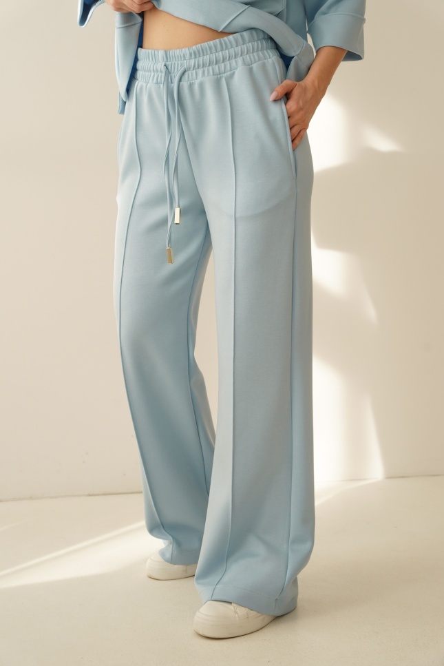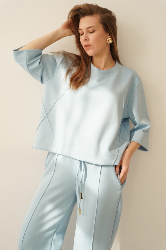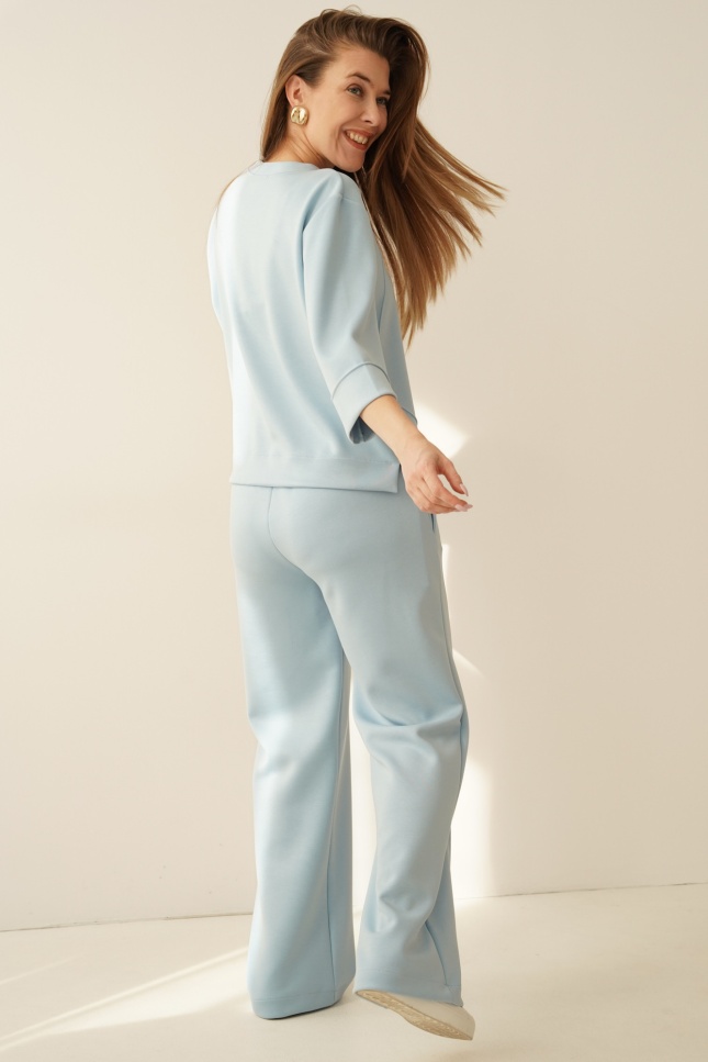 ELLIA is a minimalist set in a sporty casual style, consisting of a simple sweatshirt with distinctive stitching and wide trousers with elegant stitching down the centre of the leg. The trousers have an elasticated waistband and pockets for maximum comfort.