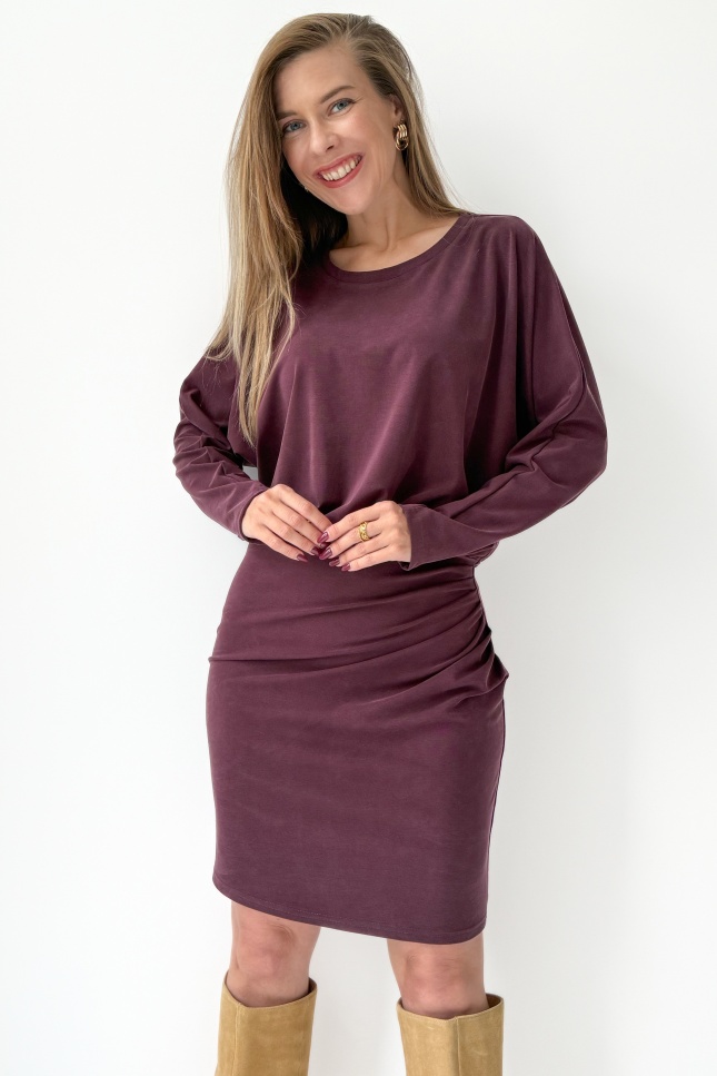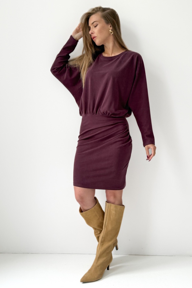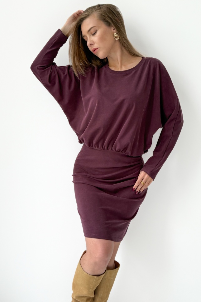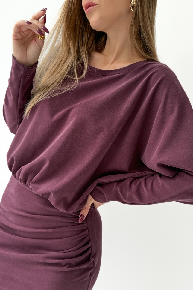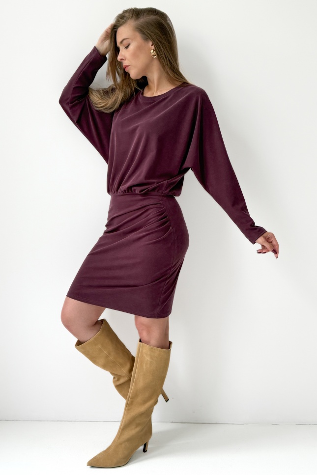 Essenza is a dress that combines simplicity and femininity. The loose, bloused top with raglan sleeves ensures freedom of movement, while the fitted pencil skirt with a ruffle on the side subtly emphasizes the figure.