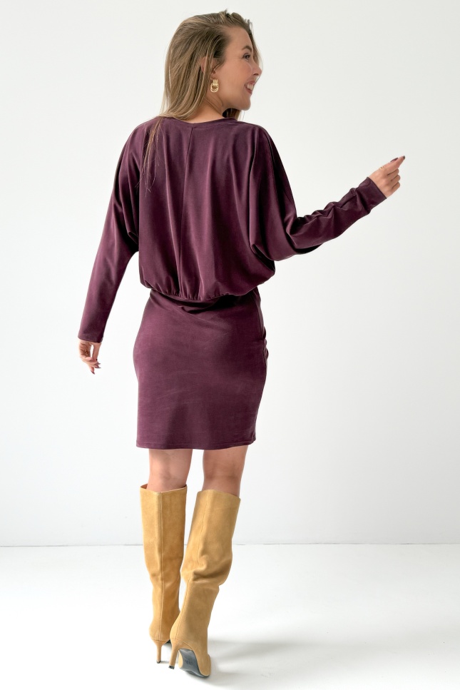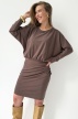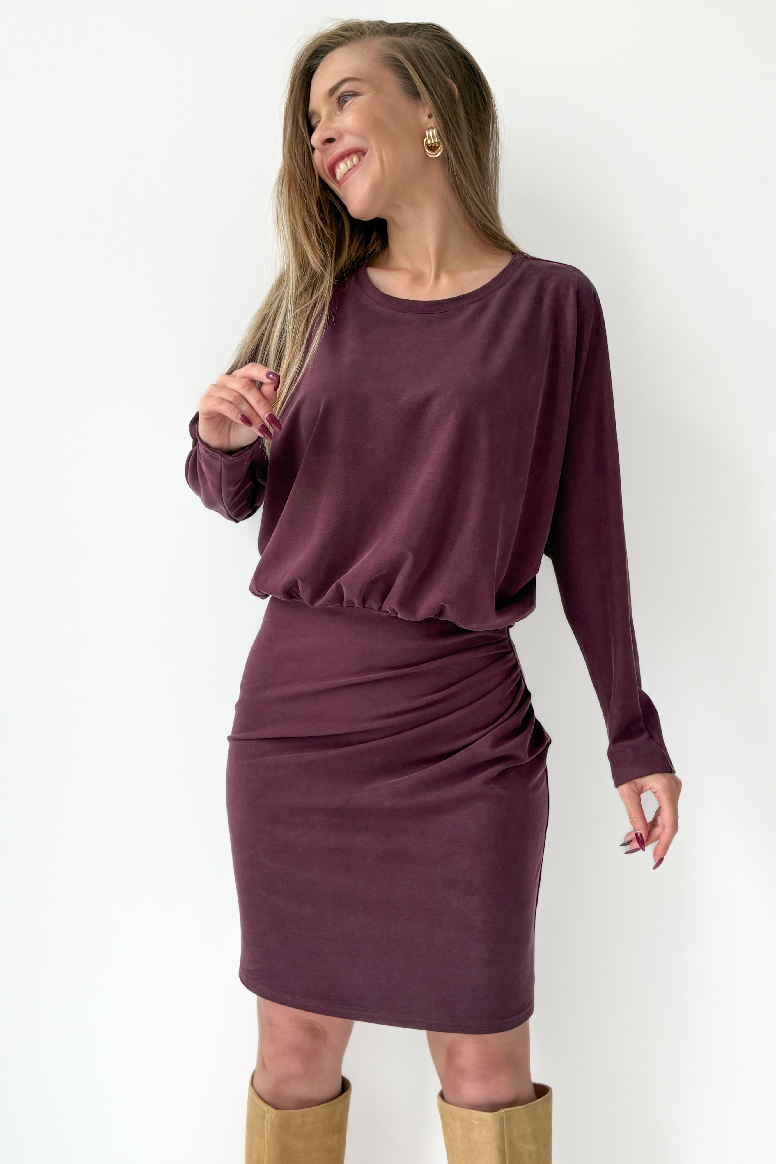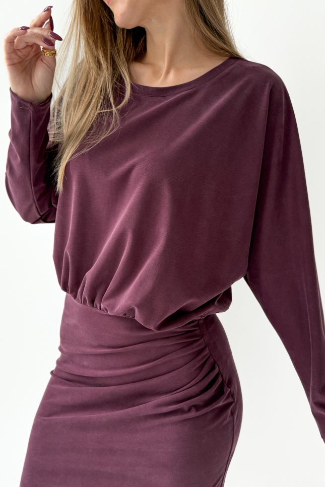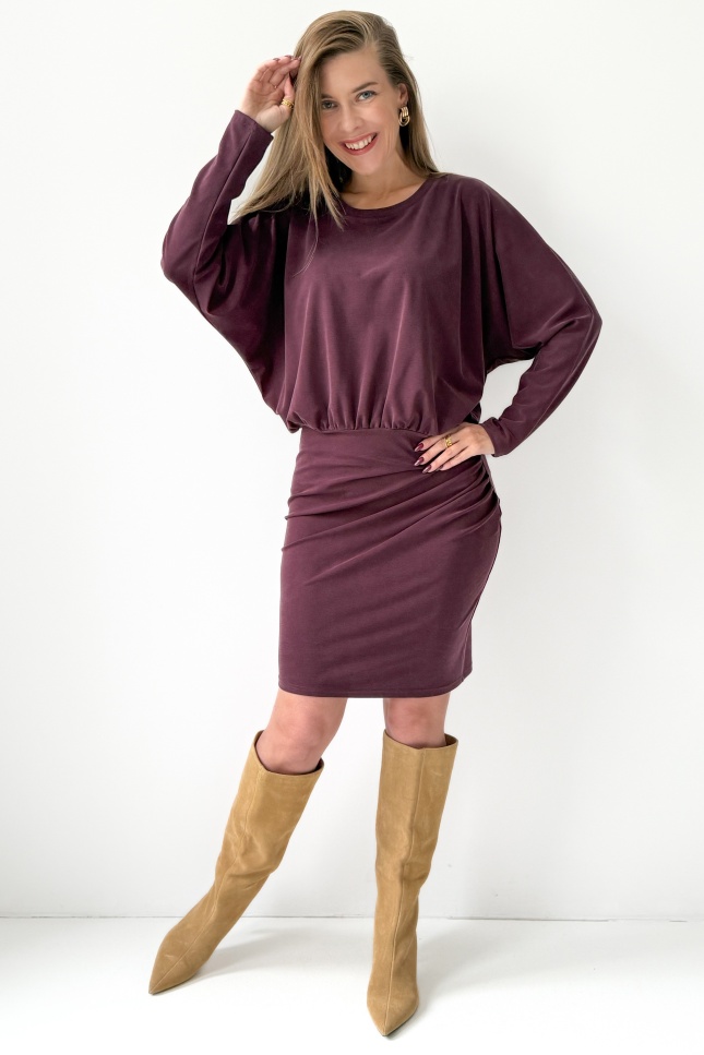 Essenza is a dress that combines simplicity and femininity. The loose, bloused top with raglan sleeves ensures freedom of movement, while the fitted pencil skirt with a ruffle on the side subtly emphasizes the figure.