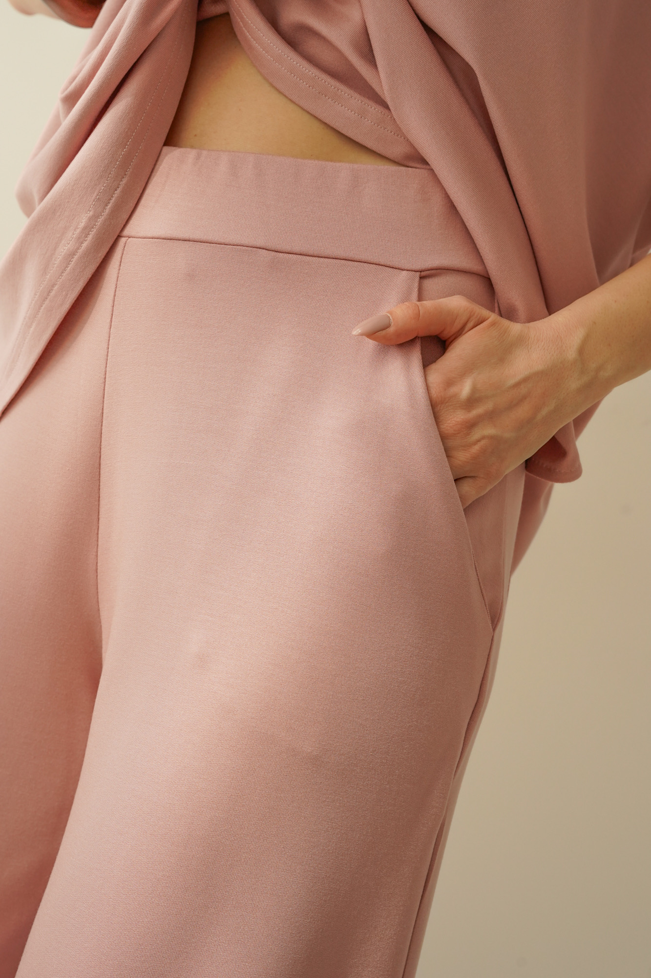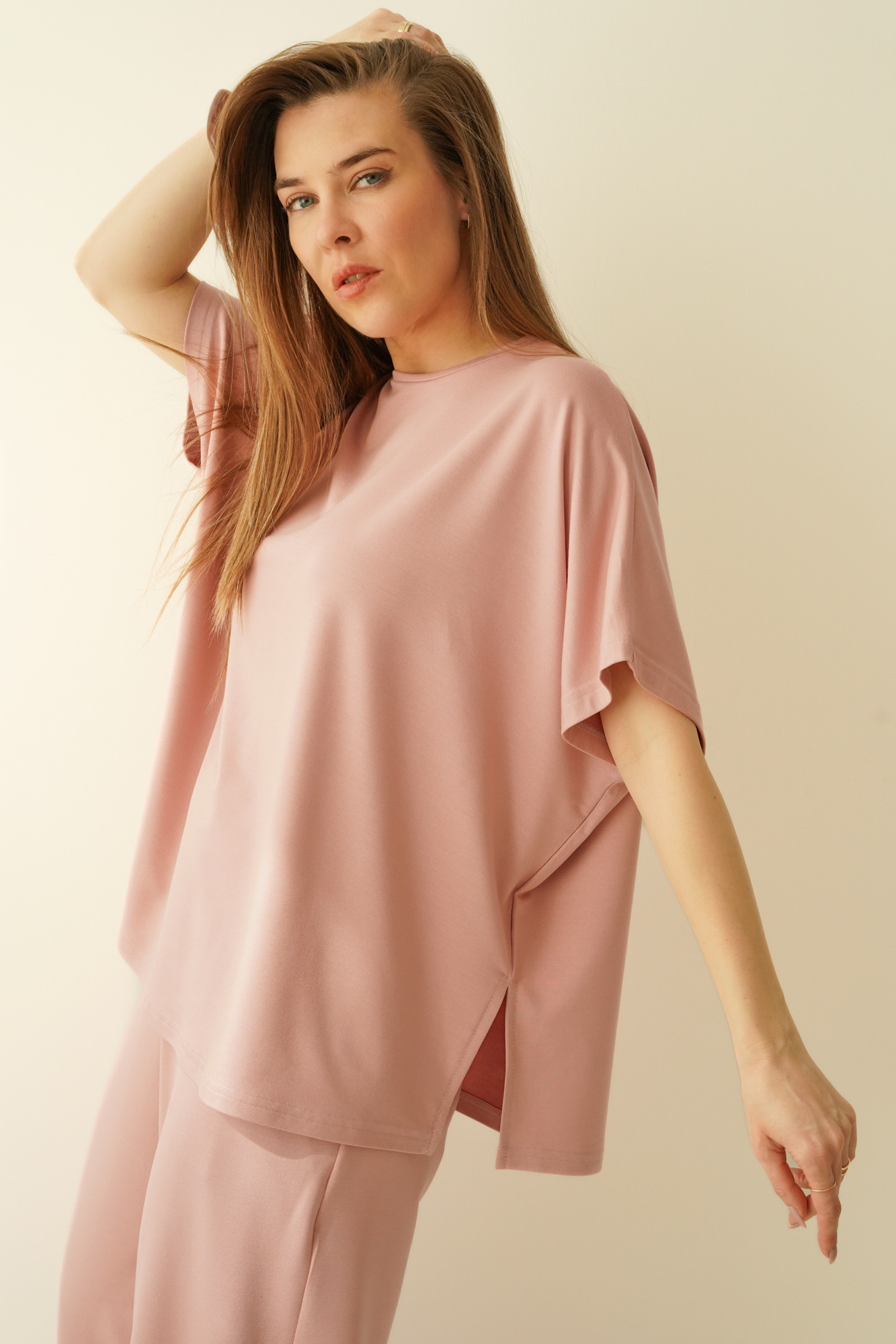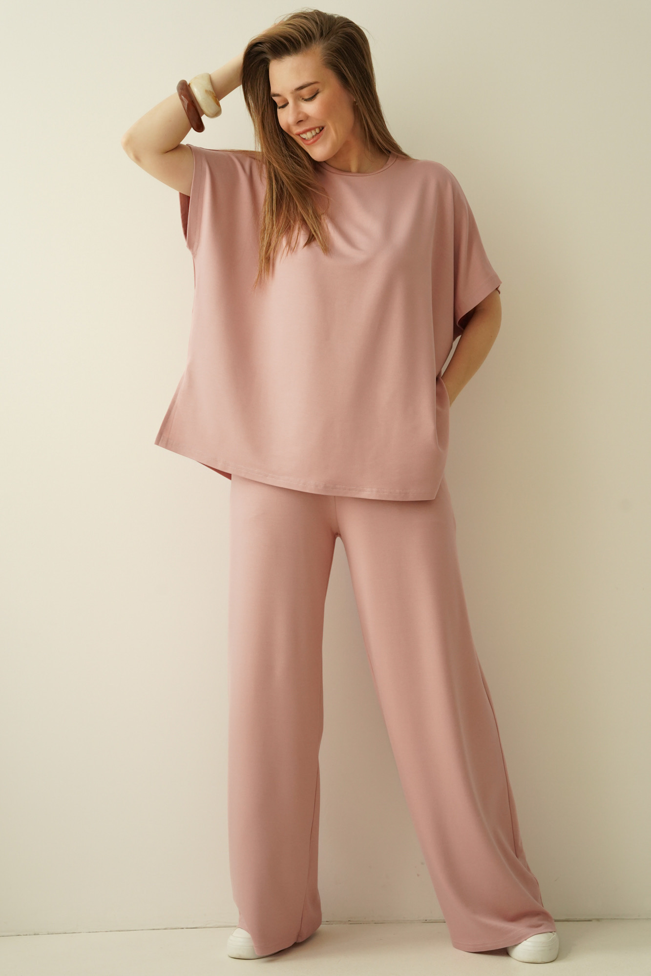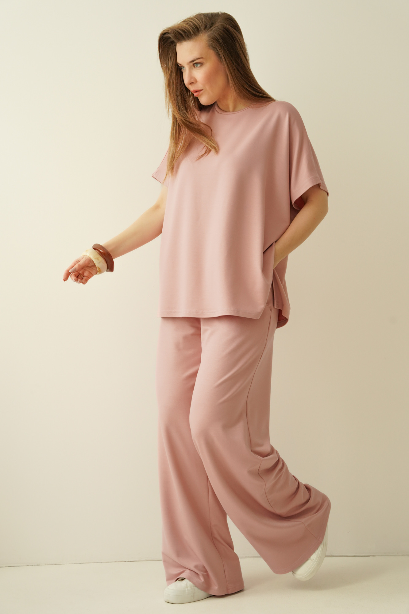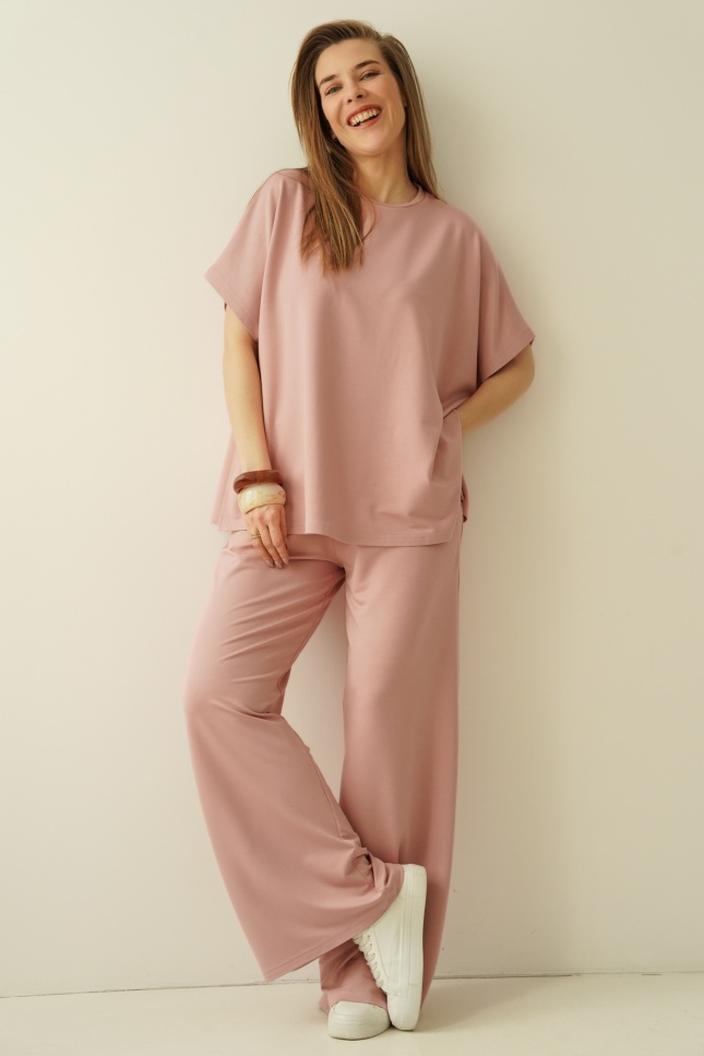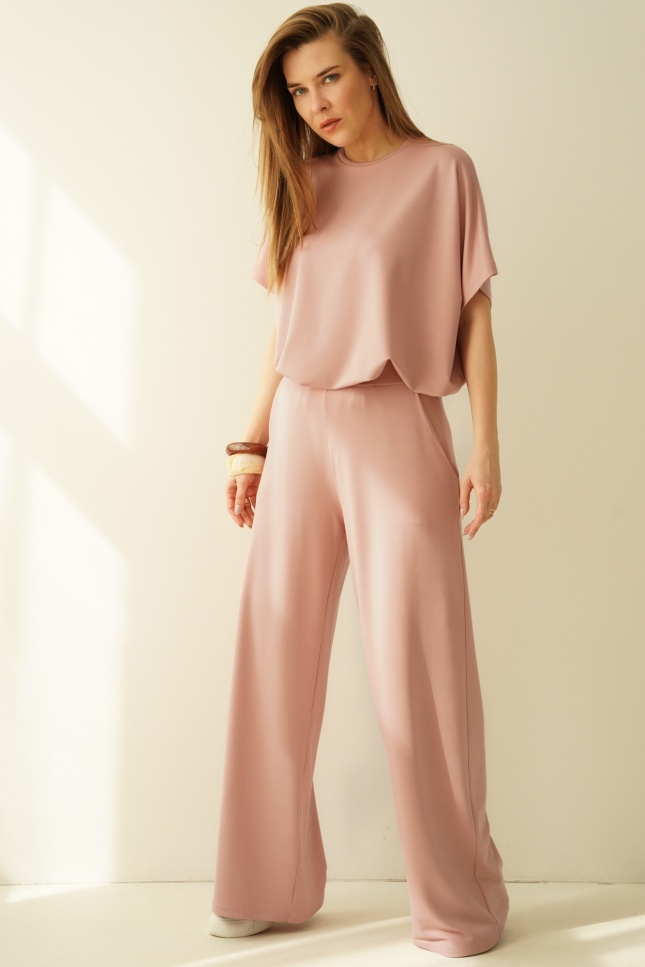 A simple, minimalist set with a loose, comfortable cut. Made of modal, an airy, breathable material that is extremely pleasant to the body. The set consists of a simple blouse with kimono sleeves and trousers with a straight, wide leg with an elastic waistband.