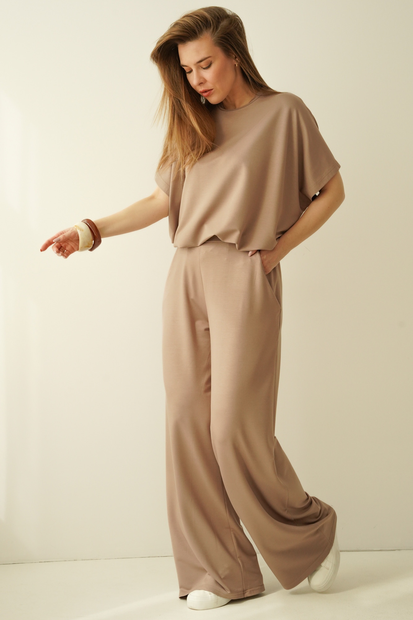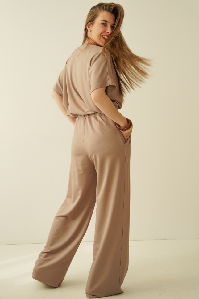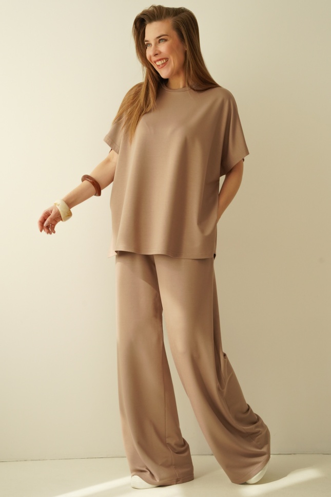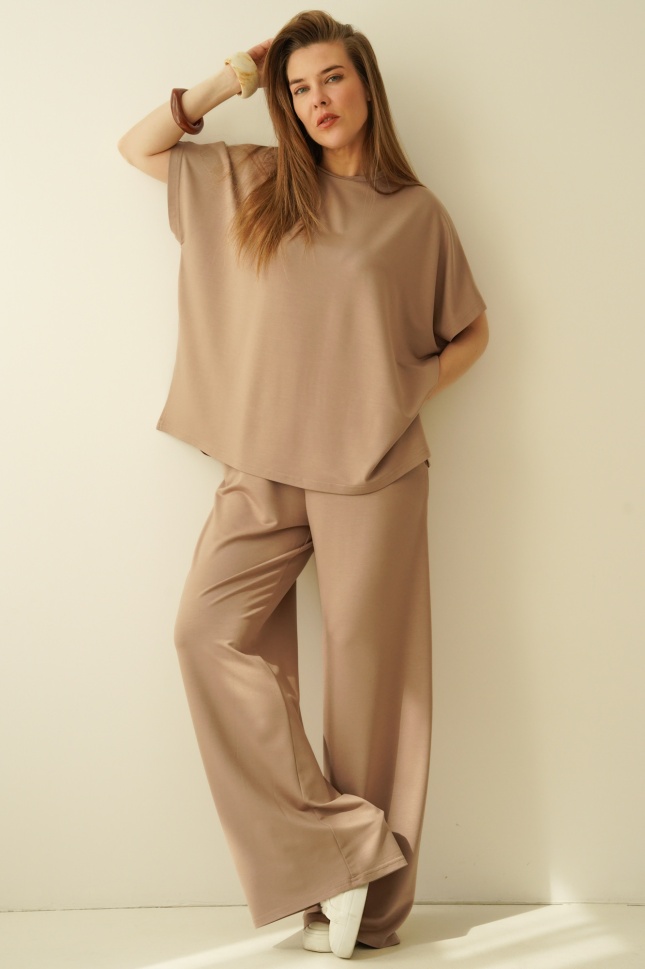 A simple, minimalist set with a loose, comfortable cut. Made of modal, an airy, breathable material that is extremely pleasant to the body. The set consists of a simple blouse with kimono sleeves and trousers with a straight, wide leg with an elastic waistband.