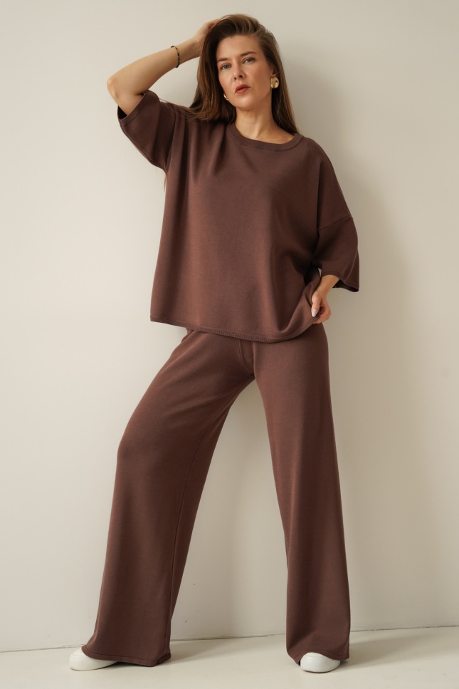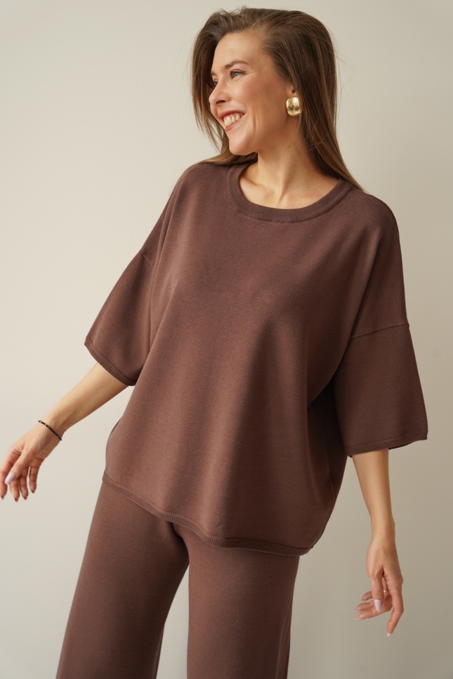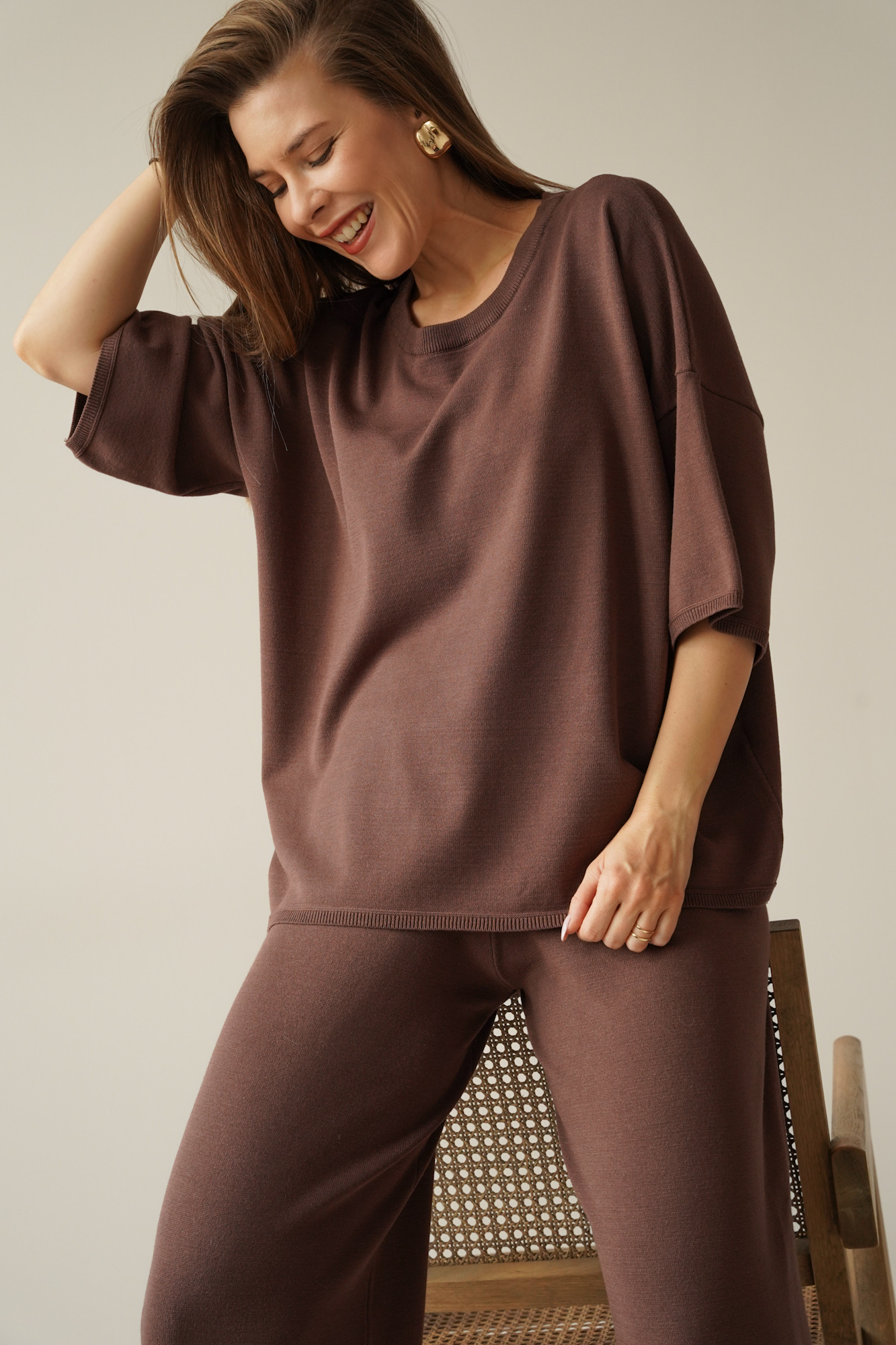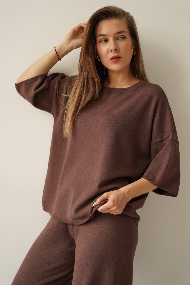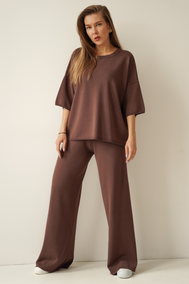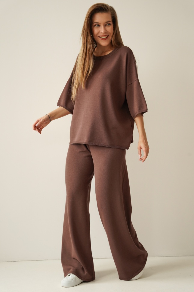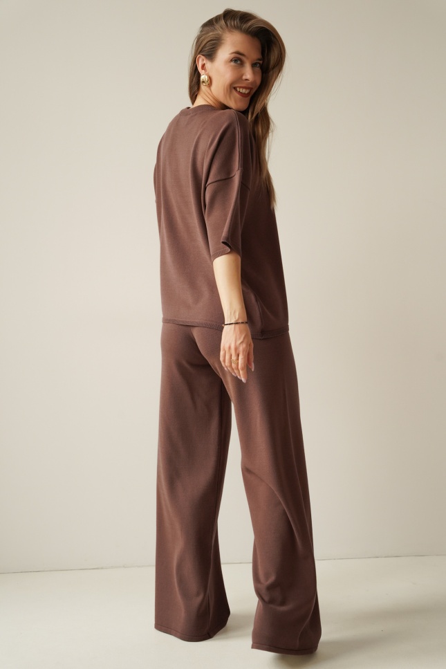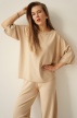 A loose-fitting short-sleeved jumper and wide trousers with an elasticated waistband create a timeless, relaxed silhouette. The soft, breathable fabric drapes beautifully and ensures comfort throughout the day.