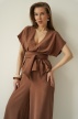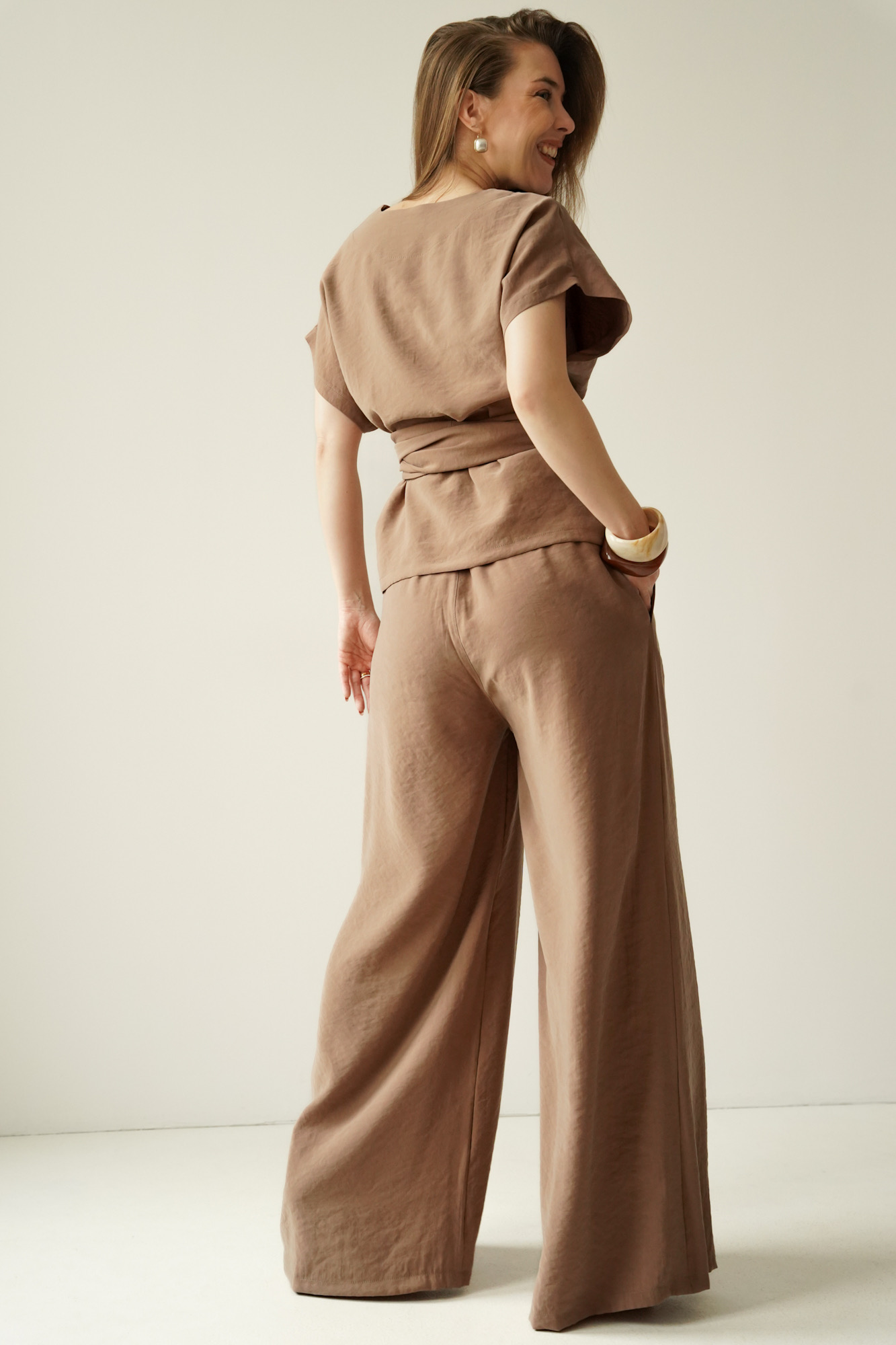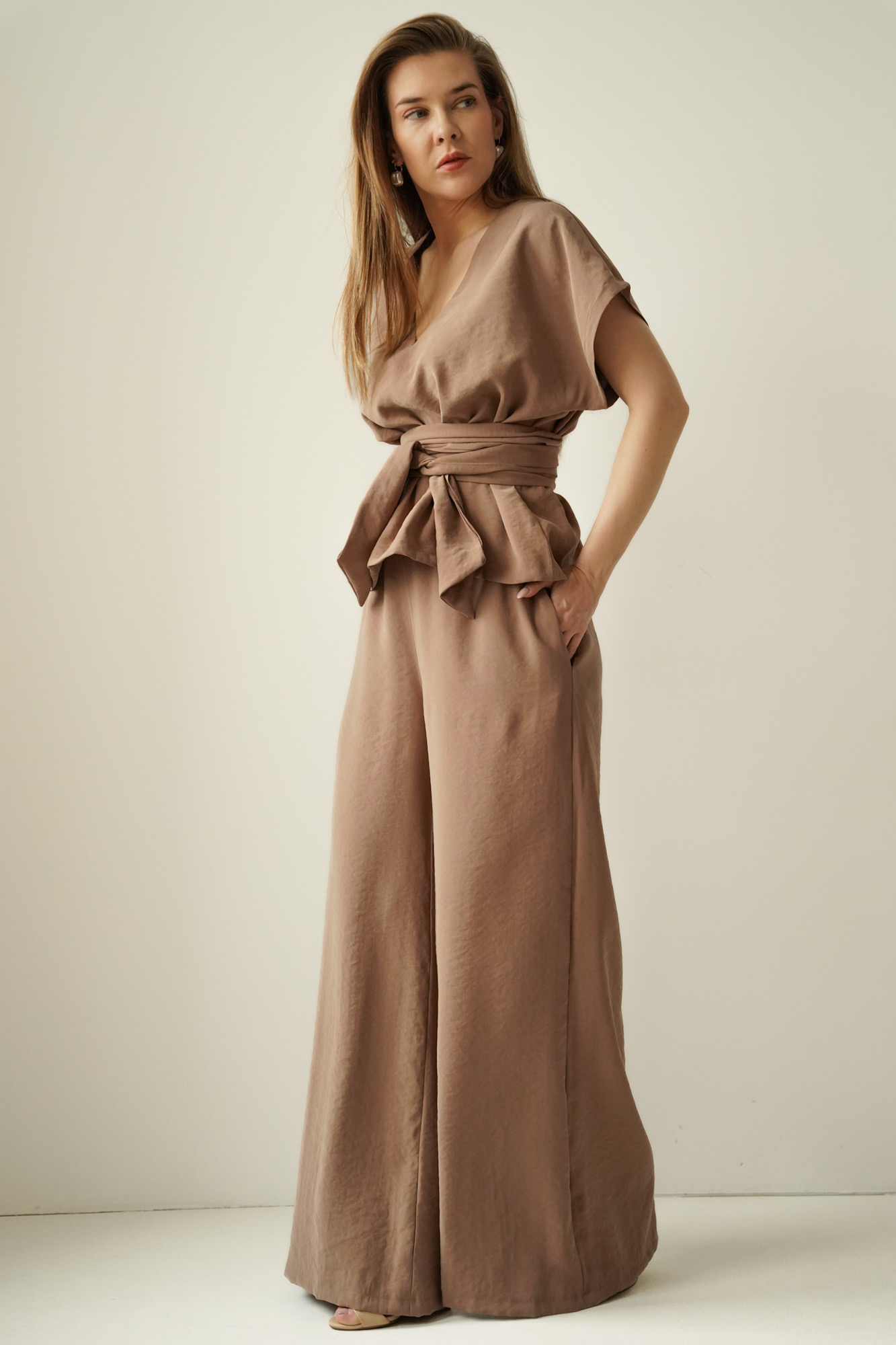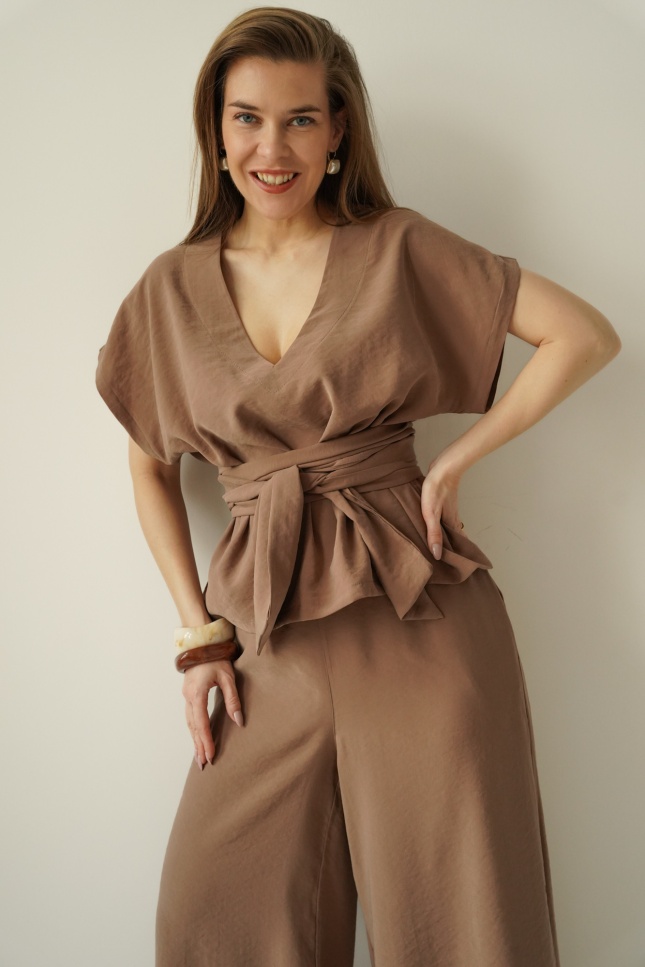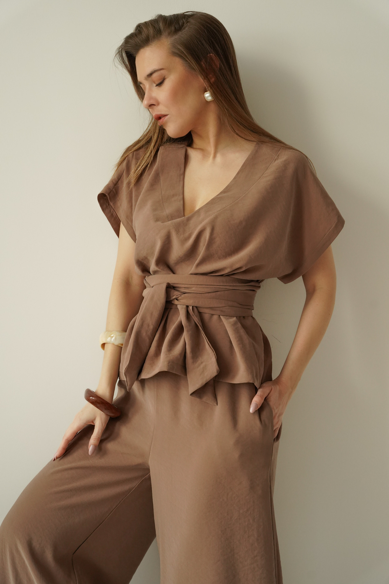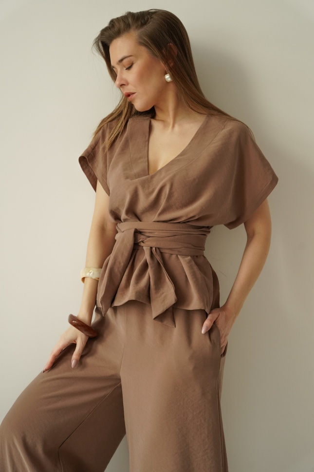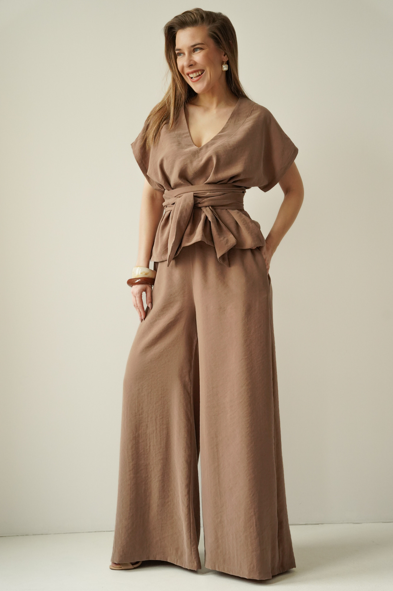 Consisting of simple wide-leg trousers and a V-neck blouse, tied at the waist with a wide, softly draping sash, the set beautifully accentuates the figure without compromising on lightness and ease.