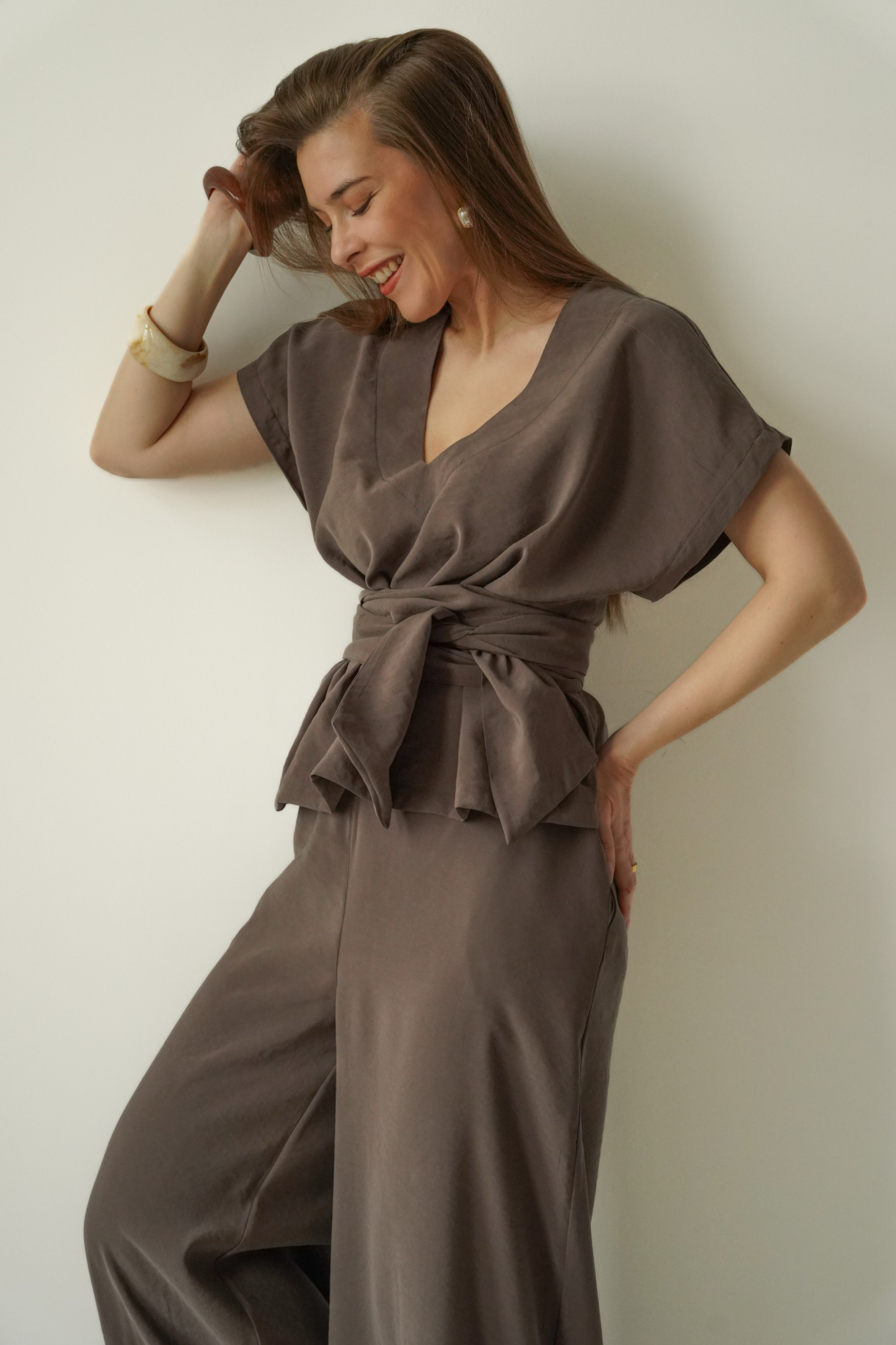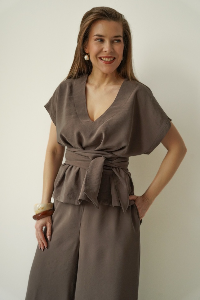 Consisting of simple wide-leg trousers and a V-neck blouse, tied at the waist with a wide, softly draping sash, the set beautifully accentuates the figure without compromising on lightness and ease.