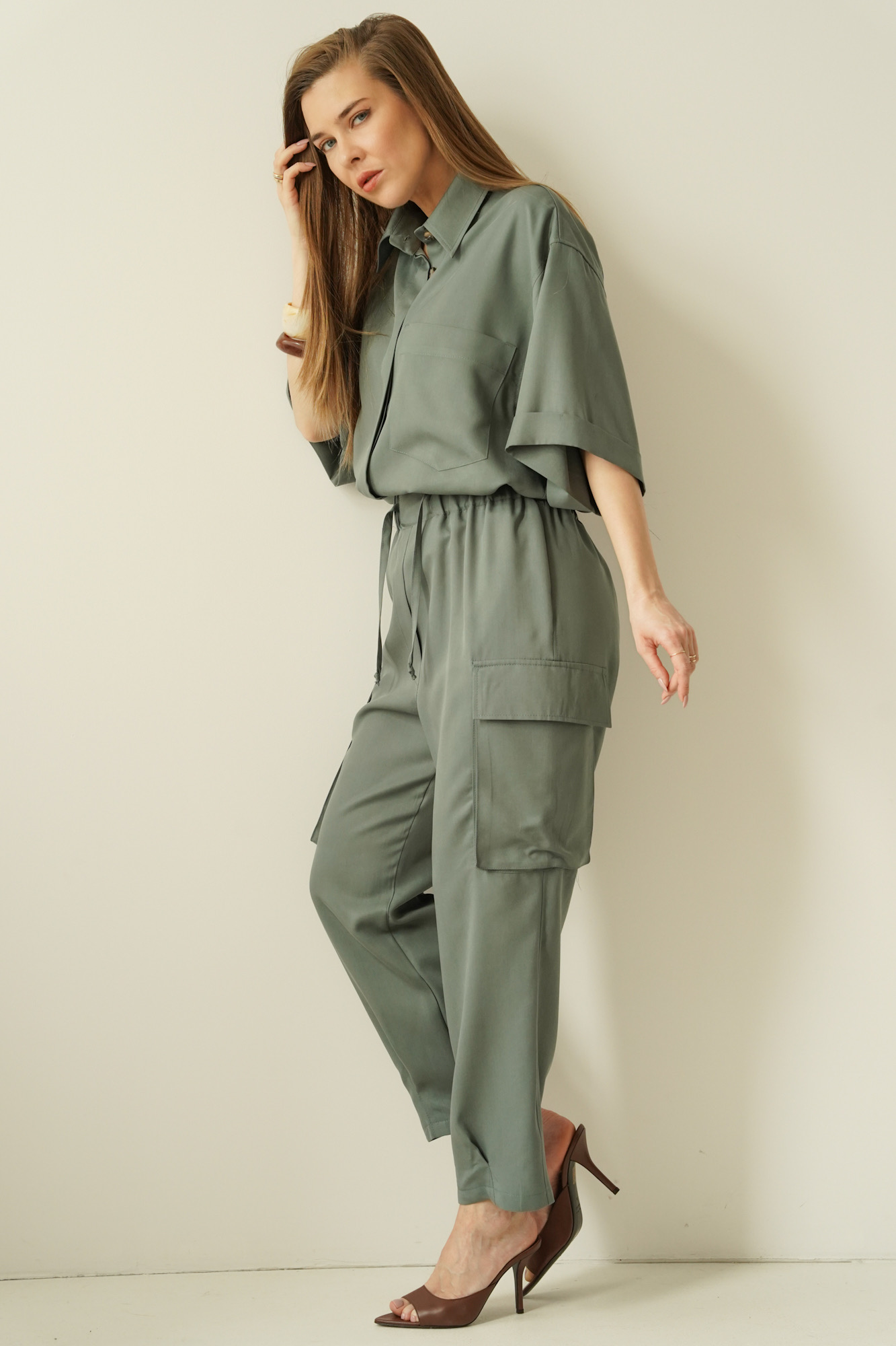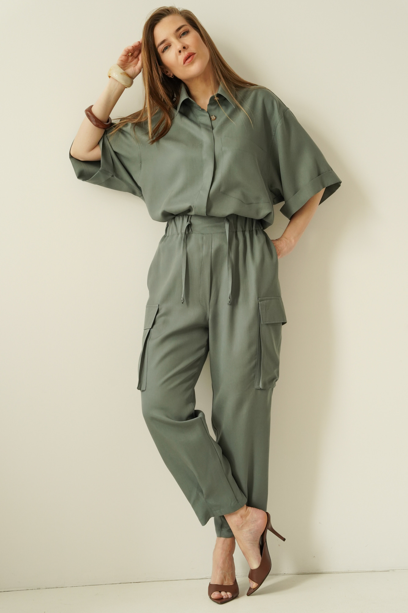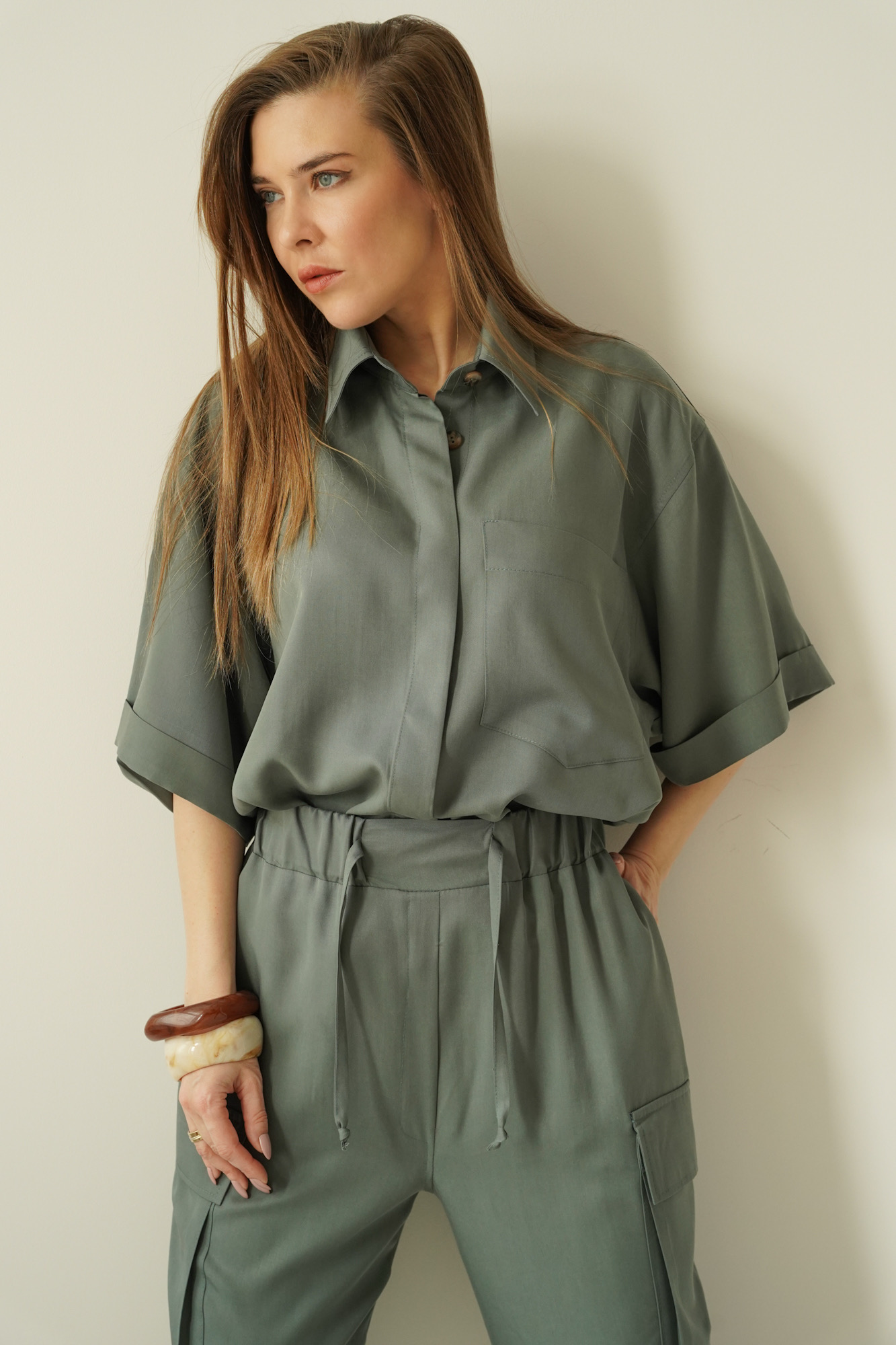 Safari is a casual women’s outfit inspired by safari style, made in a Polish workshop from natural, breathable 100% Tencel fabric. The set comprises a modern boxy shirt and cargo trousers with tapered legs, which give the silhouette a fashionable, urban look. Tencel is soft, breathable and gentle on the skin, making the set perfect for the spring–summer season. The Safari set is the ideal choice for everyday wear, city life, trips and smart-casual outfits. Its timeless design, natural fabric and local production make this a premium set that combines comfort with modern elegance.