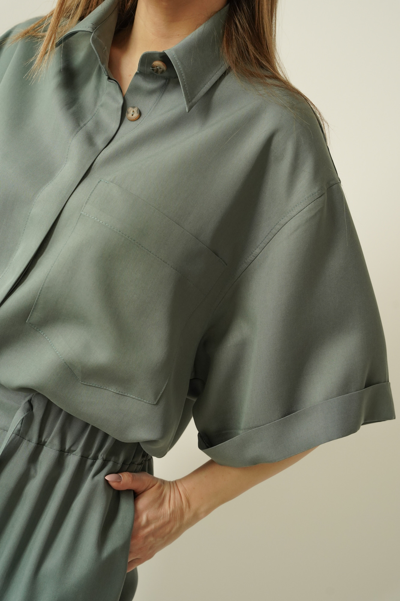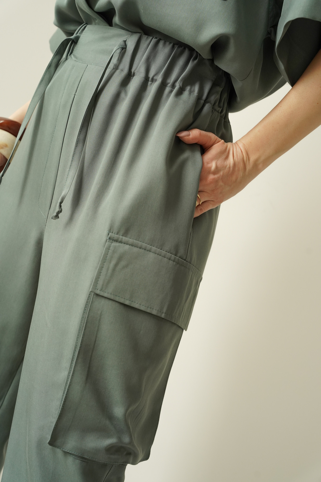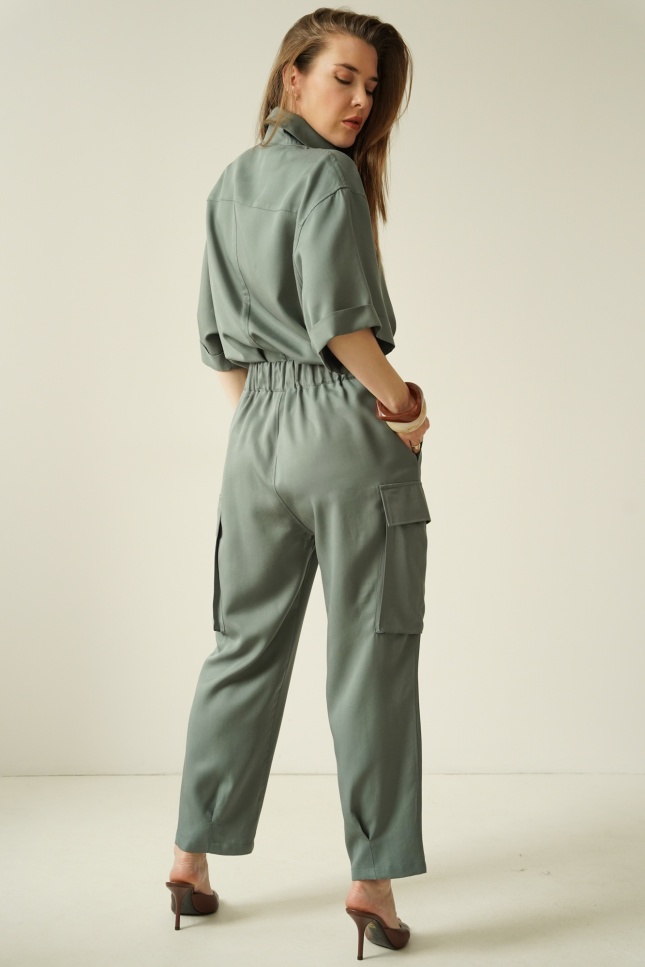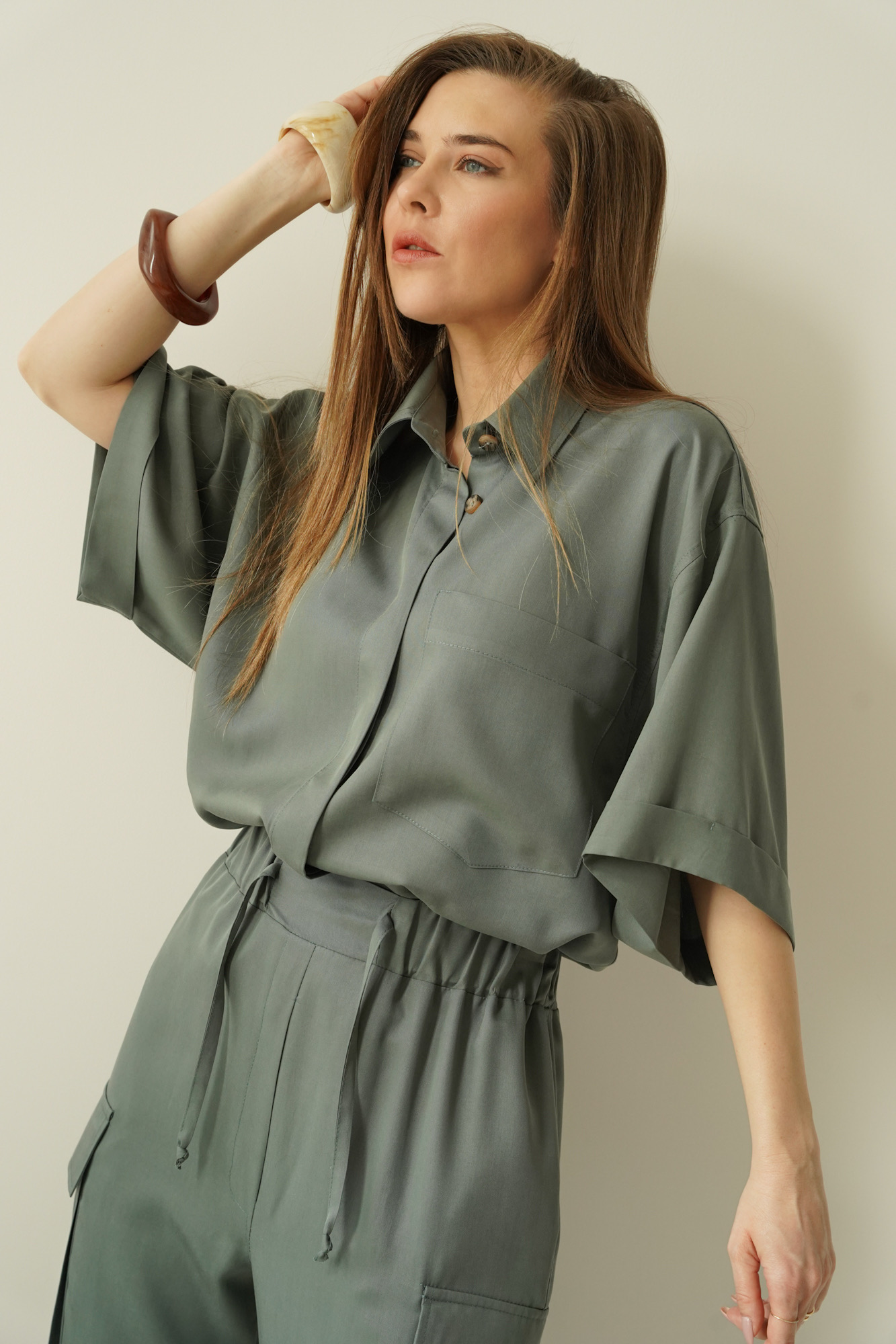 Safari is a casual women’s outfit inspired by safari style, made in a Polish workshop from natural, breathable 100% Tencel fabric. The set comprises a modern boxy shirt and cargo trousers with tapered legs, which give the silhouette a fashionable, urban look. Tencel is soft, breathable and gentle on the skin, making the set perfect for the spring–summer season. The Safari set is the ideal choice for everyday wear, city life, trips and smart-casual outfits. Its timeless design, natural fabric and local production make this a premium set that combines comfort with modern elegance.
