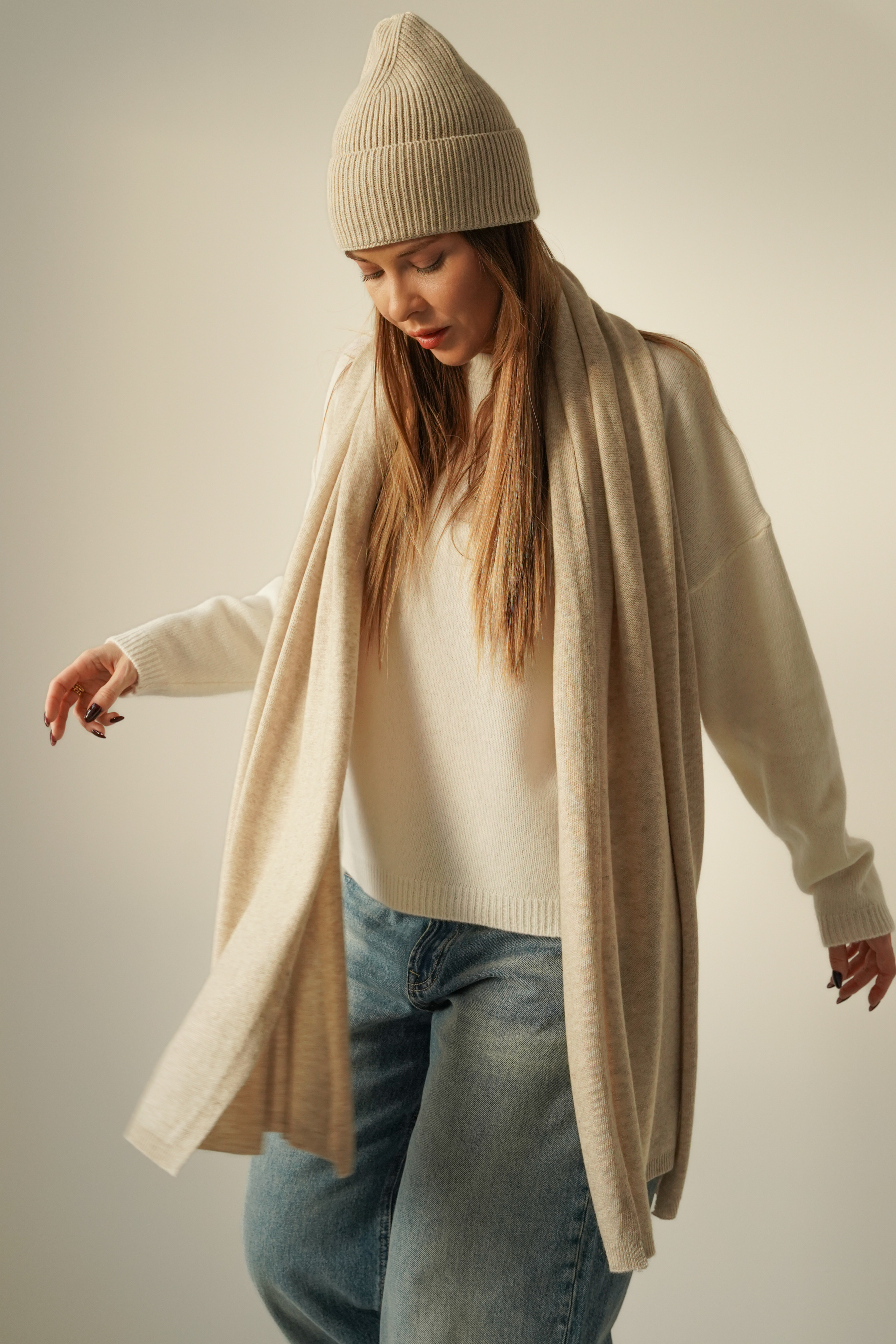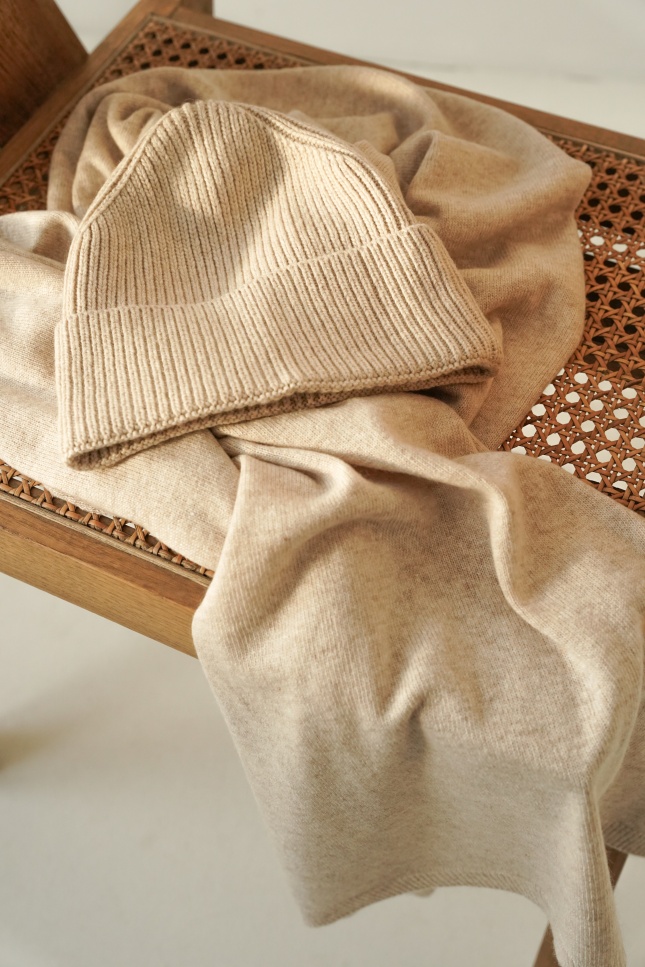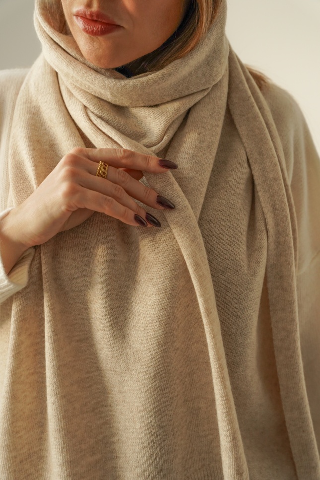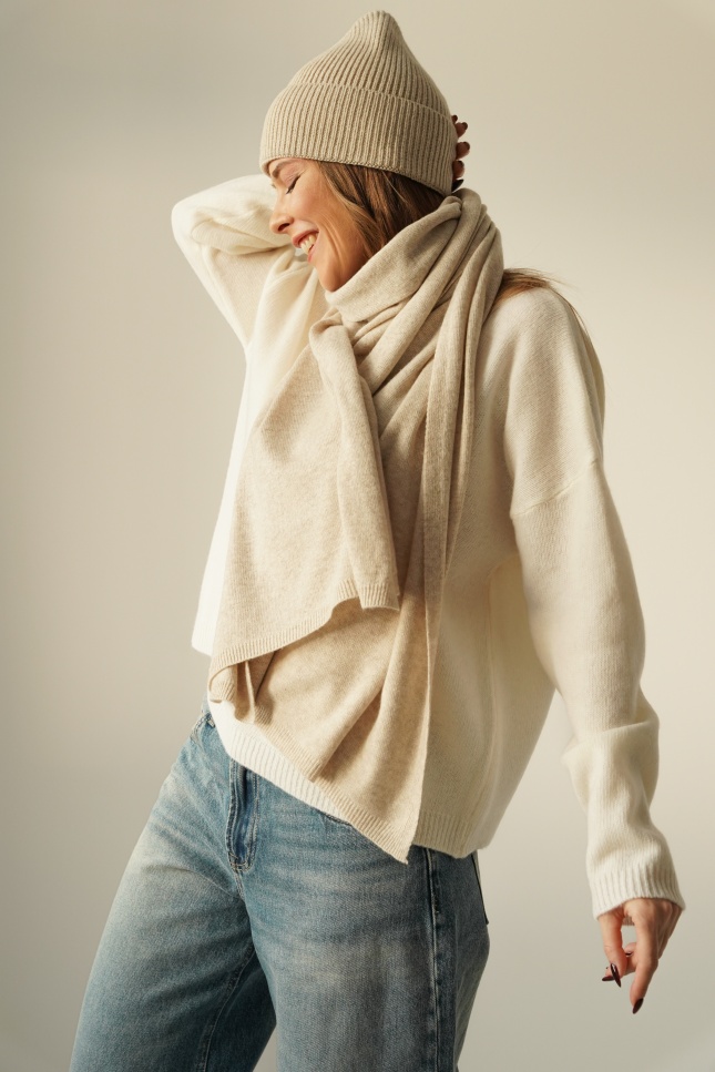 PURE WARM is a luxurious winter set – a hat and a wide, thick scarf made of a blend of cashmere (50%) and merino wool (50%). Soft, exceptionally warm and gentle on the skin. A timeless model that will complement any winter outfit in the spirit of quiet luxury.
