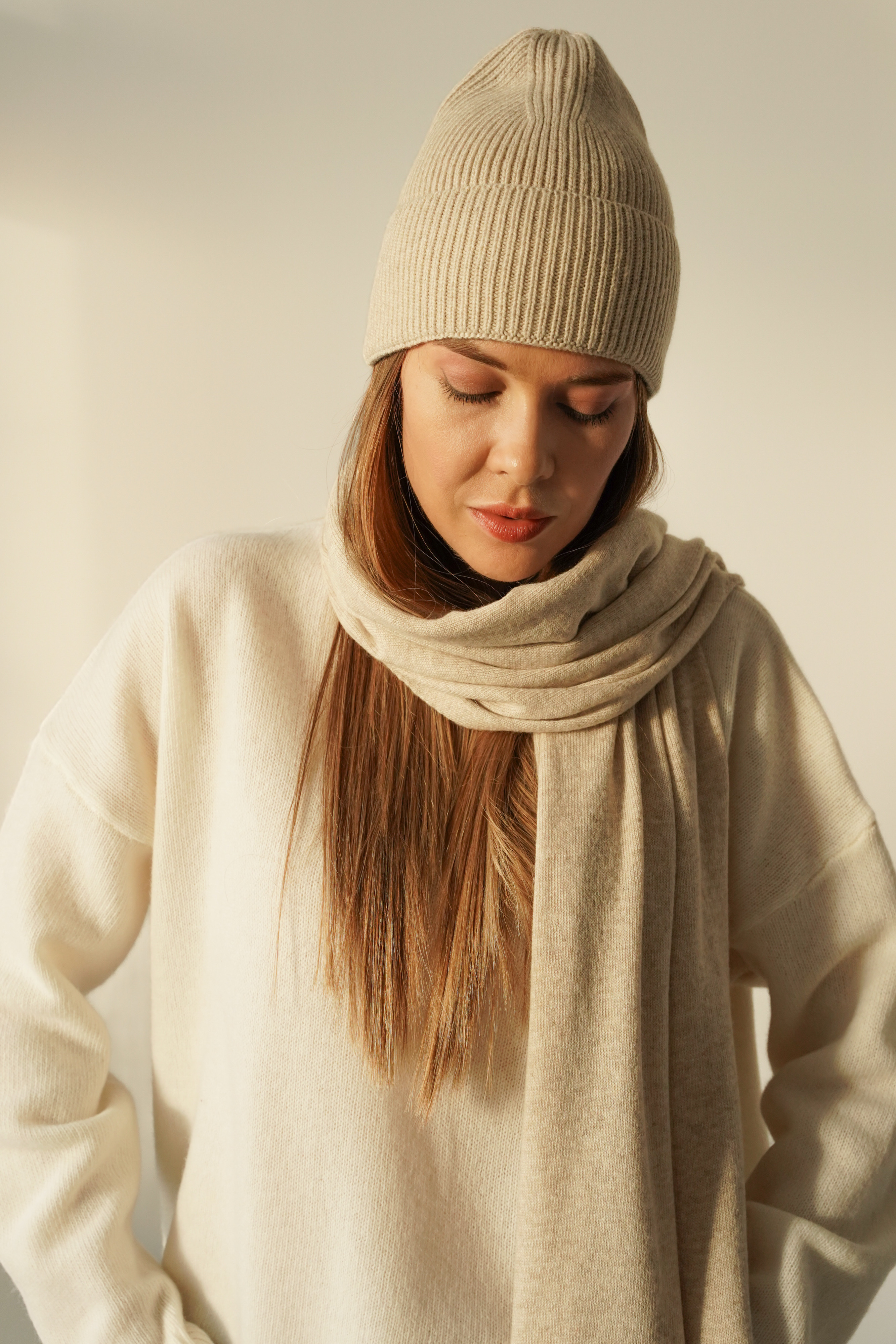 Set of hat and scarf with cashmere and Pure Warm merino wool beige