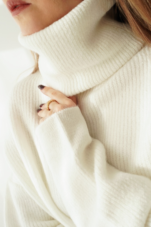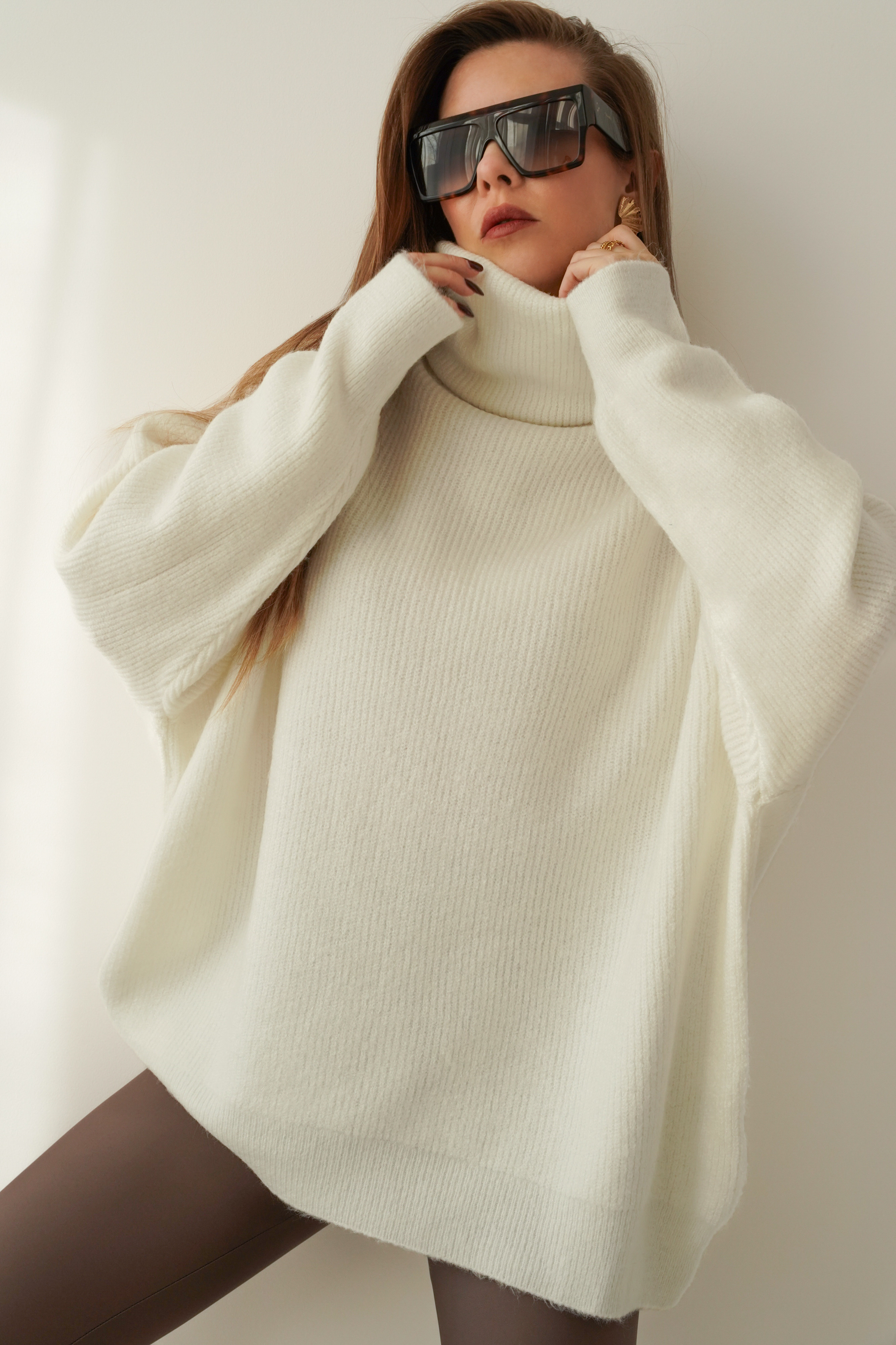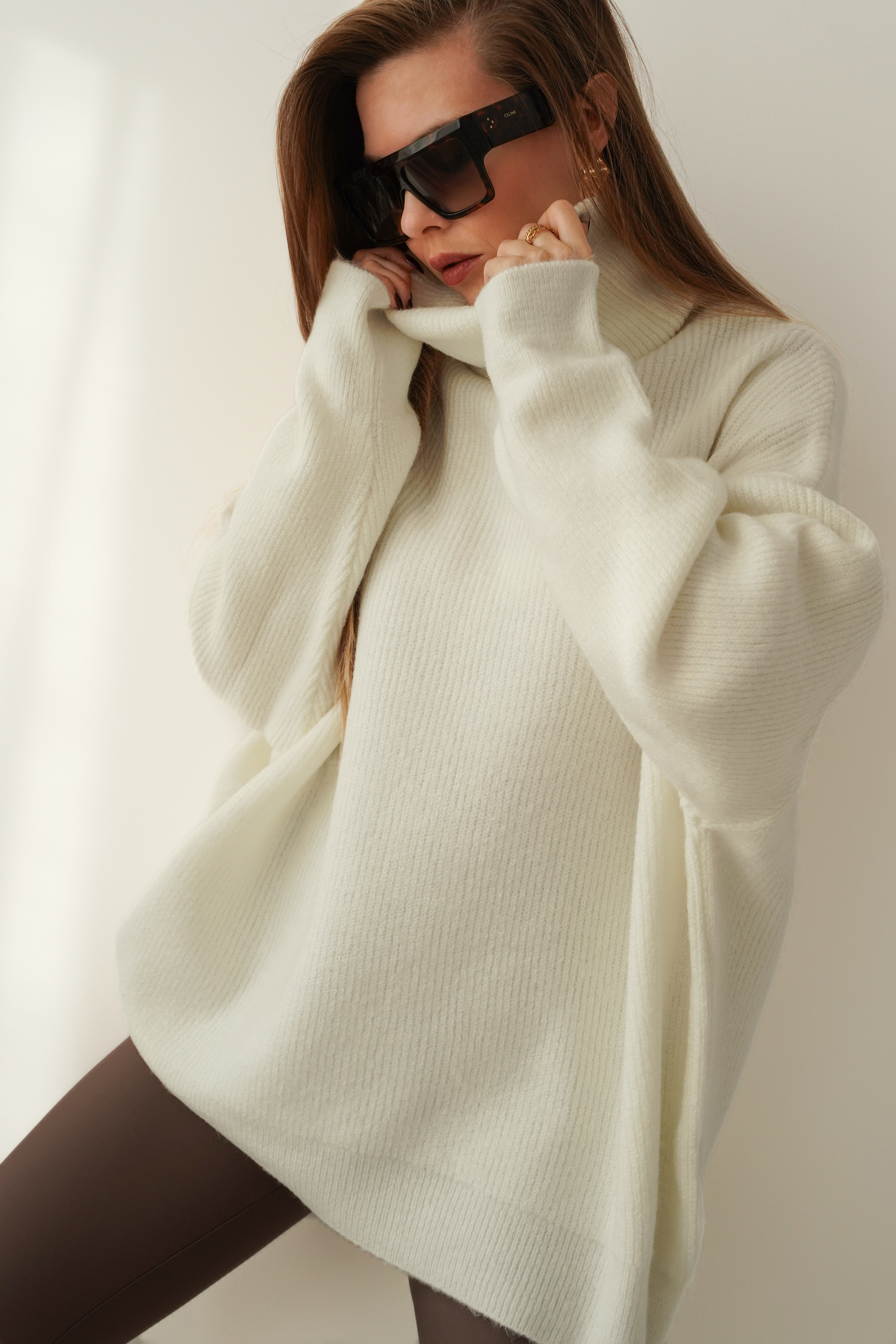 A soft, oversized jumper with a loose fit and a high turtleneck, made from luxurious baby alpaca and wool yarn. The fine ribbing gives it a subtle elegance, and the classic cut makes it suitable for both jeans and leggings. ‘Après’ is a timeless model that envelops you in warmth and fits in with the aesthetics of modern minimalism.