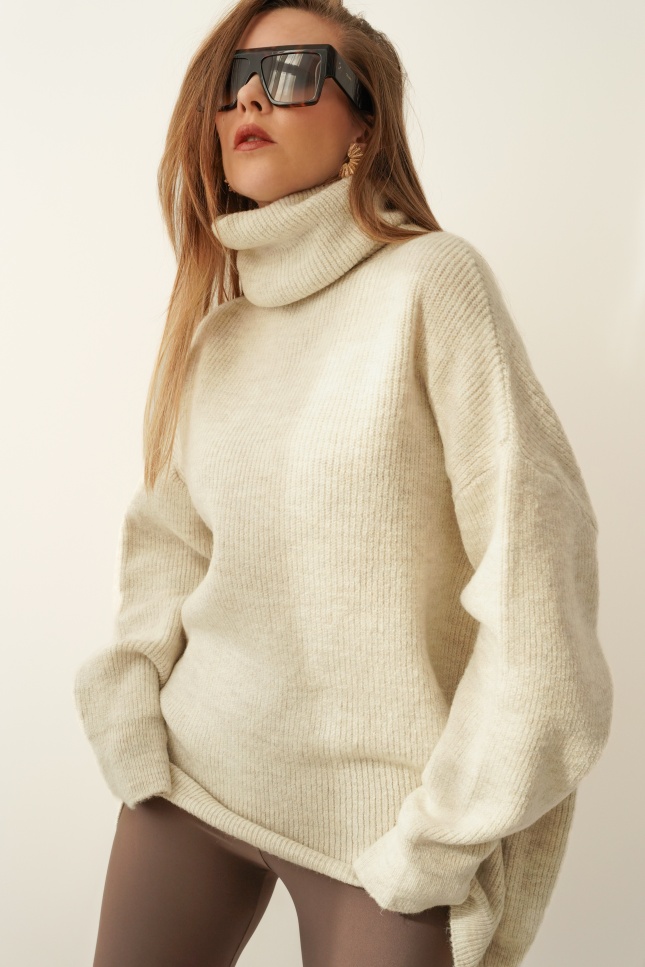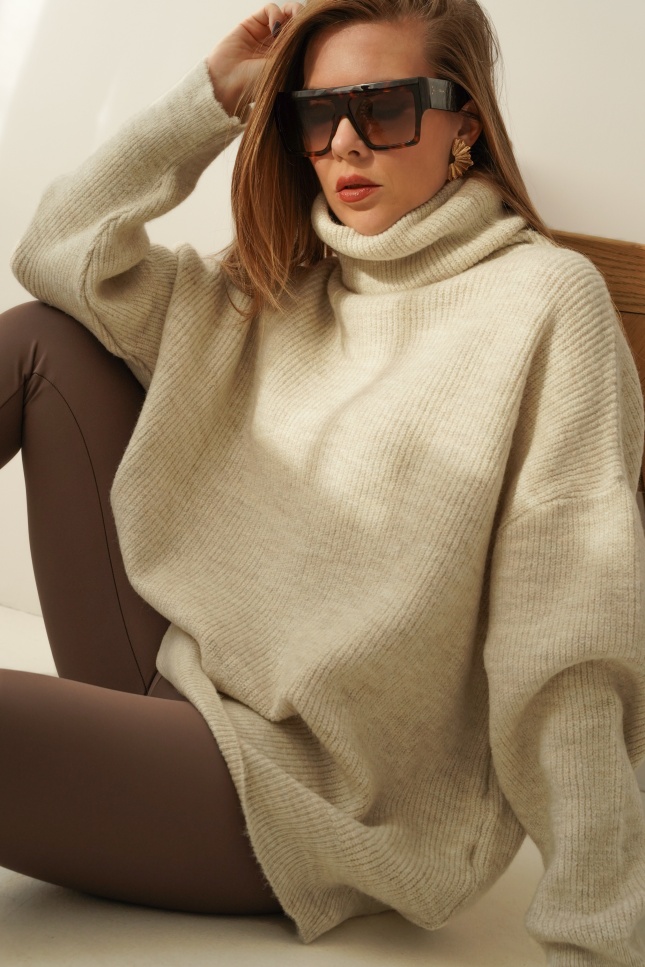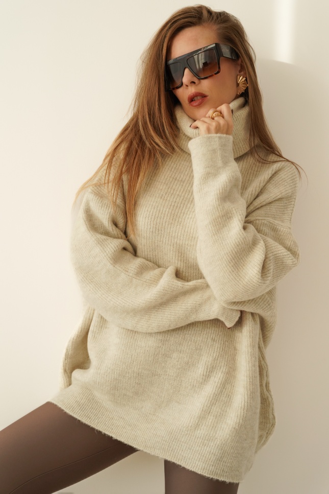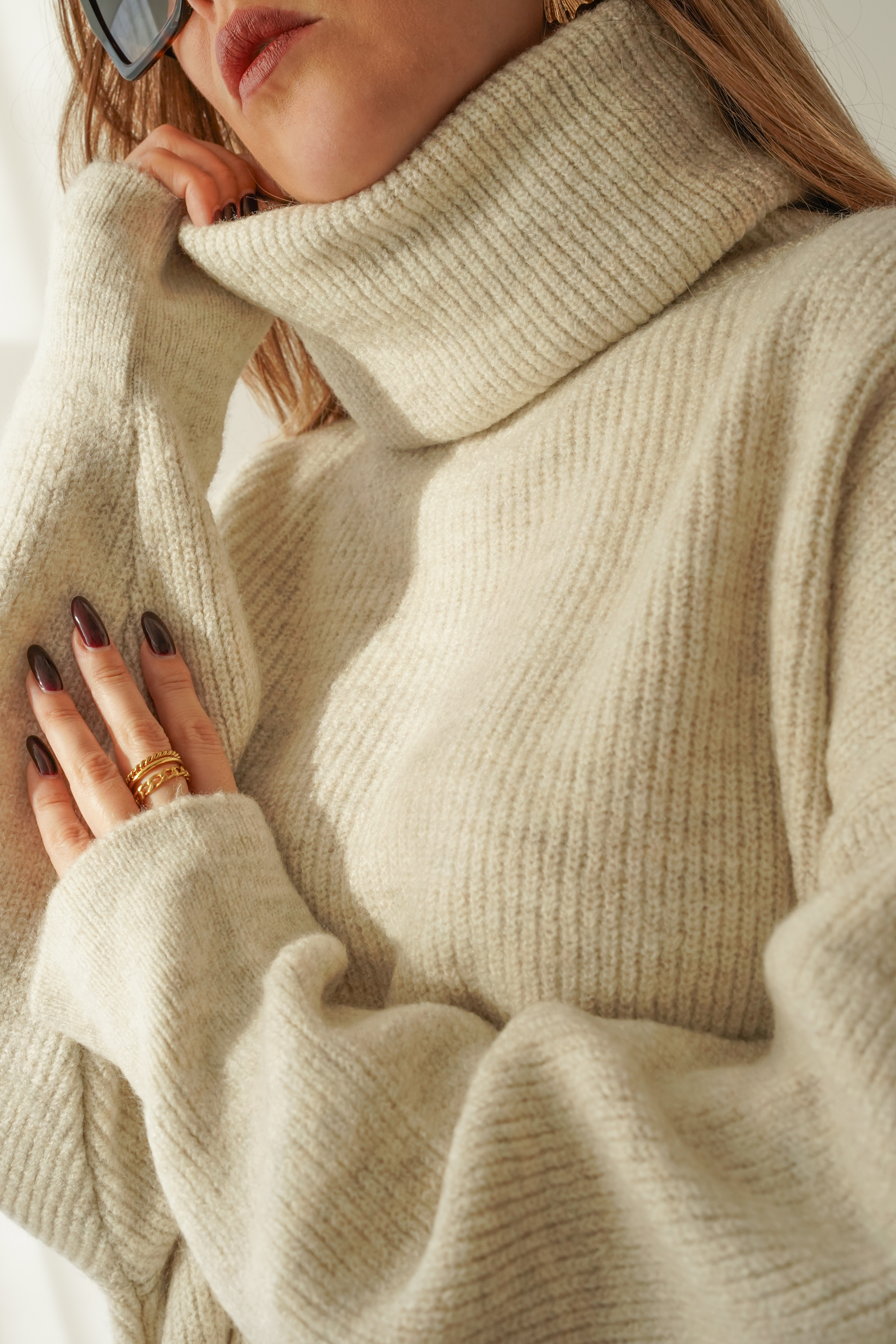 A soft, oversized jumper with a loose fit and a high turtleneck, made from luxurious baby alpaca and wool yarn. The fine ribbing gives it a subtle elegance, and the classic cut makes it suitable for both jeans and leggings. ‘Après’ is a timeless model that envelops you in warmth and fits in with the aesthetics of modern minimalism.