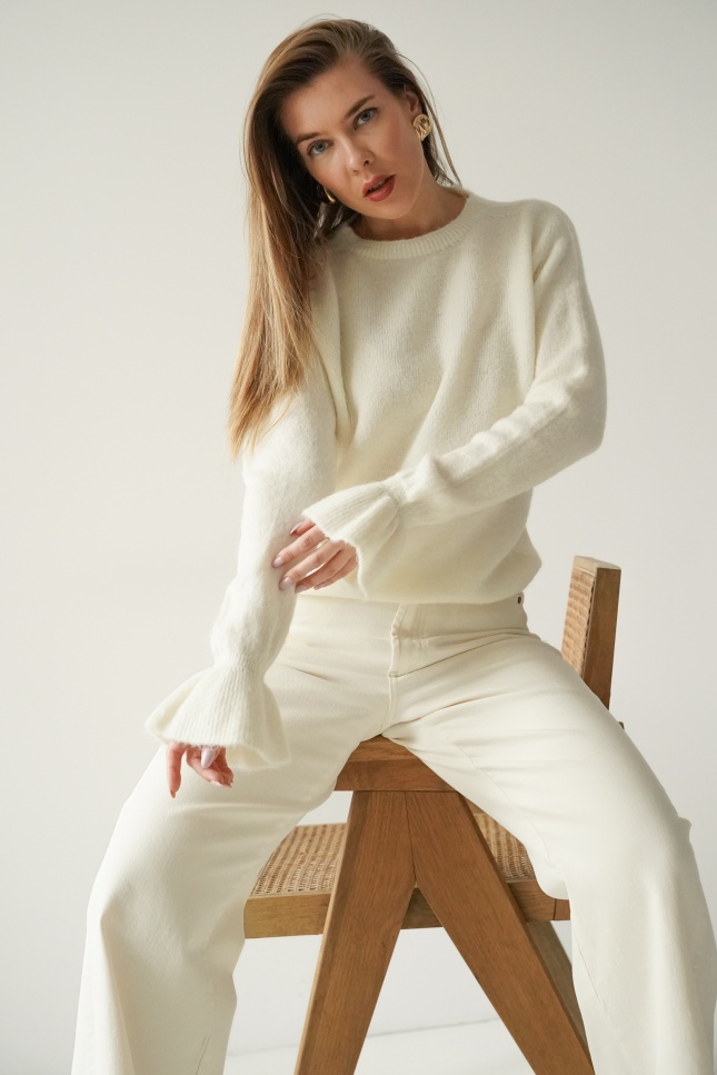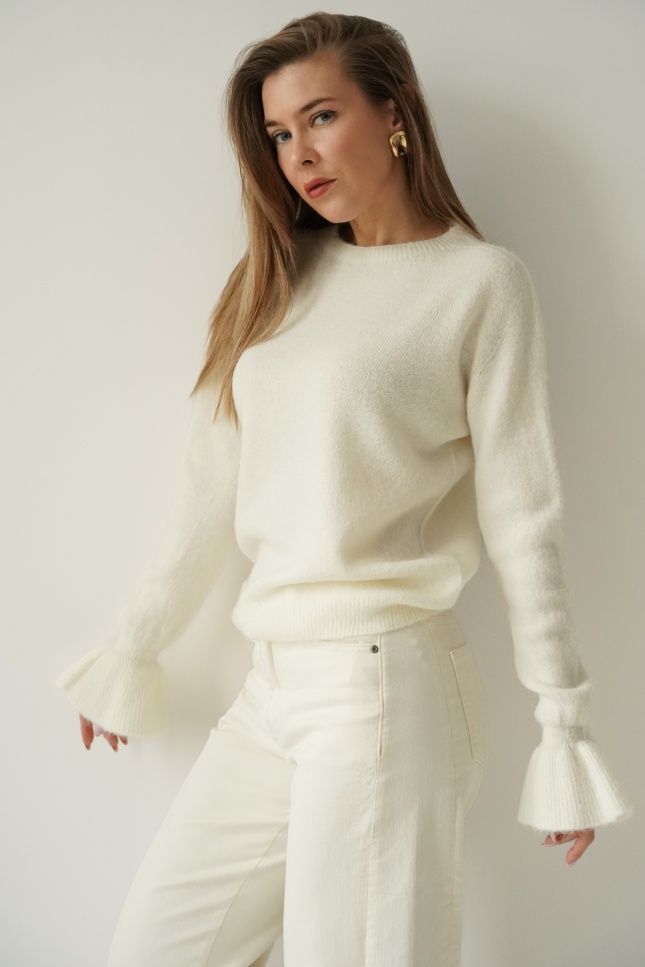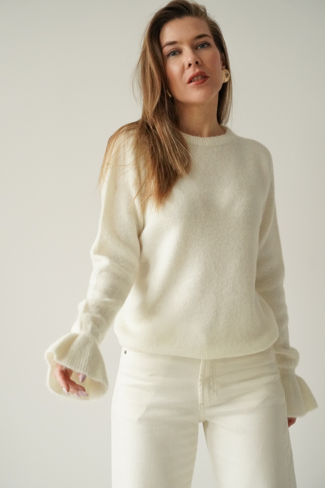 A soft jumper with frills on the sleeves, made from a luxurious blend of baby alpaca (48%) and virgin wool (28%). Lightweight, warm and exceptionally pleasant to the skin. A feminine style that works well with both everyday and more elegant outfits.
