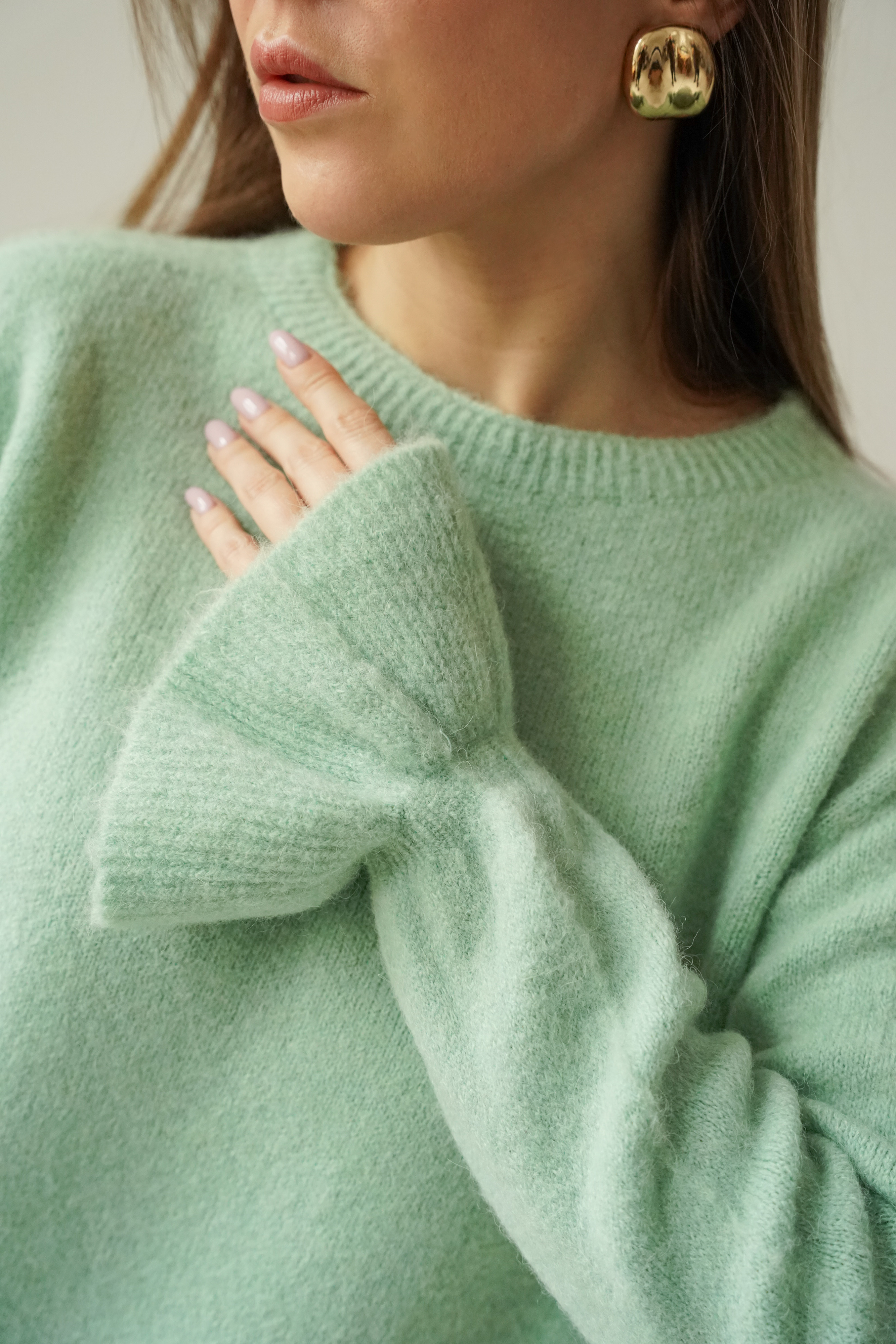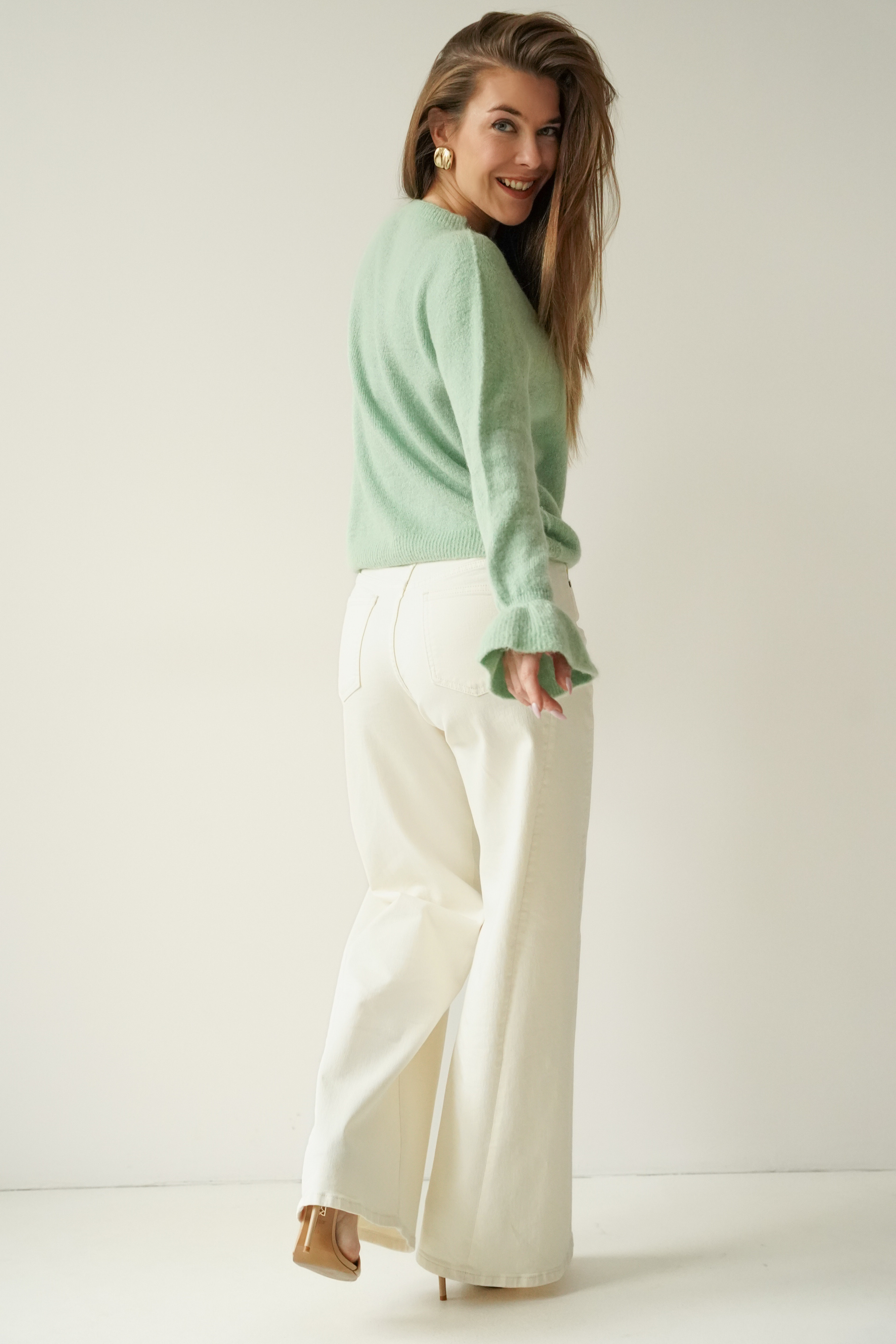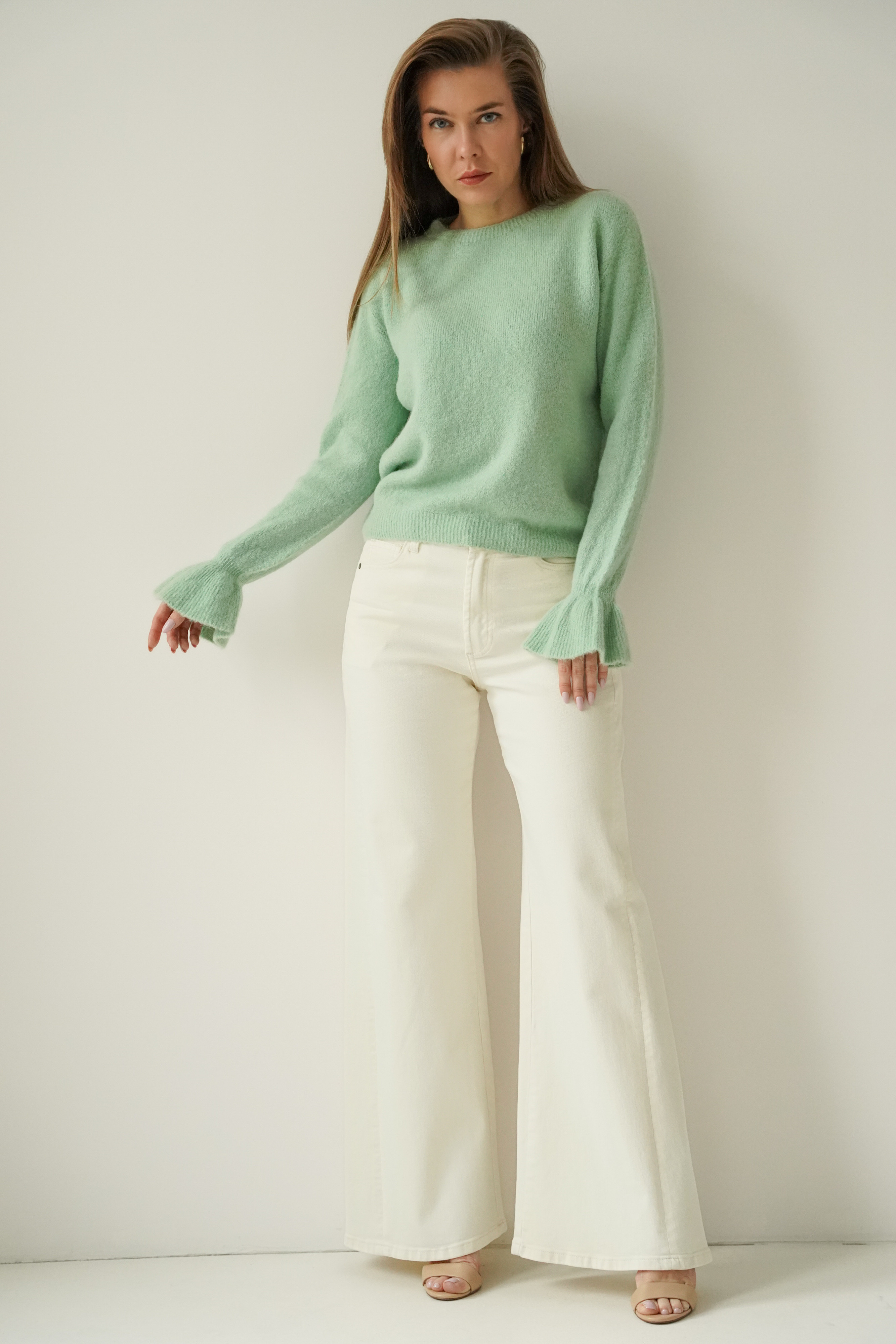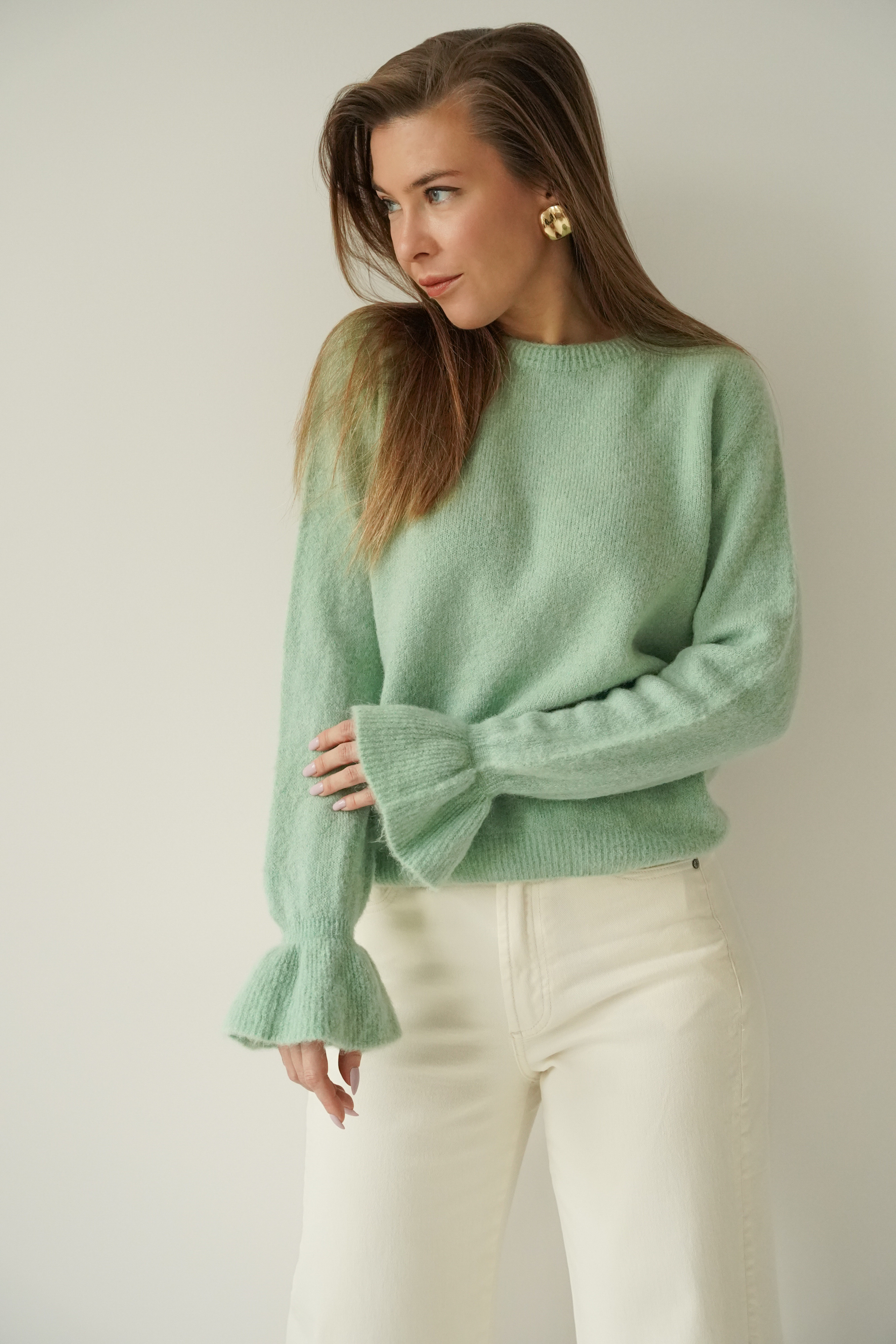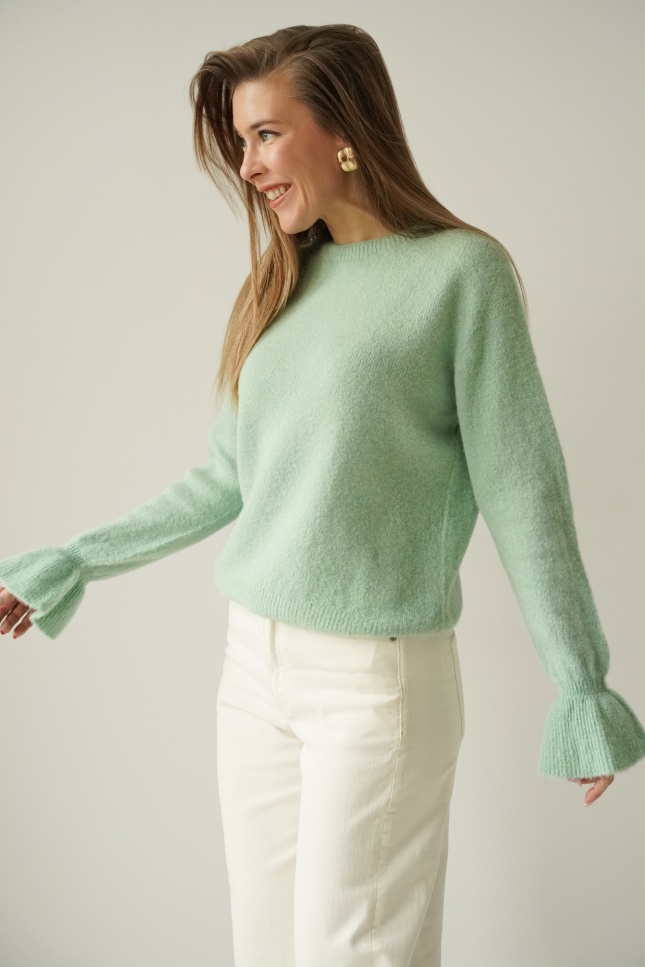 A soft jumper with frills on the sleeves, made from a luxurious blend of baby alpaca (48%) and virgin wool (28%). Lightweight, warm and exceptionally pleasant to the skin. A feminine style that works well with both everyday and more elegant outfits.