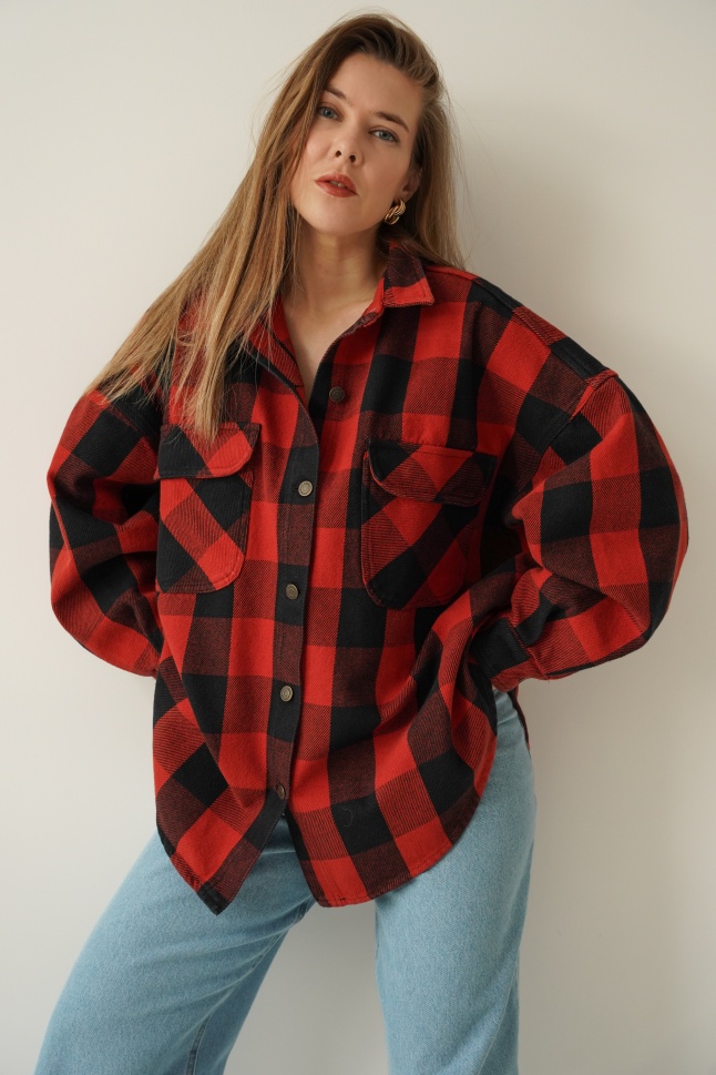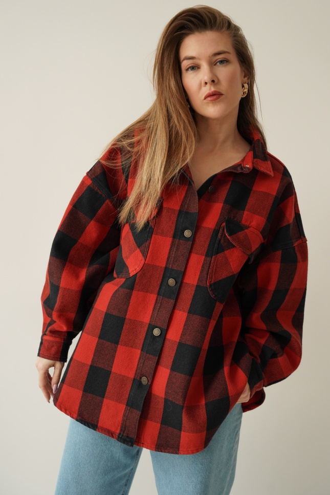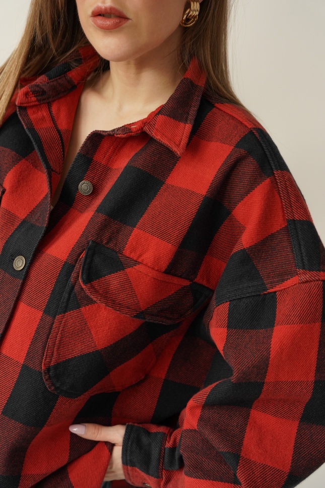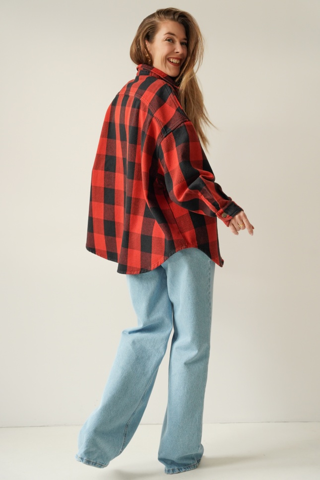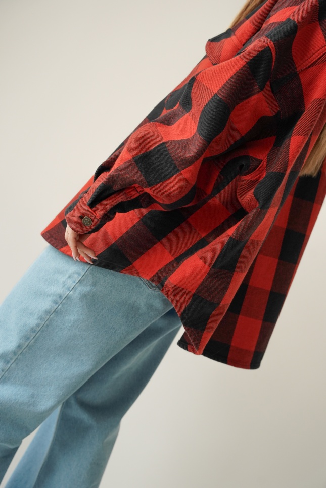 Urban streetwear denim jacket with black and red check pattern