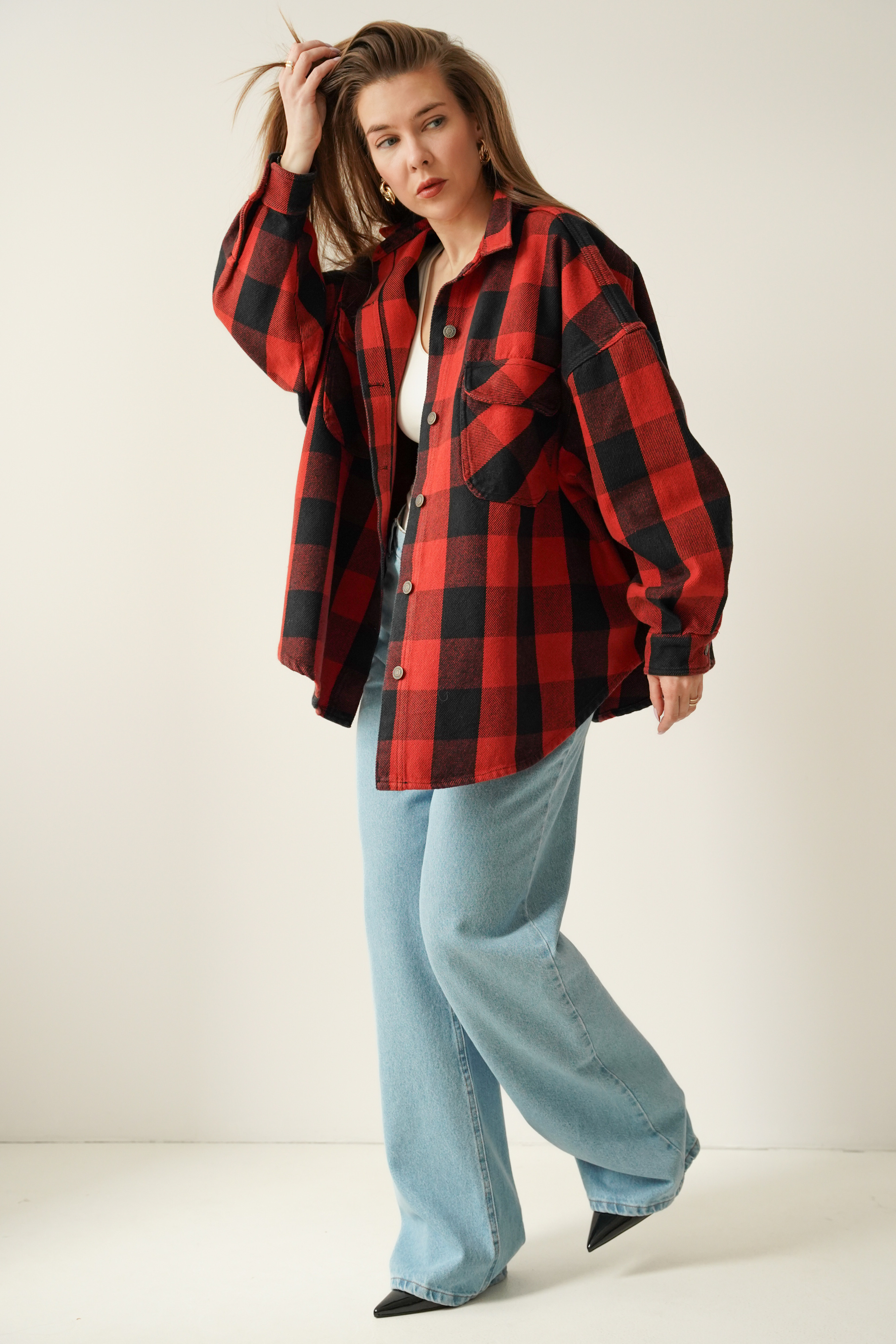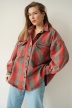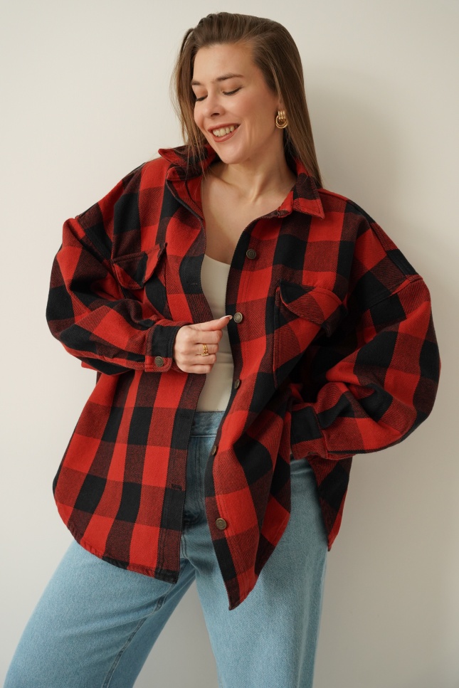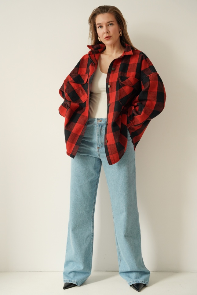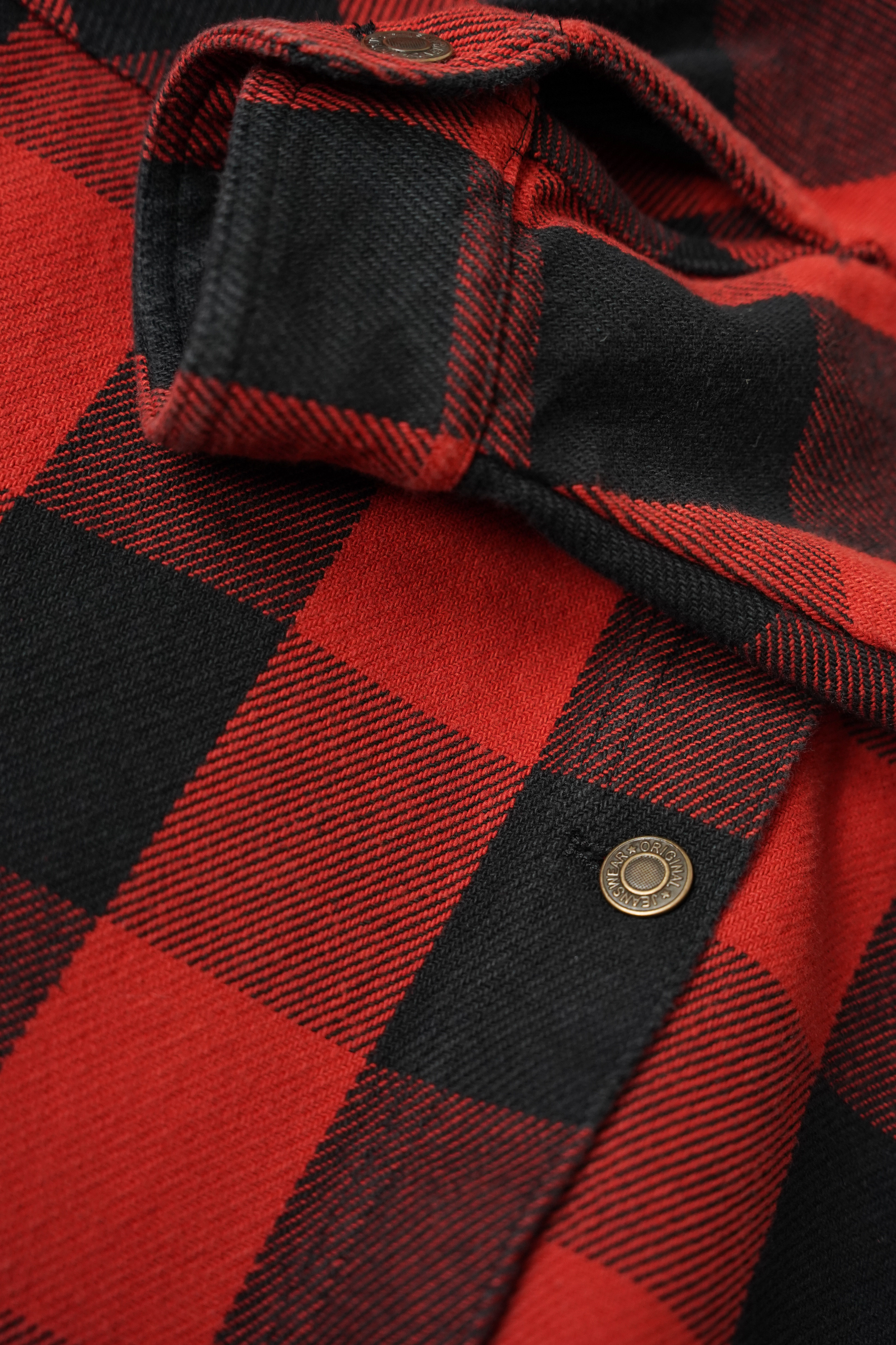 Urban streetwear denim jacket with black and red check pattern