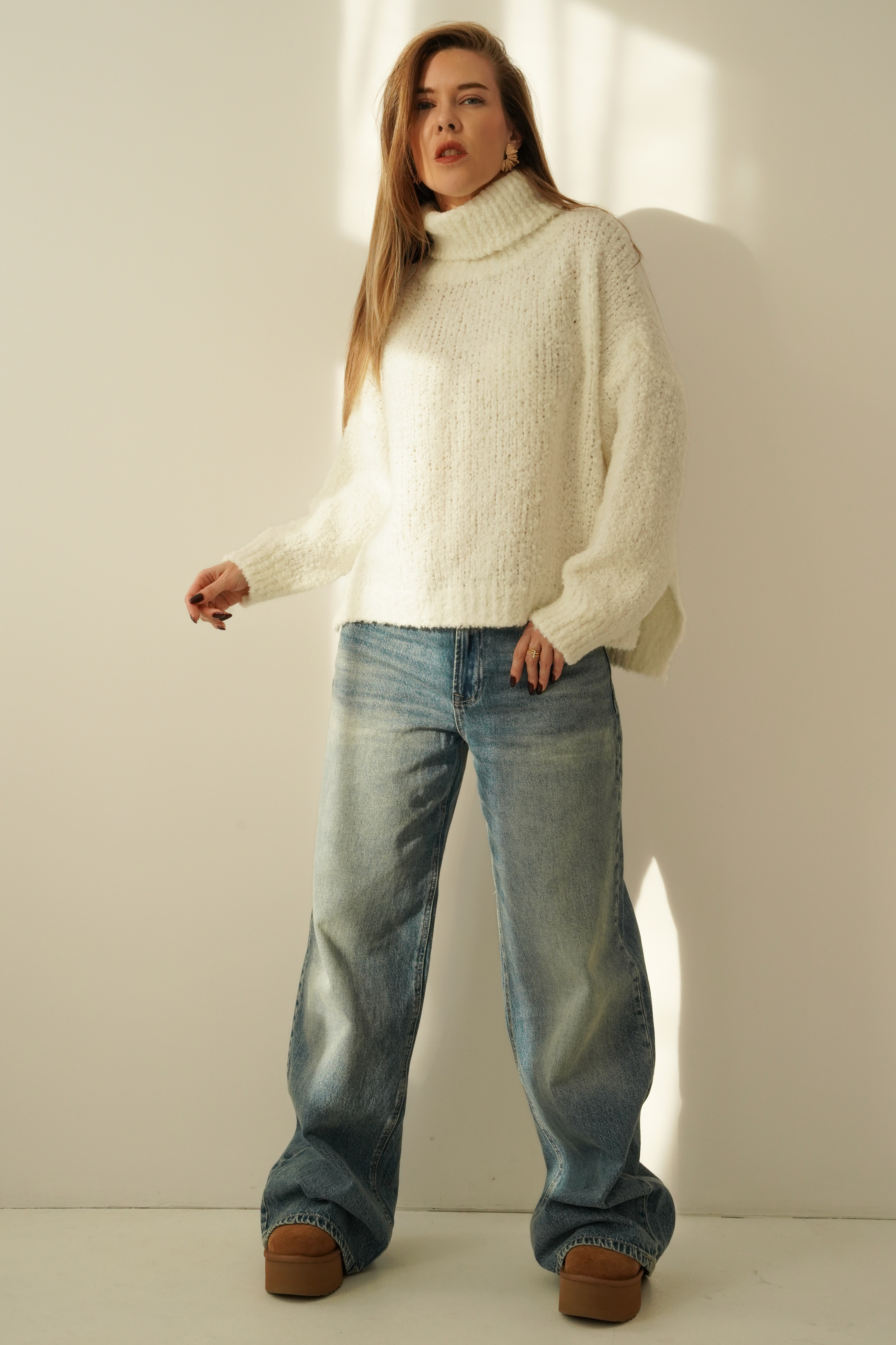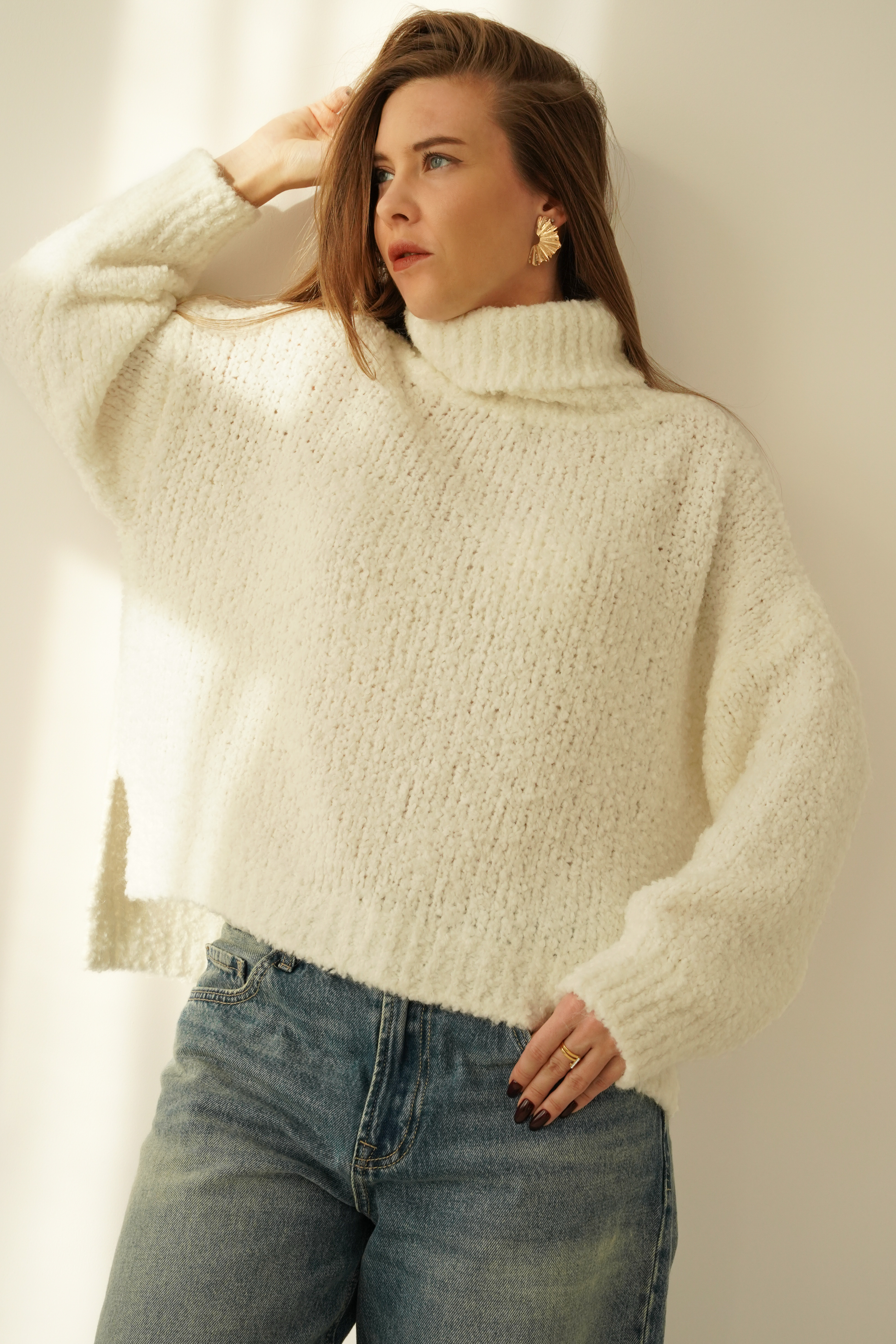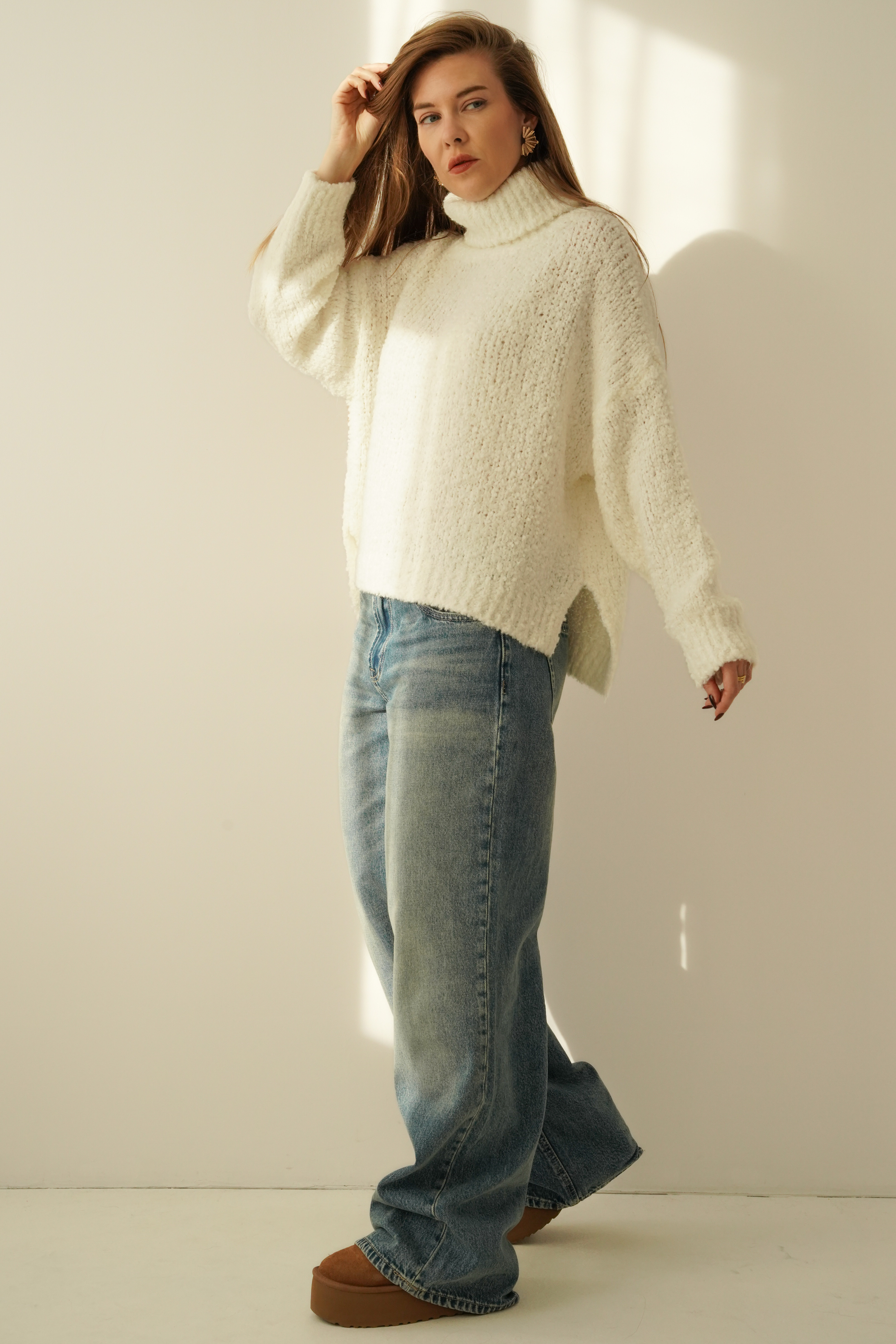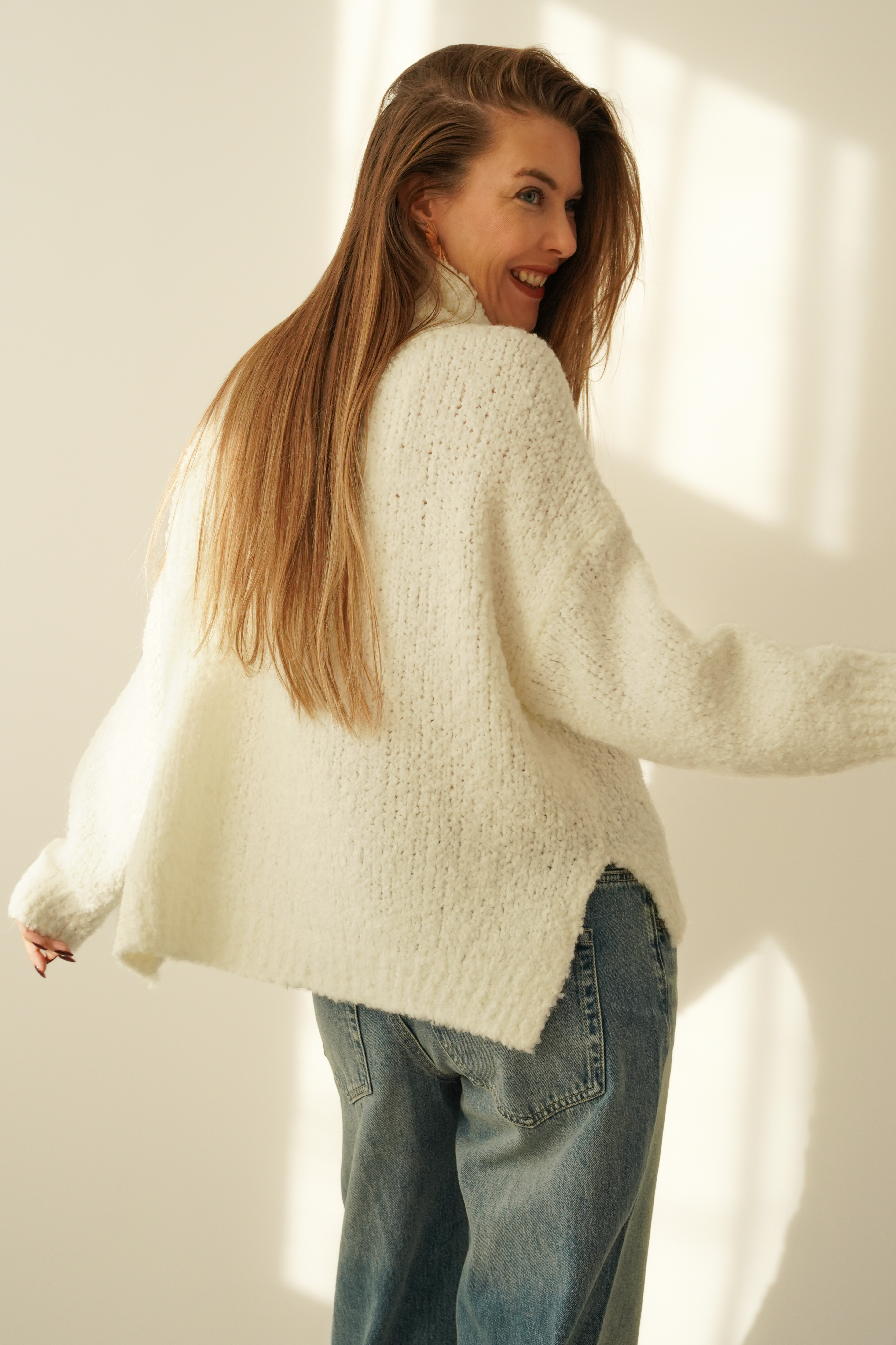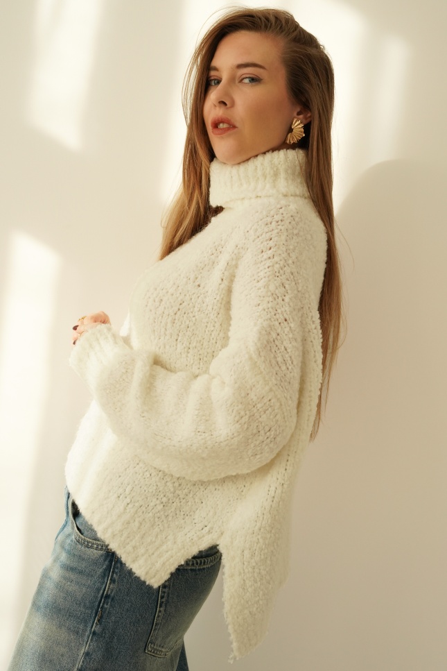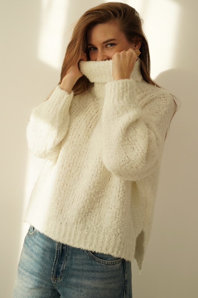 A soft,  turtleneck made of bouclé yarn, which gives it exceptional fluffiness and cosiness. It has a slightly elongated back and a loose fit that drapes beautifully over the figure. ‘Aspen’ is the essence of winter comfort – perfect for cold days, urban styling and mountain trips.