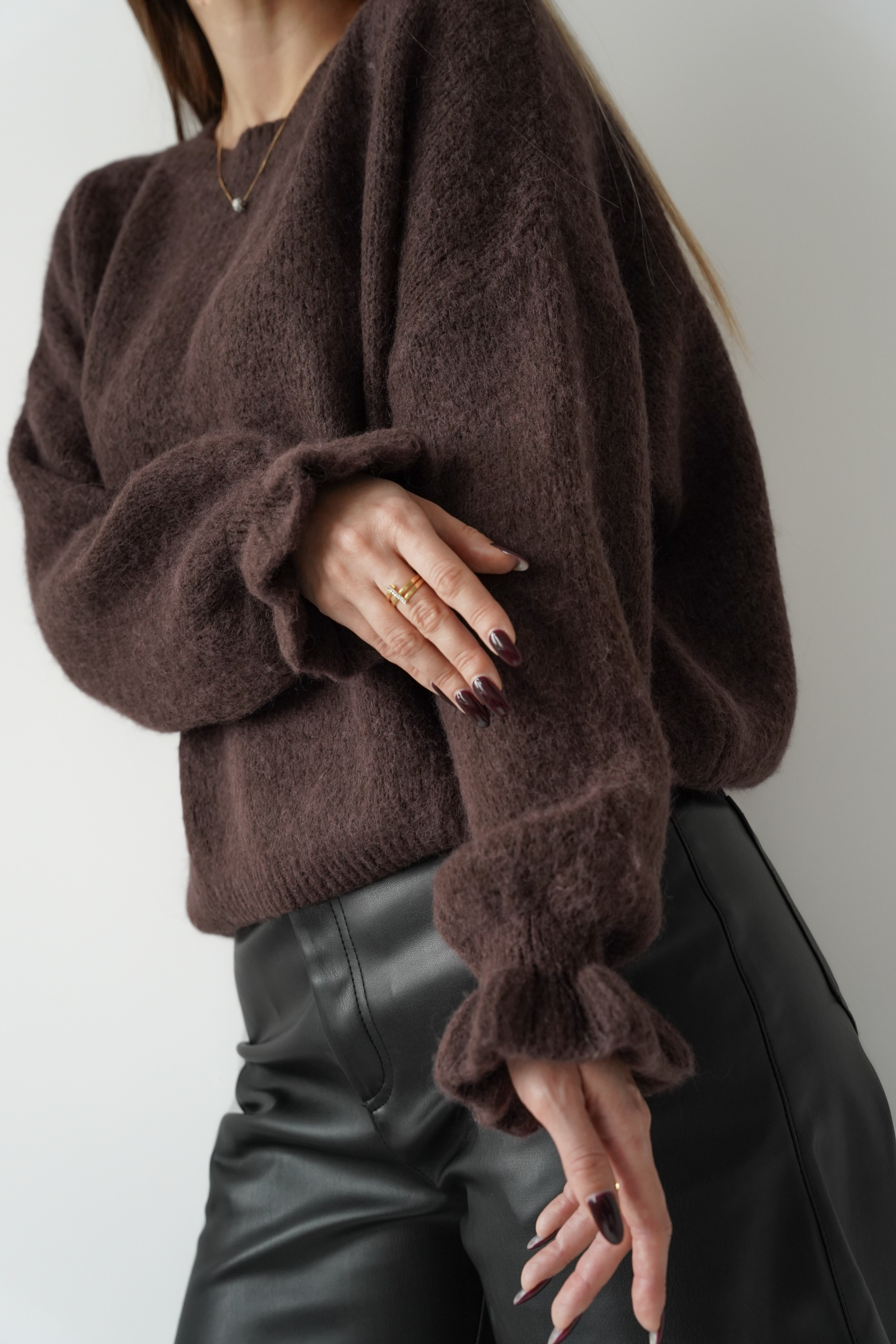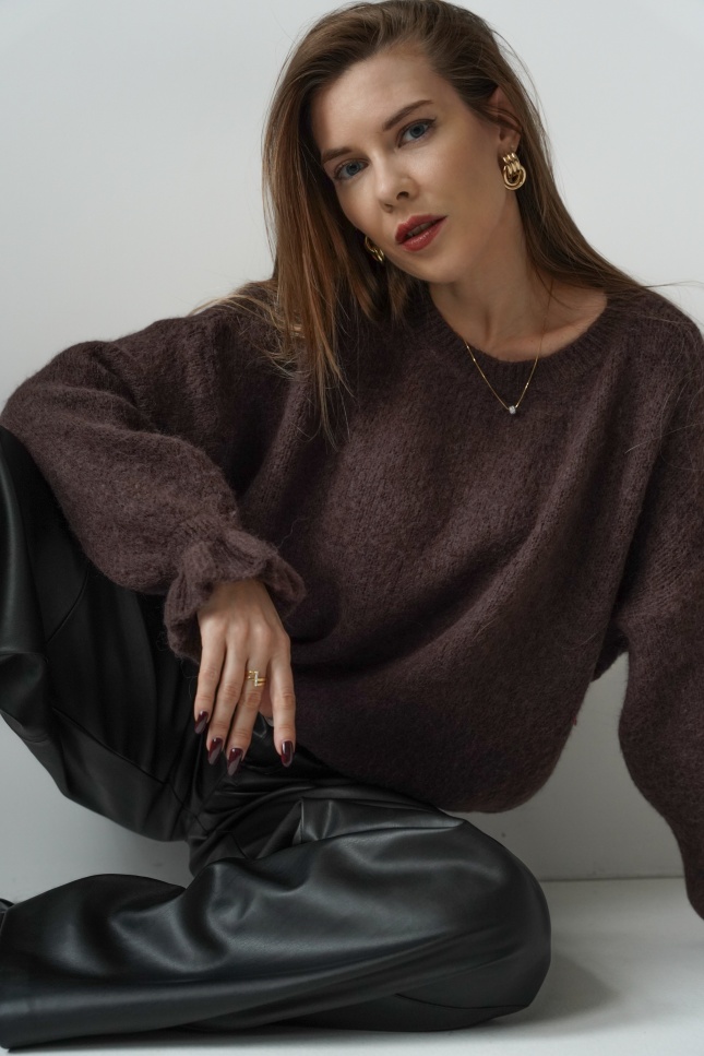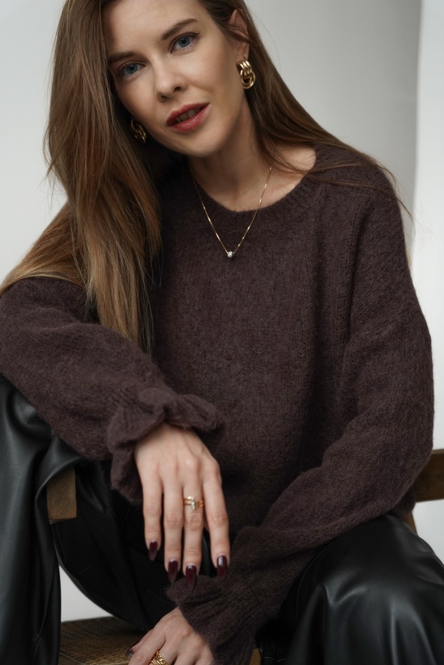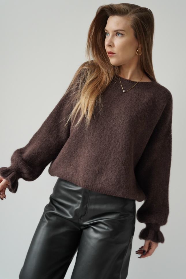 ‘Nuvia’ is a classic, feminine jumper made from luxurious baby alpaca and virgin wool yarn. Soft, light and exceptionally pleasant to the touch. The sleeves are finished with elasticated cuffs, creating a delicate frill that adds a romantic charm. Perfect for everyday and elegant outfits – from jeans to a satin skirt.