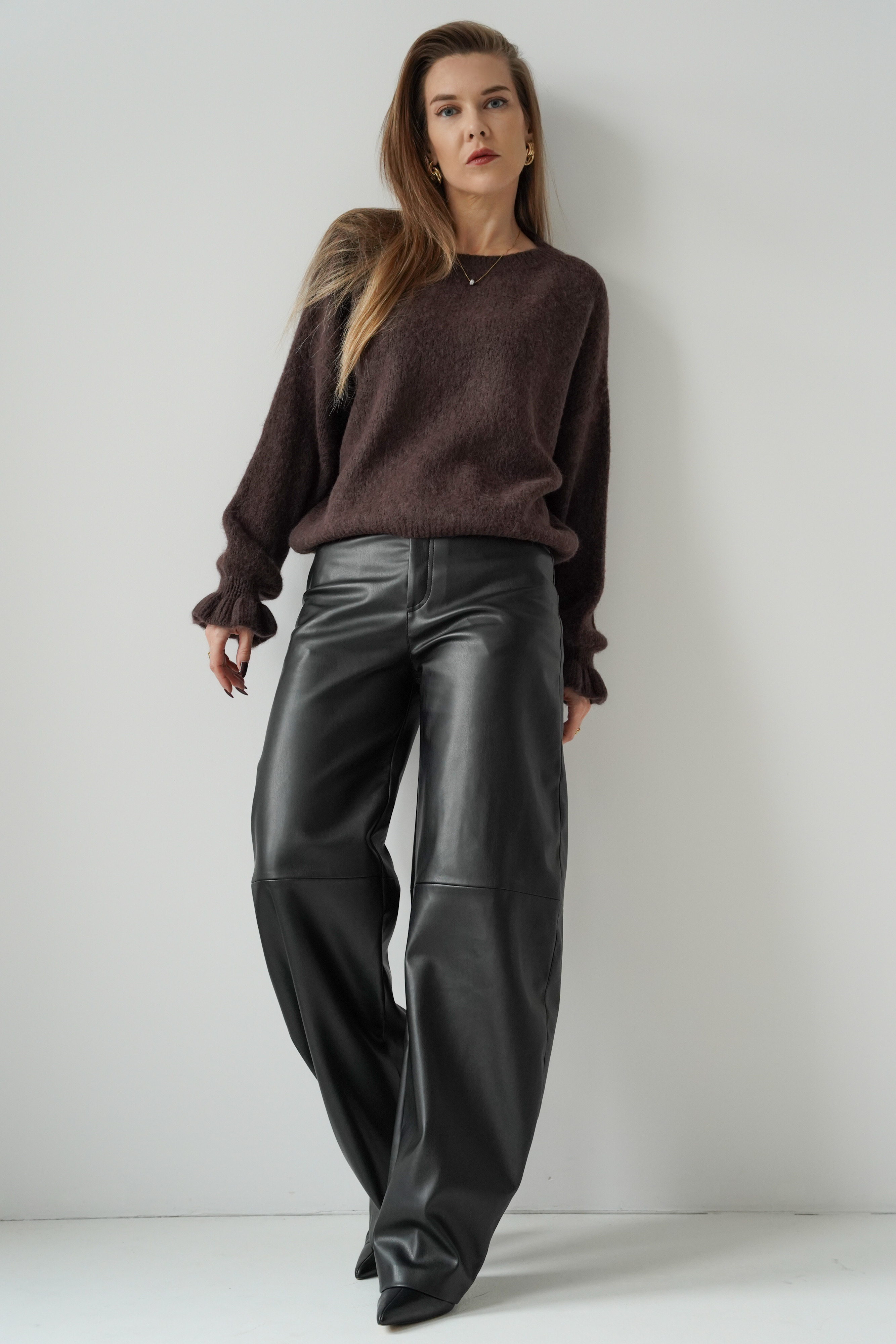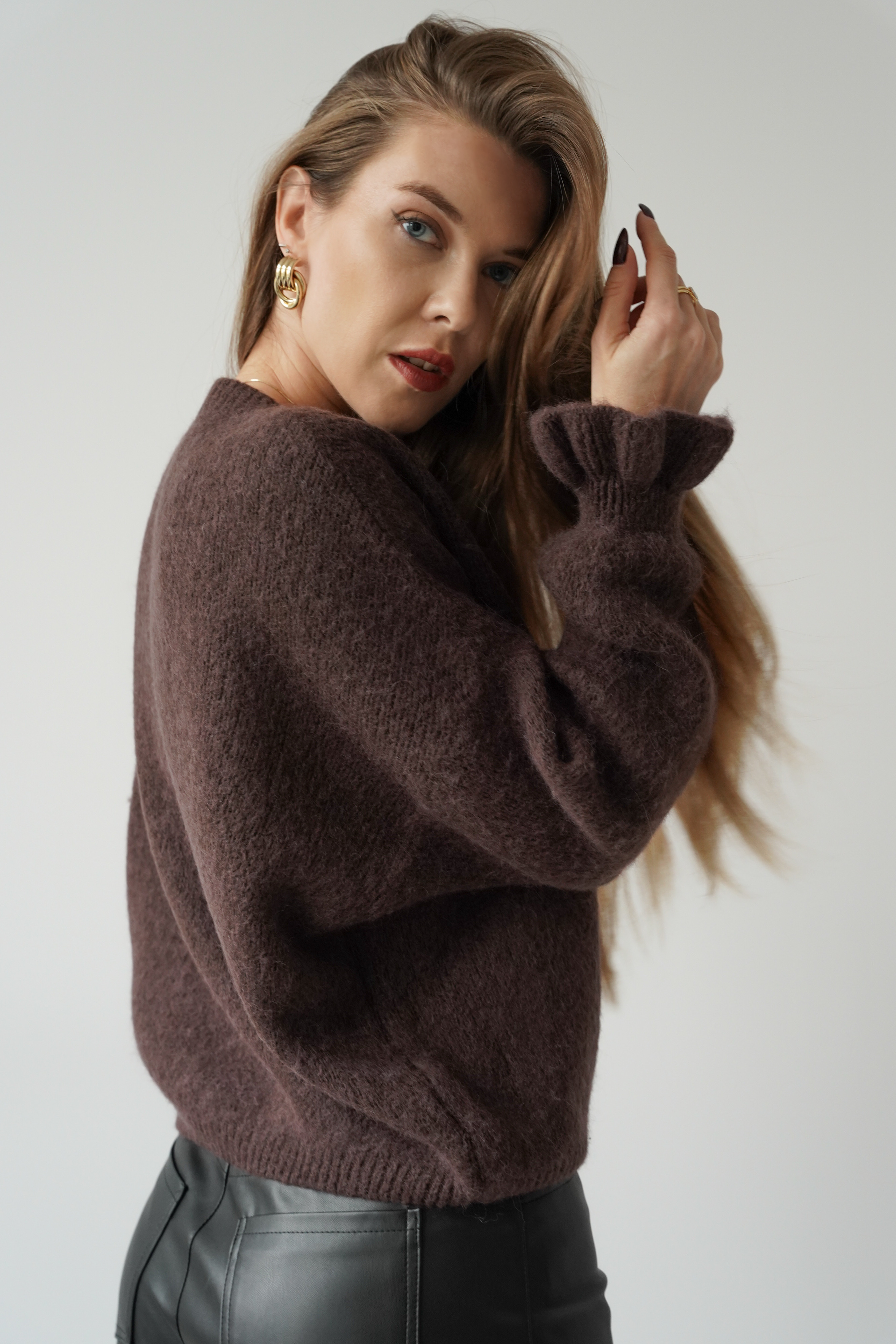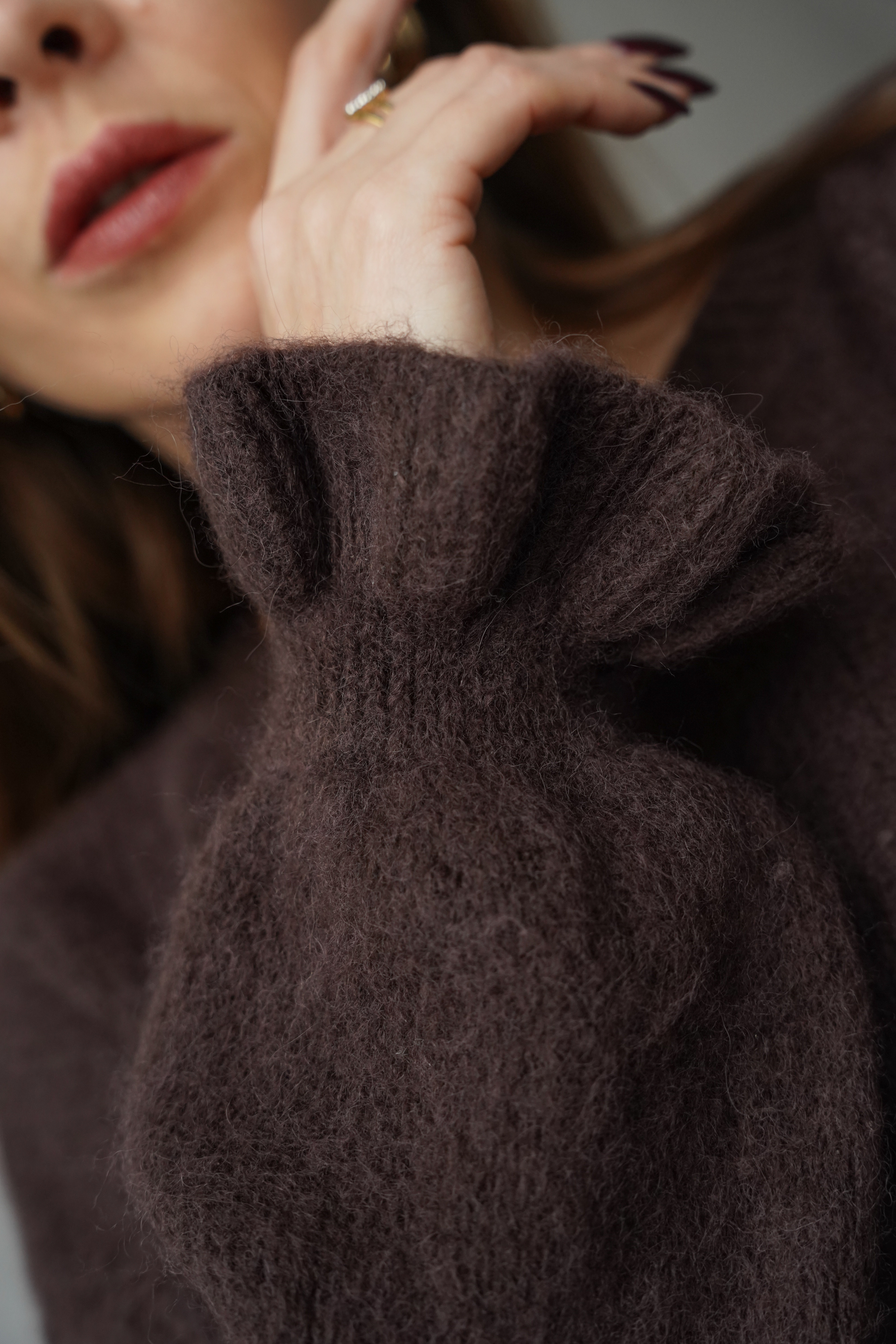 ‘Nuvia’ is a classic, feminine jumper made from luxurious baby alpaca and virgin wool yarn. Soft, light and exceptionally pleasant to the touch. The sleeves are finished with elasticated cuffs, creating a delicate frill that adds a romantic charm. Perfect for everyday and elegant outfits – from jeans to a satin skirt.