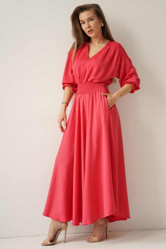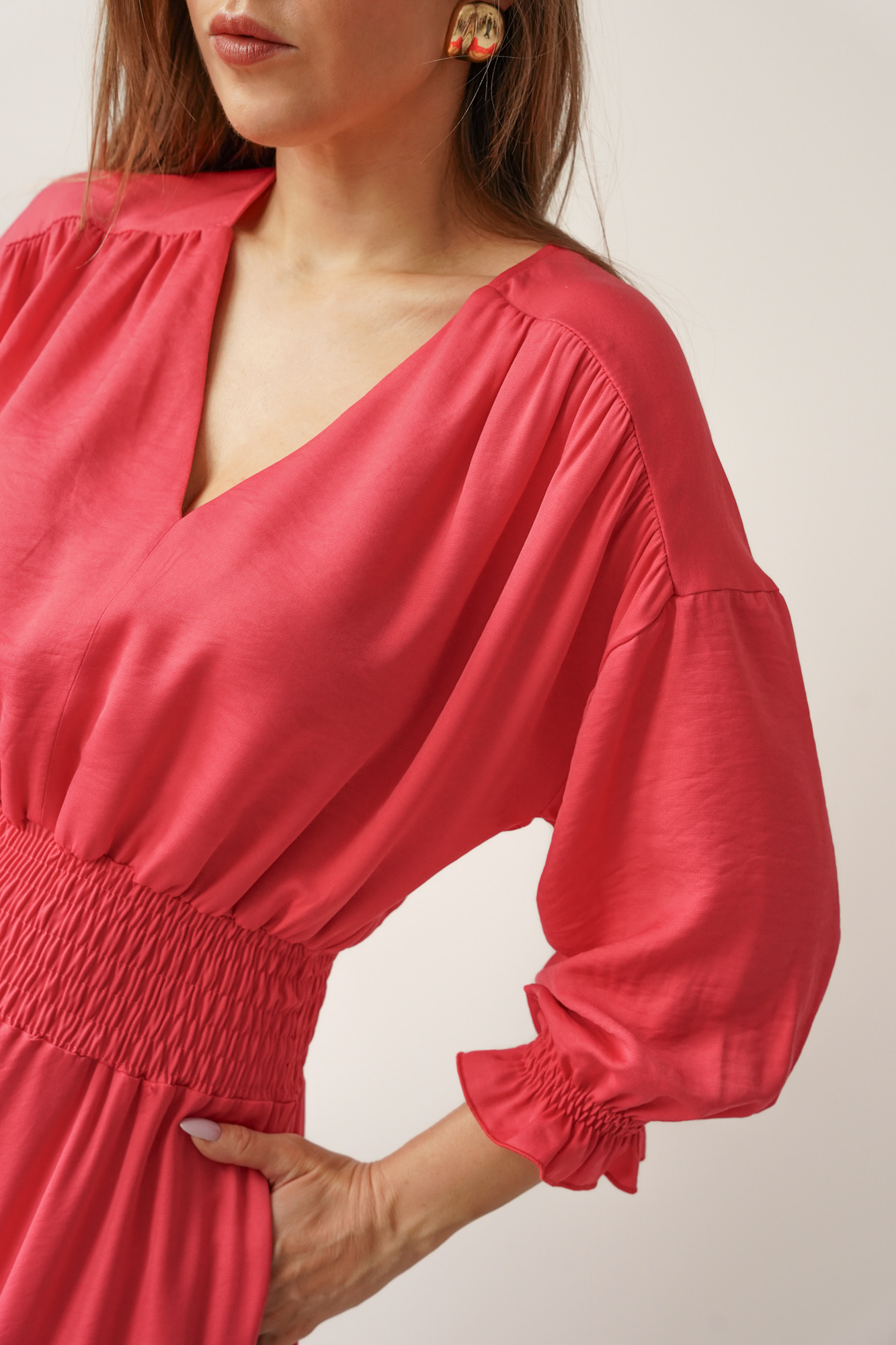 PALOMA is a feminine dress with a V-neckline and puffed sleeves, designed to emphasise the waist and move beautifully. Delicate elastic bands shape the figure, while the flared bottom adds lightness.