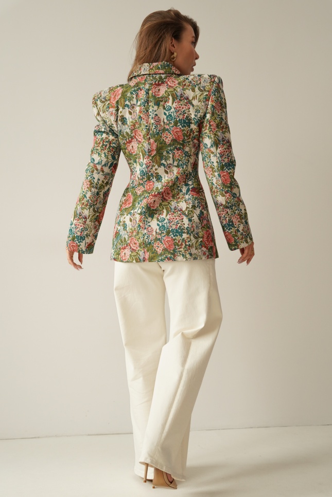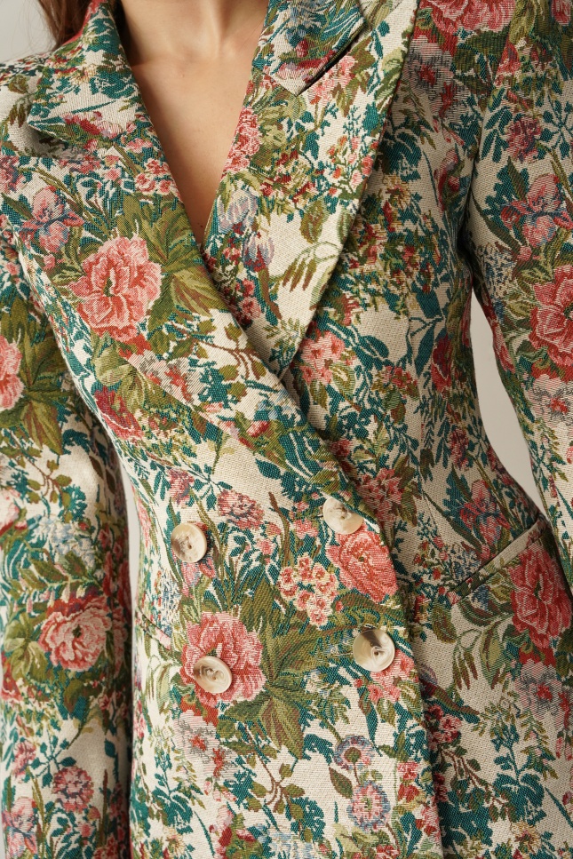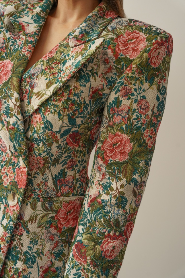 Made in a Polish sewing room from fabric containing 80% cotton, with an elegant floral pattern. A silhouette-shaping design, architectural form, timeless character. Perfect for both elegant and modern, casual styles.