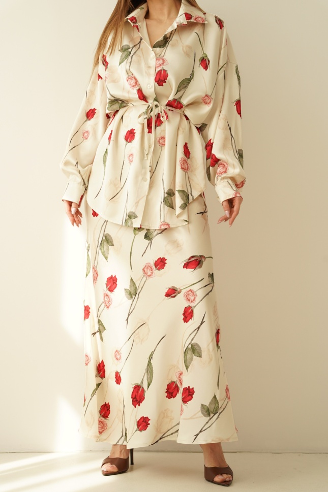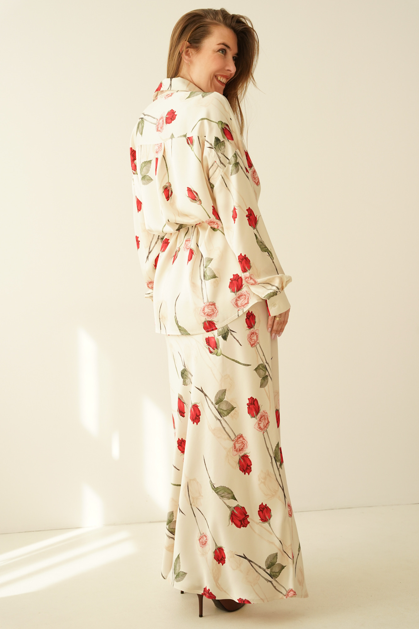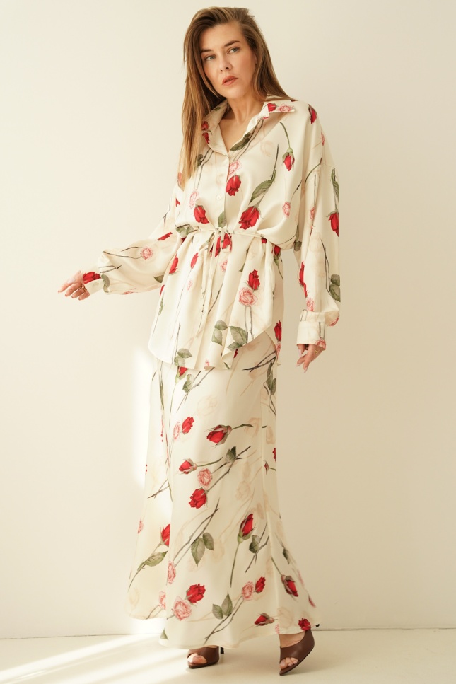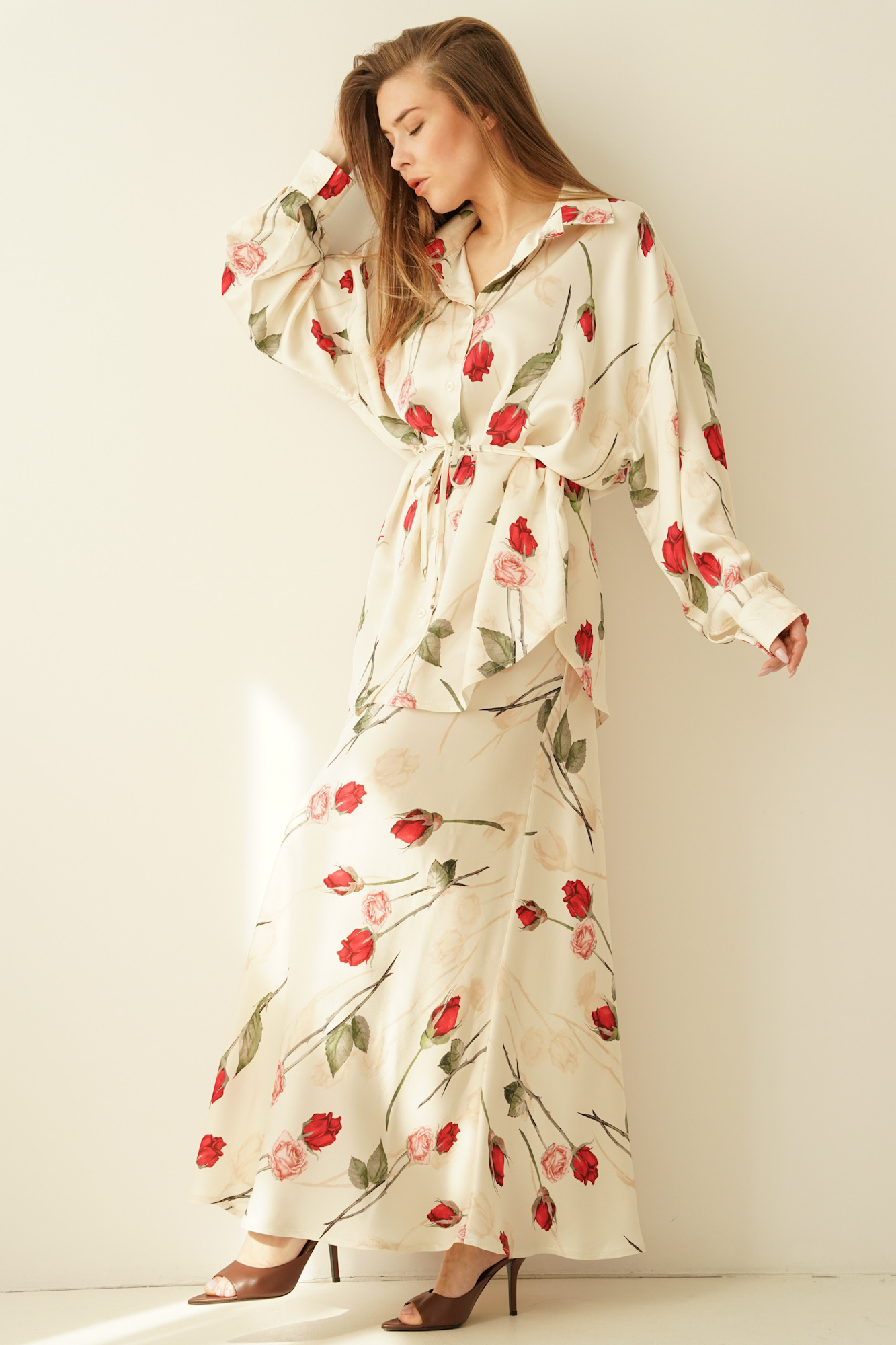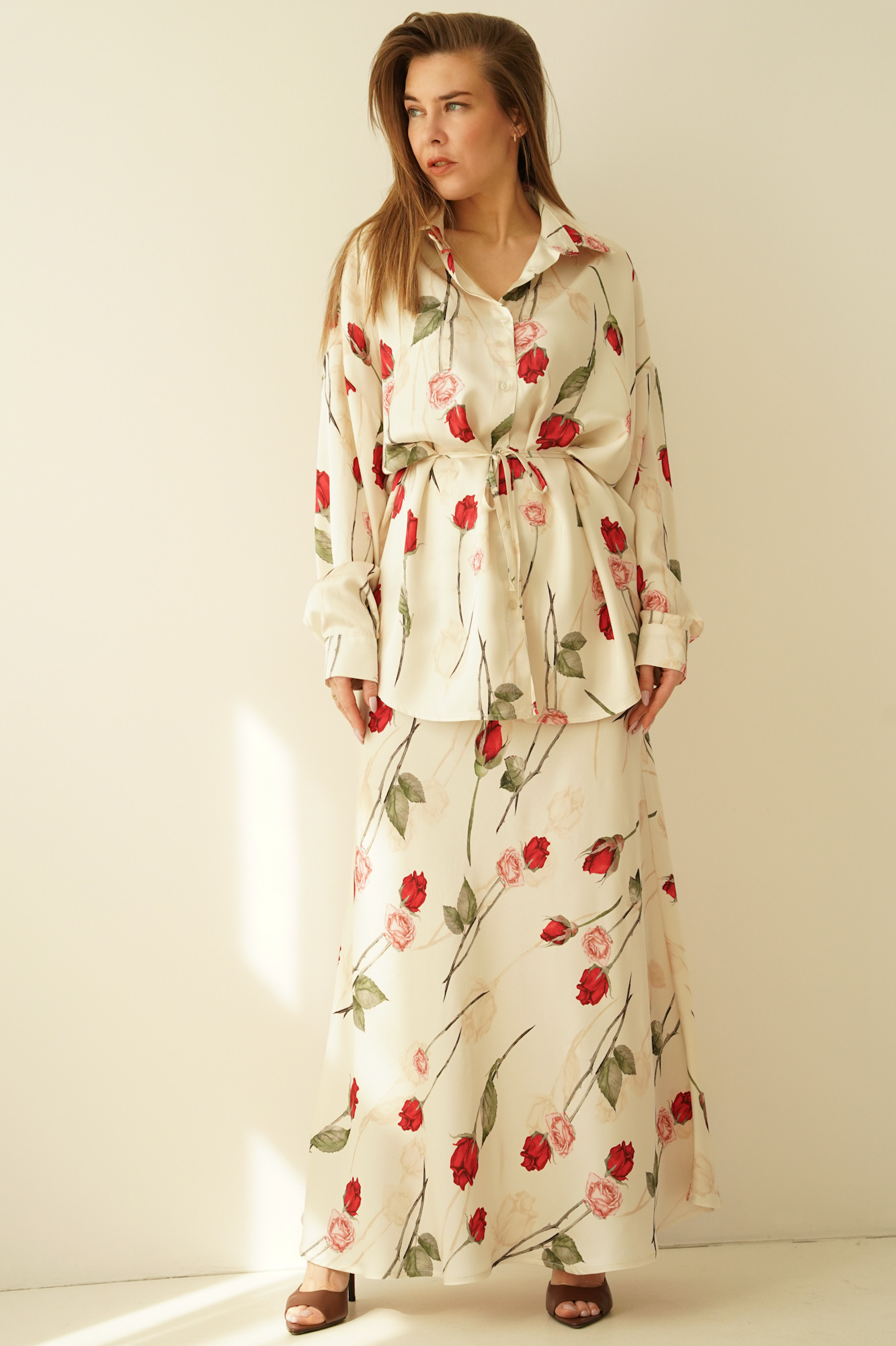 Women's shirt and maxi skirt set: Anais roses on light beige